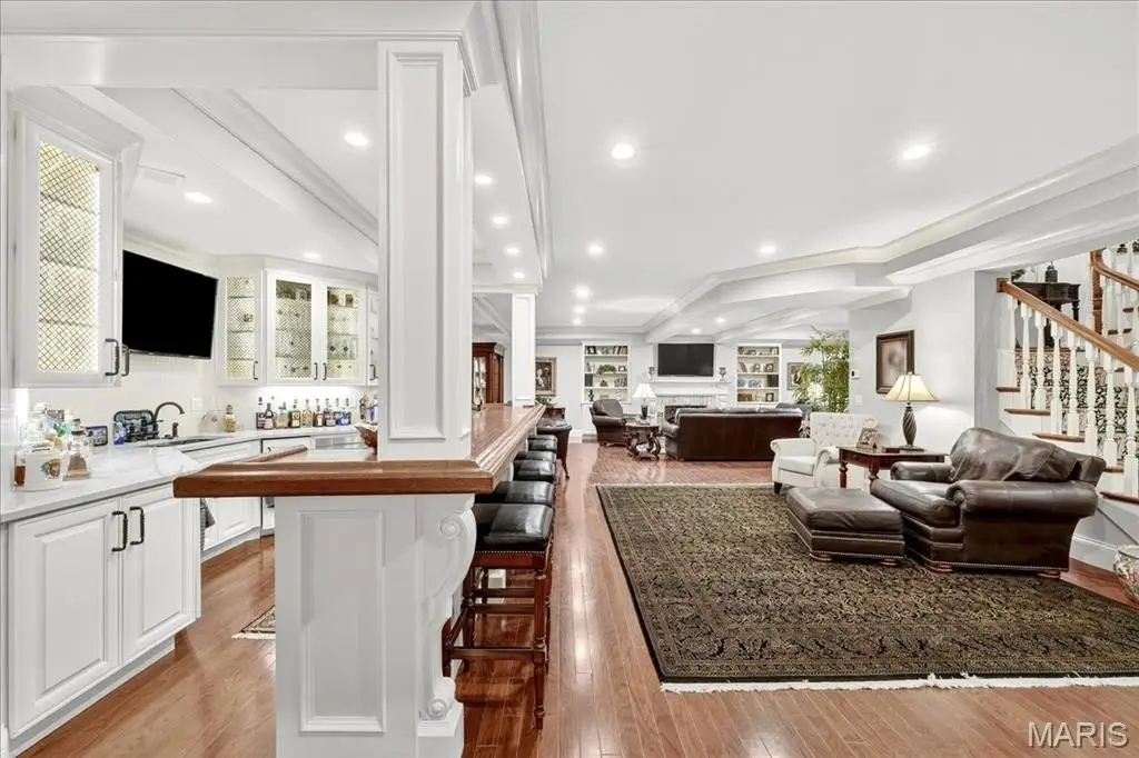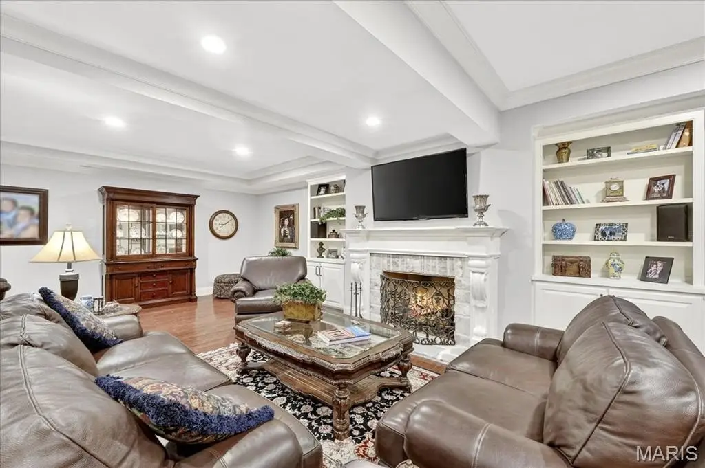 Experience timeless elegance in this custom-built estate with over 10,000 sq ft of refined living on a private 1.79-acre lot in Ladue. This home blends classic design with resort-style amenities. Rich hardwoods, soaring ceilings, and intricate millwork define the interiors. The main level boasts a luxurious primary suite with spa-like bath and private outdoor access. Four fireplaces, including one in the vaulted hearth room with exposed beams, add warmth and charm. The chef’s kitchen flows into open living areas designed for upscale entertaining. Outdoors, enjoy your own private resort with a large pool, lush landscaping, covered patios, and a full pool house with kitchen and bar—perfect for elegant soirees or relaxed gatherings. Upstairs offers a loft-style family room, spacious office, and guest suites. Six bedrooms, custom details & a layout built for luxury living, this is a rare chance to own a generational property in one of the area's most desirable locations.