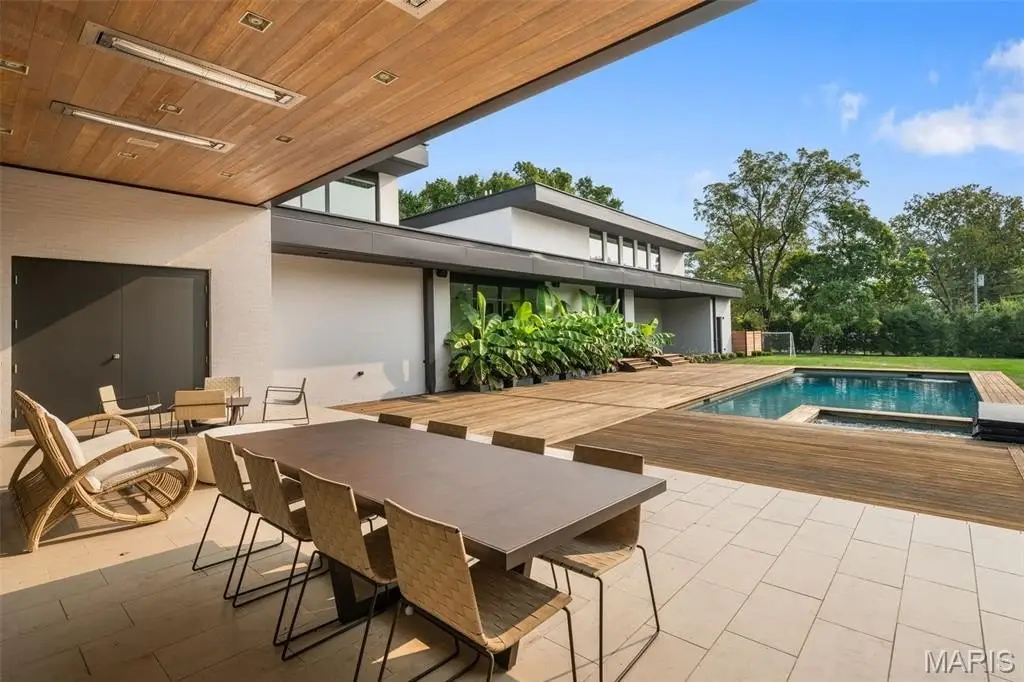 Secluded on a private lane in Ladue, this rare, 12-year-old modern architectural gem boasts over 10,000 sq ft with floor-to-ceiling windows flooding the home with natural light, accented by 14 ft ceilings and high-end finishes throughout. The sophisticated great room is perfect for entertaining, while the art gallery with bar area provides additional options for your guests. The brand new custom kitchen and walk-in pantry offer integrated appliances behind custom cabinetry. Cleverly separated from the entertaining spaces, the private family living area offers a tranquil retreat featuring a main flr luxury suite with sitting room and his/her closets. Find 4 bedrm suites and laundry on the 2nd level. The lower level showcases a 2-lane bowling alley, media rm, large rec room with wet bar and a bedrm suite. Walk out to the saltwater pool and covered patio with fire feature. An indoor half-court basketball/pickleball court is perfect for a pickup game. A 4-car garage, generator and more. An indoor half-court basketball/pickleball court is perfect for a pickup game. This home is a perfect setting for an art collection.