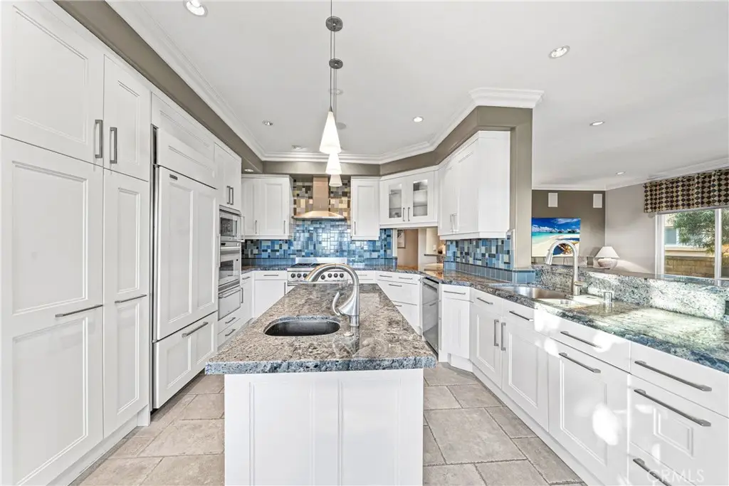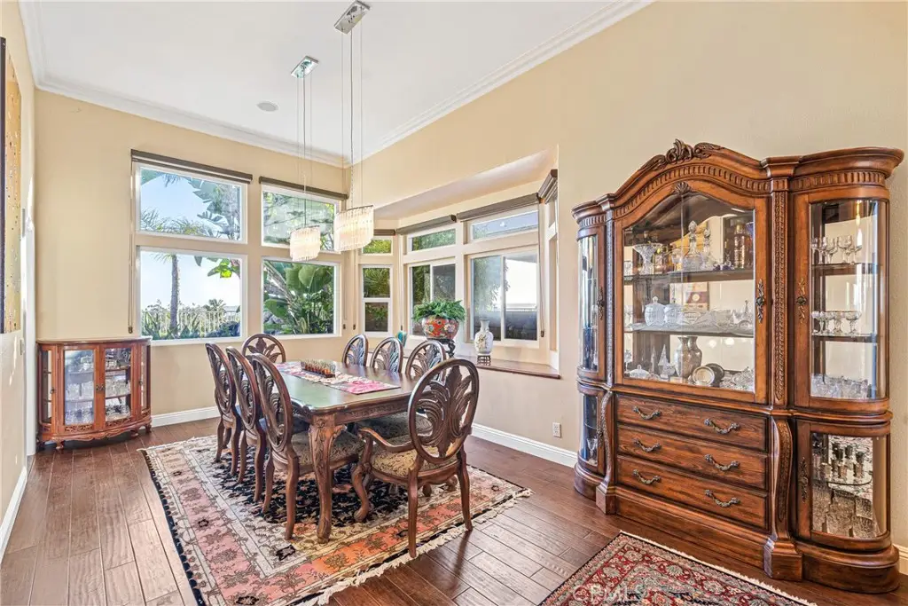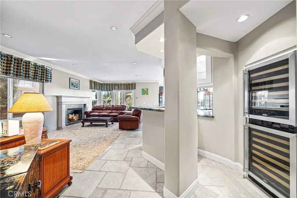 Showcasing unmatched luxury and sweeping bluff top views is this gorgeous residence which is situated at the heart of a quiet neighborhood cul-de-sac in the highly sought after hilltop enclave of Moulton Ranch in Laguna Hills. This is the one! With high-end finishes throughout, a downstairs ensuite bedroom, a custom hardscape view yard with an in-ground spa with waterfall and a truly enviable floor plan don't miss this chance. Starting with great curb appeal, including the custom stonework hardscape, mature planting beds and a grassy lawn enter through stunning custom French doors into a soaring vaulted ceilings foyer and formal living room. With great light from large yard view windows, a focal point fireplace - the first of three in the home - and ample space to spready out the formal living room is open to the formal dining room with large patio view windows which flood these formal spaces with a wealth of afternoon natural light. Off of the dining room is the chef's kitchen which has upgraded cabinetry, top-tier stainless steel appliances, a central island with possible bar seating and a dedicated task sink and a bar peninsula that extends all the way to an adjoining dry bar with stacked wine refrigerators. The kitchen also features a sizeable casual eat in area and view windows out to the patio. Sharing the great room vibe is an oversized family room which has an abundance of space, the second hearth, and is open to the dry bar making this the perfect place to entertain. With French doors out to the patio deck this space offers true indoor/outdoor living. A downstairs ensuite bedroom with step in shower, a guest half bath and an inside laundry room completes the lower level. Upstairs is a large second family room space and 3 additional bedrooms that start with the spacious primary suite which has a stunning spa like ensuite with a custom dolphin shower enclosure, granite counters, a privacy water closet door, a walk in closet and great light. A cozy third fireplace and a private panoramic view deck complete this must-see primary retreat. Two additional bedrooms and an updated guest bath complete the upper level. Featuring an attached 3 car garage, a 3 car driveway, and countless upgrades, make sure you see this home! Minutes from a local neighborhood park, great schools, shopping, dining and commuting options, the beach and everything South County has to offer don't miss this opportunity!