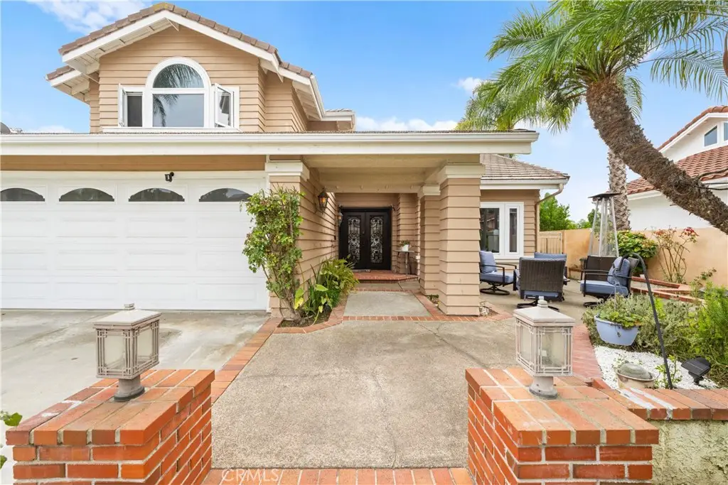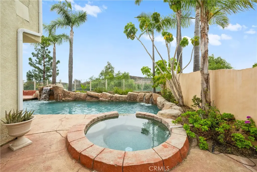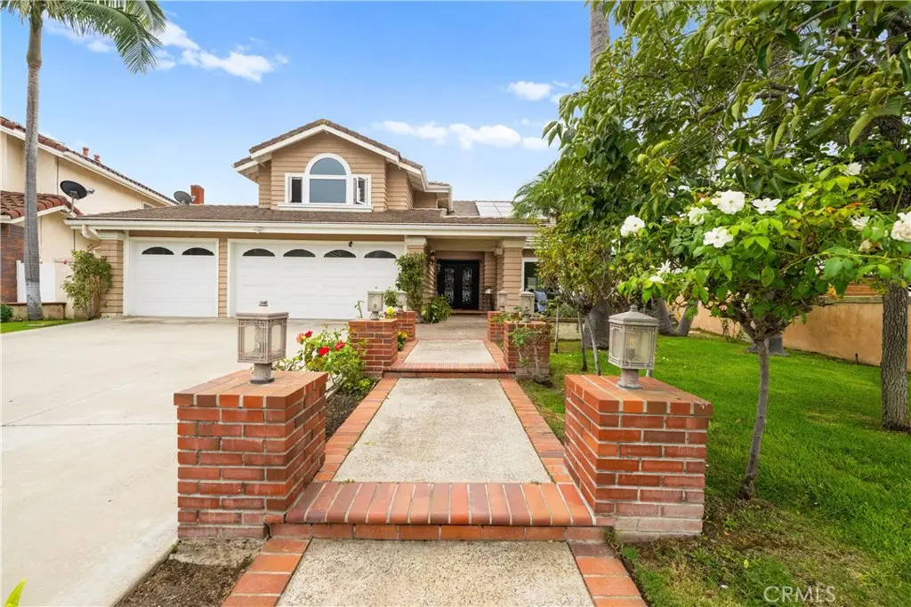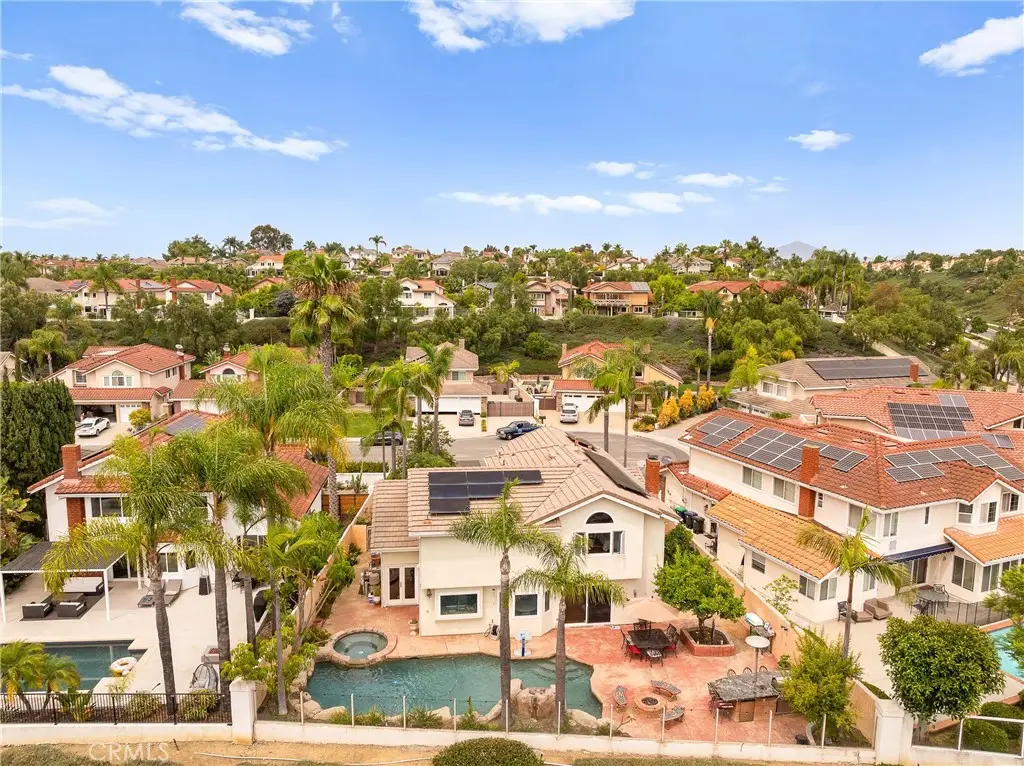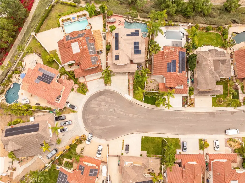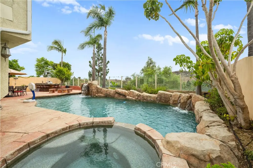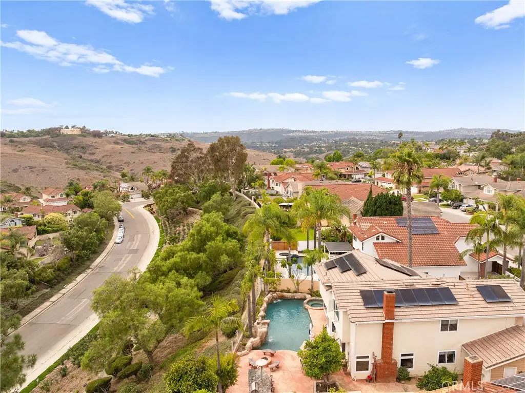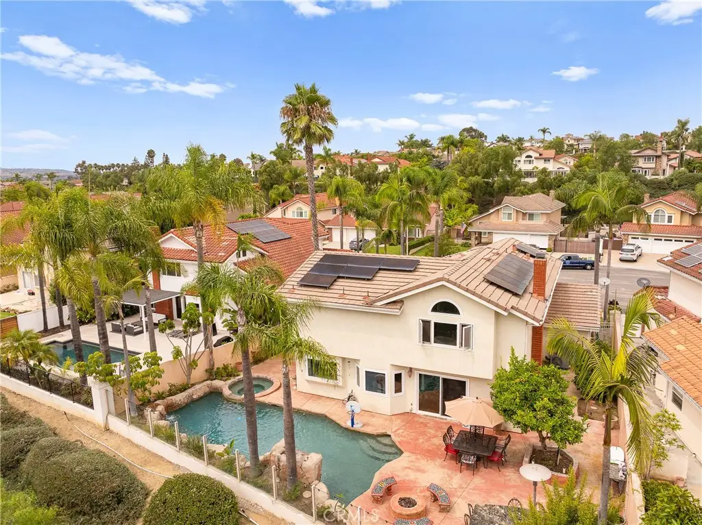 YOUR OWN PRIVATE OASIS AWAITS! Perfectly placed at the end of a quiet cul-de-sac, this property offers a massive lot with mountain and city-light vistas from the primary suite. Whether you're hosting gatherings or enjoying quiet evenings, the setting delivers both privacy and a delightful rock pool complete with waterfalls and a large hot tub. You even have fully paid solar and a new HVAC system with this gem of a home! Step through the ornate iron double doors into a dramatic entry with soaring ceilings that immediately set the tone. To one side, the formal living and dining rooms welcome elegant entertaining. To the other, a warm and inviting family room with a fireplace creates the ideal spot to unwind while soaking views of the backyard and hills beyond. The kitchen is designed for both everyday living and culinary adventures, featuring a sunny breakfast nook, generous counter space, rich cabinetry, granite counters, and premium stainless-steel appliances--including a six-burner cooktop, double oven, and oversized refrigerator. Outdoors, the backyard is nothing short of a resort escape--a custom pool with cascading waterfalls, relaxing spa, built-in BBQ, and tropical landscaping accented by tall palms. Fruit trees flourish throughout the property, including lemon, pomegranate, and persimmon. Inside, thoughtful upgrades enhance the home: newer windows, engineered wood floors, marble-tiled baths, and crown molding details throughout. A main-level bedroom and bath add valuable flexibility, while upstairs the primary suite and several rooms enjoy incredible views. Parking is plentiful with your new 3 car garage and extra deep 3 car driveway, and the garage includes an EV charger as well. With low HOA fees, low taxes, award-winning schools nearby, and just minutes to Southern California's finest beaches, this home blends comfort, elegance, and convenience in one unforgettable package.