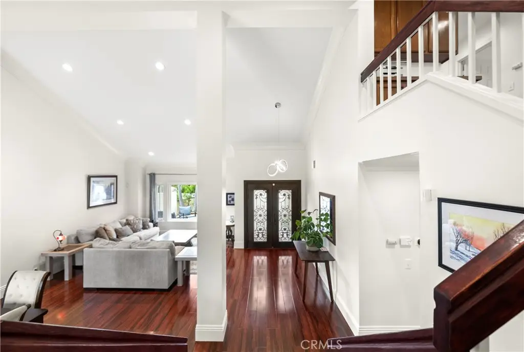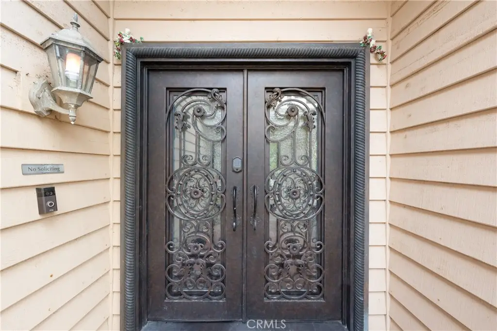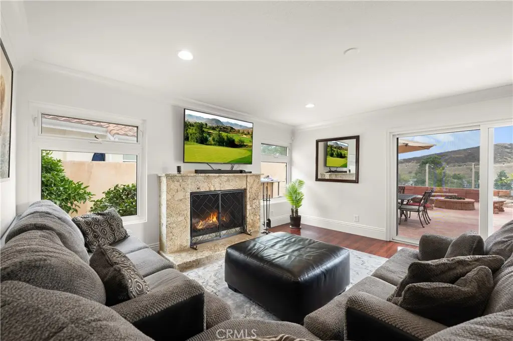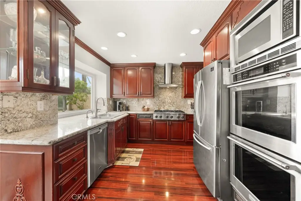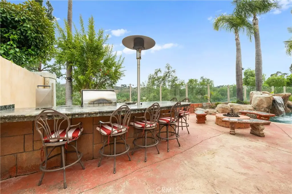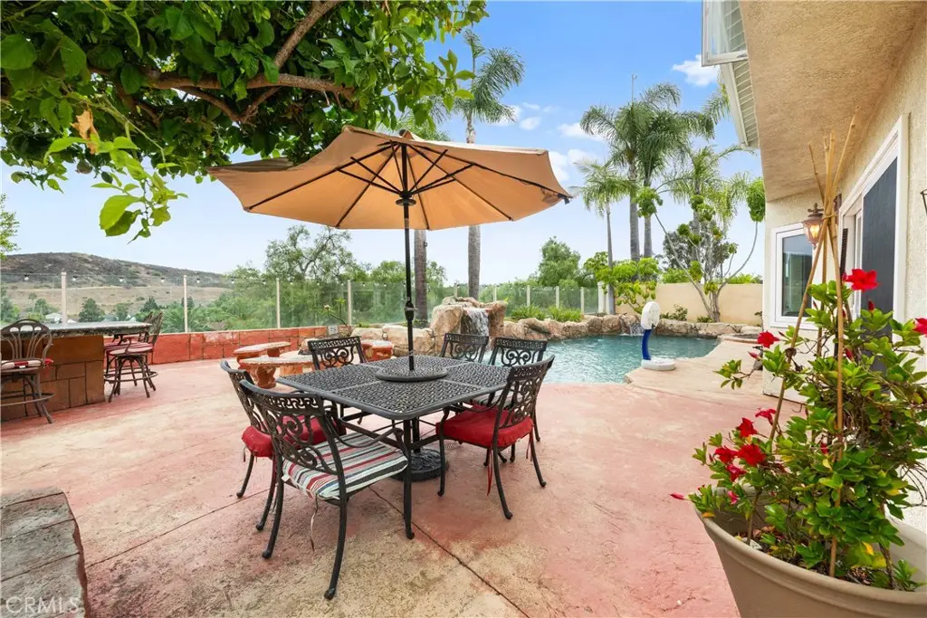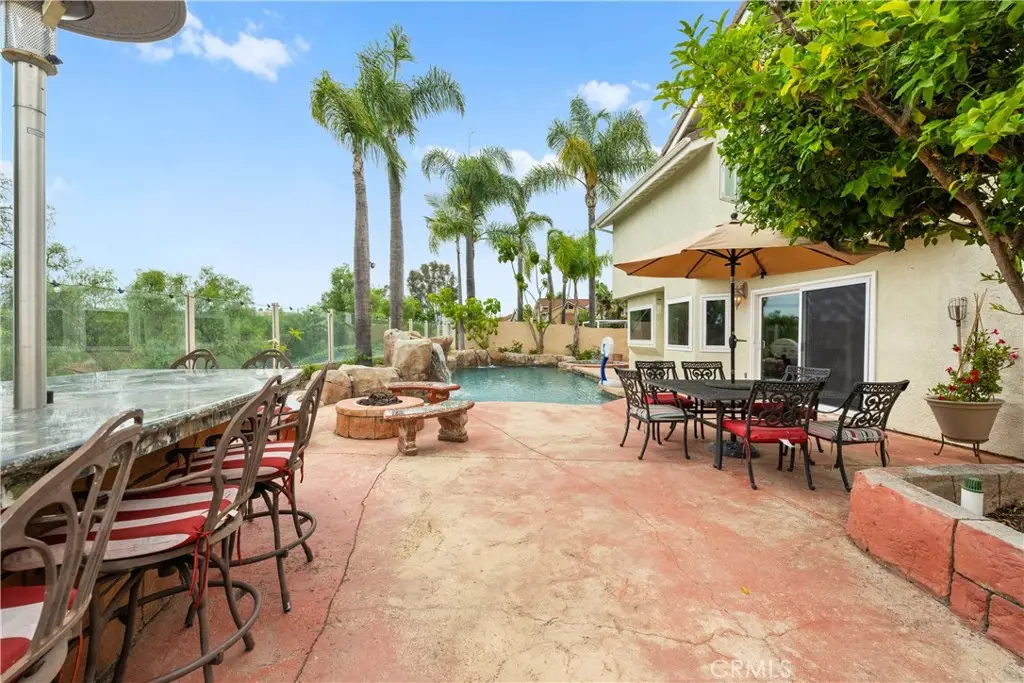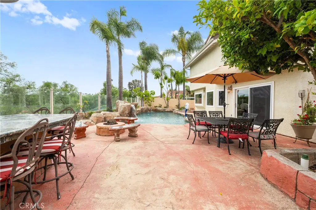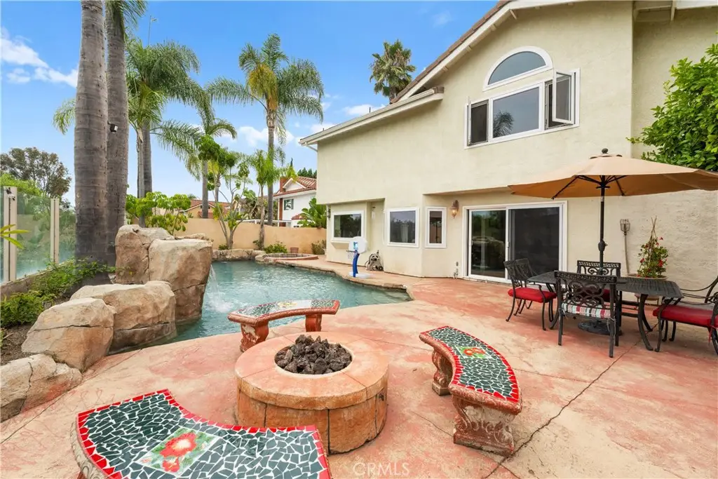 YOUR OWN PRIVATE OASIS AWAITS! Perfectly placed at the end of a quiet cul-de-sac, this property offers a massive lot with mountain and city-light vistas from the primary suite. Whether you're hosting gatherings or enjoying quiet evenings, the setting delivers both privacy and a delightful rock pool complete with waterfalls and a large hot tub. You even have fully paid solar and a new HVAC system with this gem of a home! Step through the ornate iron double doors into a dramatic entry with soaring ceilings that immediately set the tone. To one side, the formal living and dining rooms welcome elegant entertaining. To the other, a warm and inviting family room with a fireplace creates the ideal spot to unwind while soaking views of the backyard and hills beyond. The kitchen is designed for both everyday living and culinary adventures, featuring a sunny breakfast nook, generous counter space, rich cabinetry, granite counters, and premium stainless-steel appliances--including a six-burner cooktop, double oven, and oversized refrigerator. Outdoors, the backyard is nothing short of a resort escape--a custom pool with cascading waterfalls, relaxing spa, built-in BBQ, and tropical landscaping accented by tall palms. Fruit trees flourish throughout the property, including lemon, pomegranate, and persimmon. Inside, thoughtful upgrades enhance the home: newer windows, engineered wood floors, marble-tiled baths, and crown molding details throughout. A main-level bedroom and bath add valuable flexibility, while upstairs the primary suite and several rooms enjoy incredible views. Parking is plentiful with your new 3 car garage and extra deep 3 car driveway, and the garage includes an EV charger as well. With low HOA fees, low taxes, award-winning schools nearby, and just minutes to Southern California's finest beaches, this home blends comfort, elegance, and convenience in one unforgettable package.