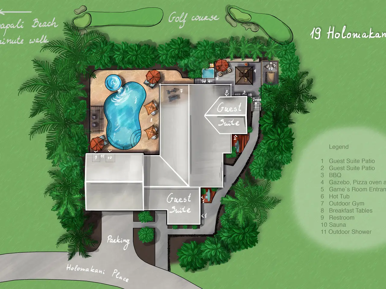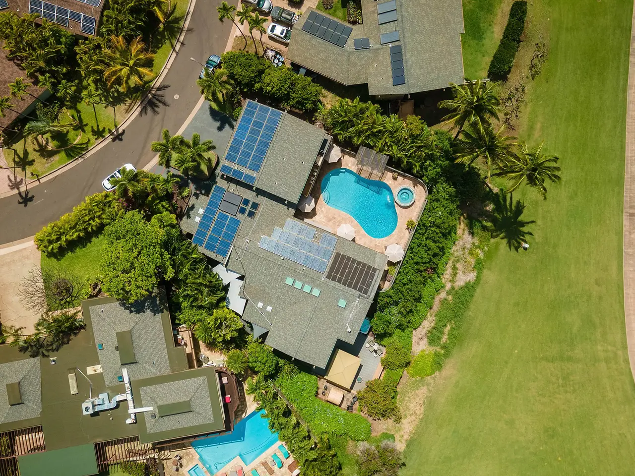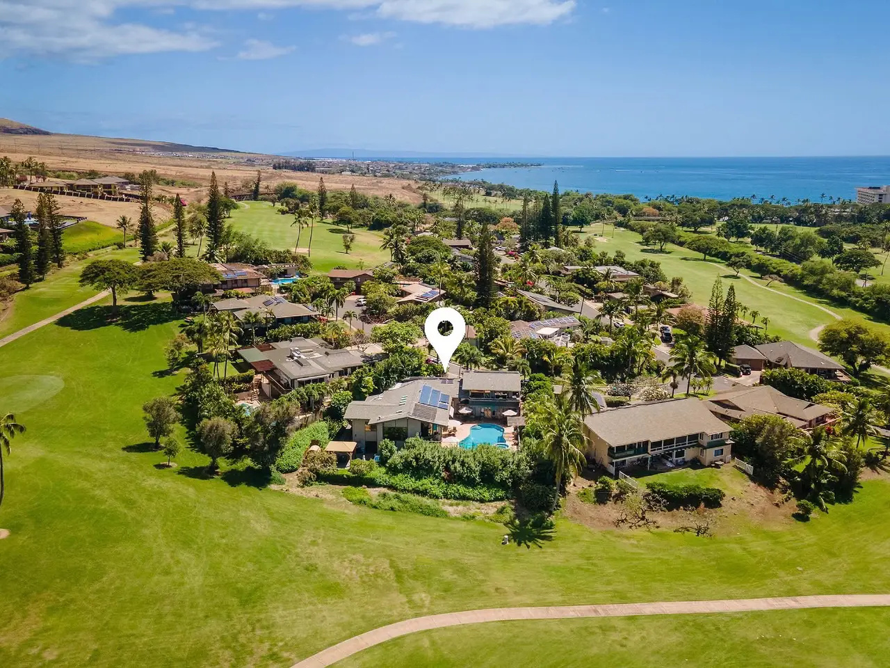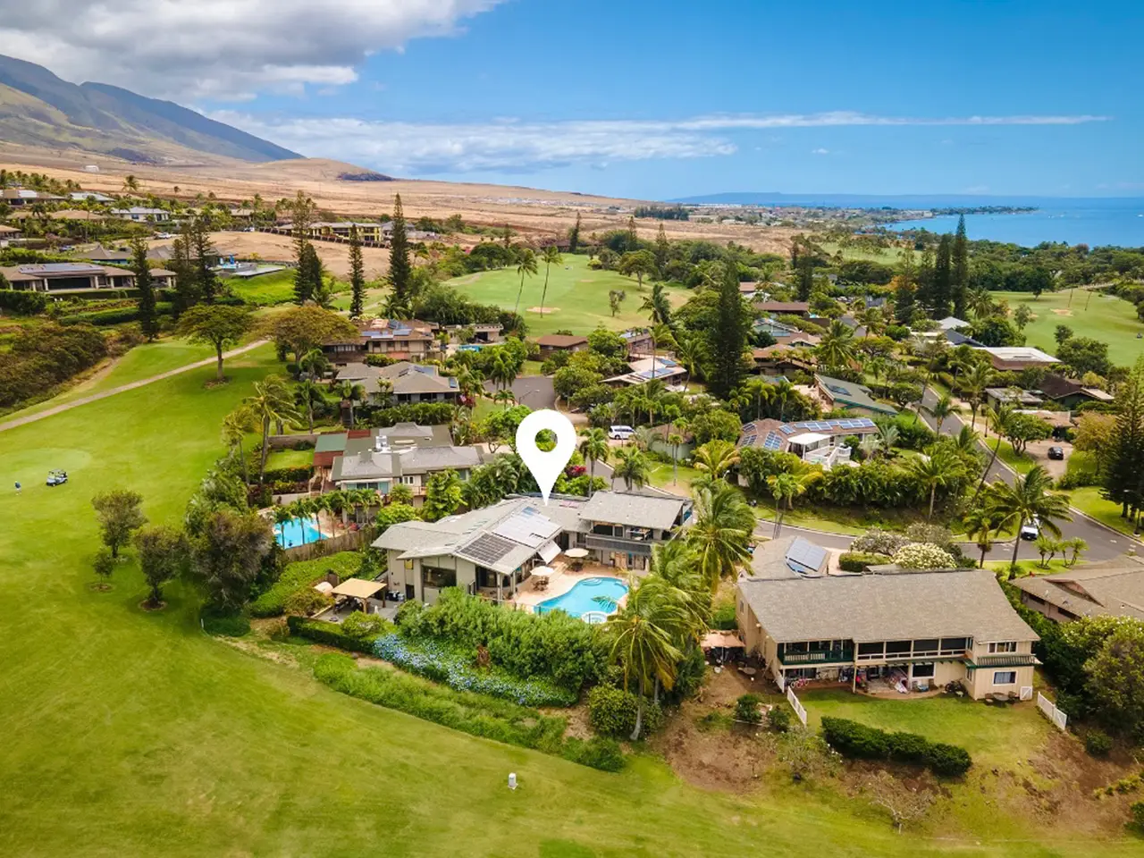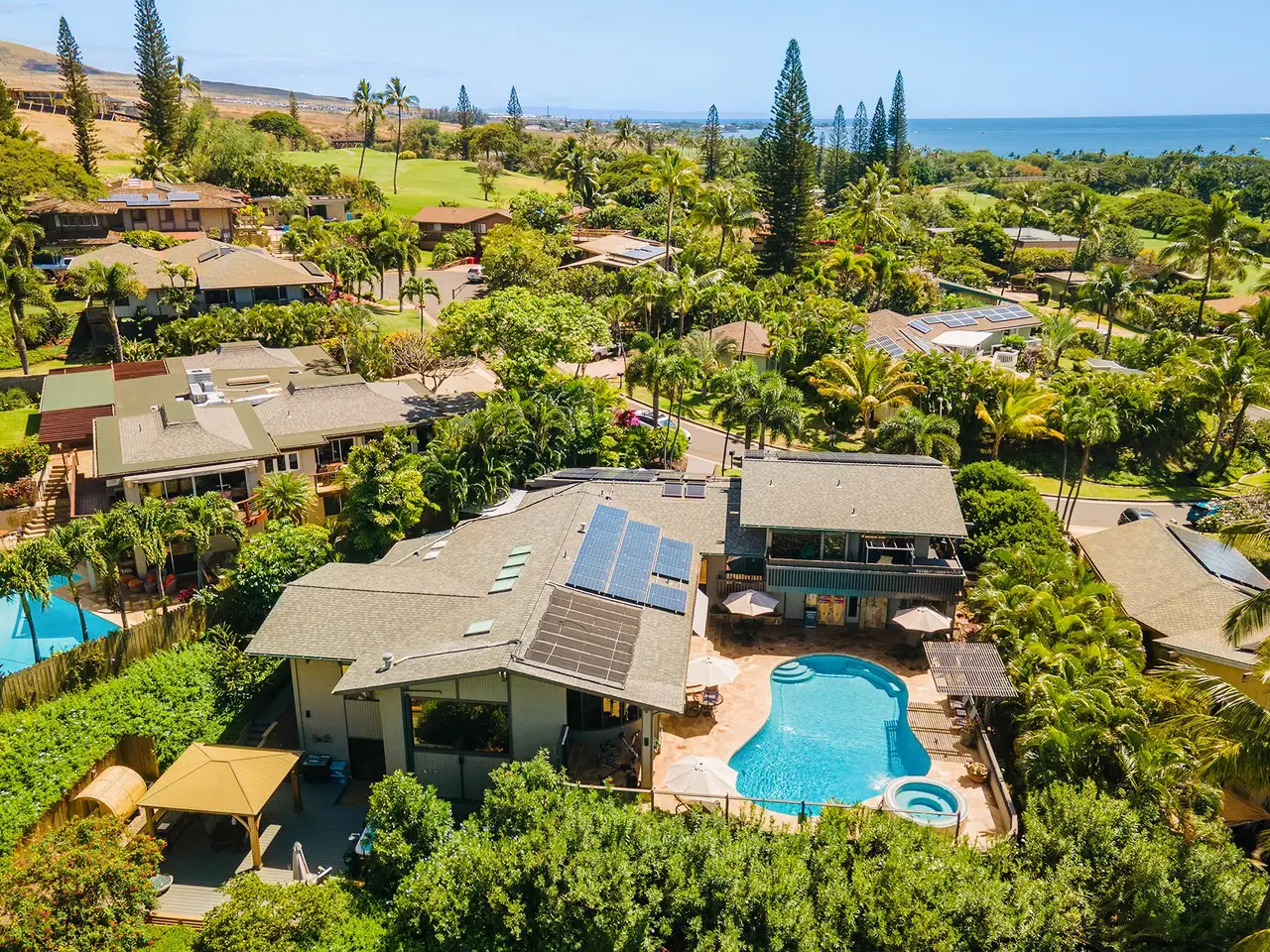 Welcome to 19 Holomakani Place, a beautiful 6-bedroom, 5-bathroom estate in the heart of Ka'anapali, Maui. With over 4,000 square feet of luxurious living space, this exceptional home offers the perfect blend of island style and comfort. Enjoy breathtaking golf course views of the Par 3, 14th hole of the Ka'anapali Kai Course from multiple vantage points, providing a serene backdrop for daily living. Walk or take your golf cart to the beach and enjoy Maui's stunning sunsets. The open-concept layout features a spacious great room with vaulted ceilings, an inviting kitchen, and expansive dining area—ideal for both intimate family gatherings and large-scale entertaining. Vast picture windows flood the home with natural light, creating an inviting, airy atmosphere. Enjoy unparalleled privacy and relaxation in one of the 3 primary en-suites, with two located on the main floor and one upstairs. The upstairs primary suite is a true sanctuary, complete with a spa-like bathroom and private lanai. This meticulously maintained home is an entertainer's dream with over 3,000 square feet of outdoor space featuring a heated 45,000-gallon pool, gazebo, recreation room and sauna, making it perfect for hosting friends, family or guests. Enjoy significant energy savings in this energy-efficient home with 68 owned PV solar panels on net metering and a radiant solar heating system for the pool. Over the past 5 years, operating as a Bed & Breakfast, this home has undergone a major, fully-permitted renovation and expansion, ensuring that no detail has been overlooked. With only 35 homes in this exclusive resort community, 19 Holomakani Place offers the convenience of being just minutes from Maui's world-famous Ka'anapali Resort, while providing the comfort and tranquillity of a single-family home. Don't miss this rare opportunity to live in one of Maui's most desirable locations.