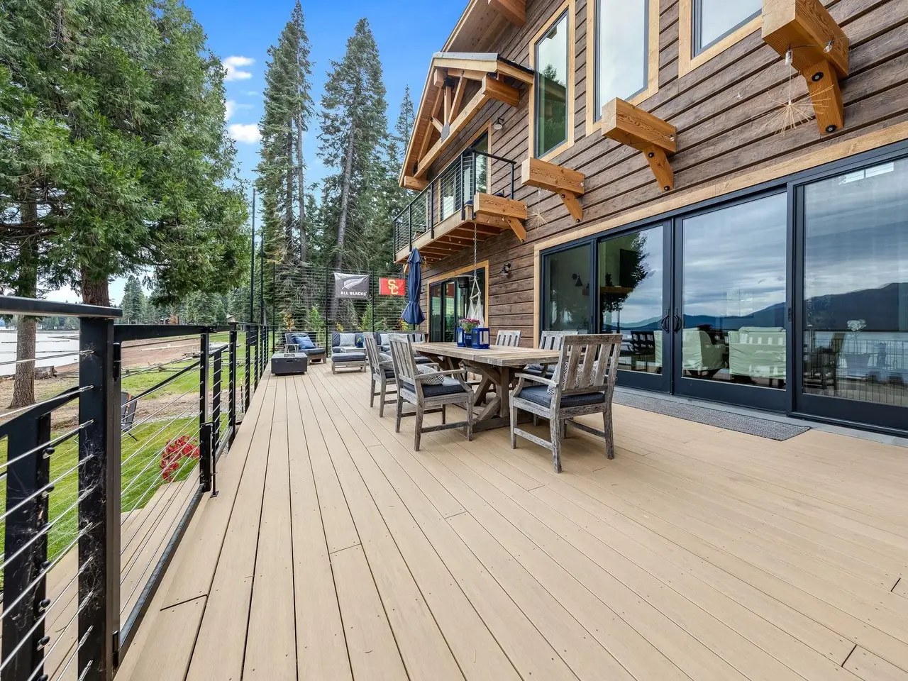 Located on the beautiful shores of Lake Almanor, this stunning lakefront estate offers wonderful modern design blended with tasteful mountain accents. The home sits on almost a half acre of gentle sloping land leading to the waters edge. A full 6 bedroom and 6 and one half baths including the guest house. Main house offers 3000 square feet of living space and boasts 22 foot ceilings with wonderful natural light. Well appointed kitchen would make any top chef proud. Magnifica Porcelain counter tops and Luxury wide vinyl flooring Throughout kitchen and living room. Oversized island allows for plenty of seating for the entire family and friends. Wonderful eat-in breakfast nook overlooking the expansive deck with lake and mountain views. Large family area located behind the living room could be converted to a separate master suite on the main level if so desired. Each bedroom in the main house offers its own private bath. Closet space has been cleverly designed to maximize storage area. Guest house offers a large bunk room downstairs with full bath. Upstairs boasts a full kitchenette along with 2 additional bedrooms and full bath. Oversized garage with 14' door height to accommodate all of the water toys and vehicles. Entire home and guest house offers custom concrete siding for maximum fire retardant and added insulation. Central heat and air conditioning throughout both the house and guest house. Huge lakeside composite deck allows one to soak in the expansive views of Dyer Mountain and the crystal blue Lake Almanor waters. Large lakeside grass area is ready for all the summer activities accompanied by your own sandy beach to the waters edge. Head on down to the custom aluminum floating dock and hit the water with all the summer toys. Two buoys included. Come enjoy year-around living in this magical mountain retreat.