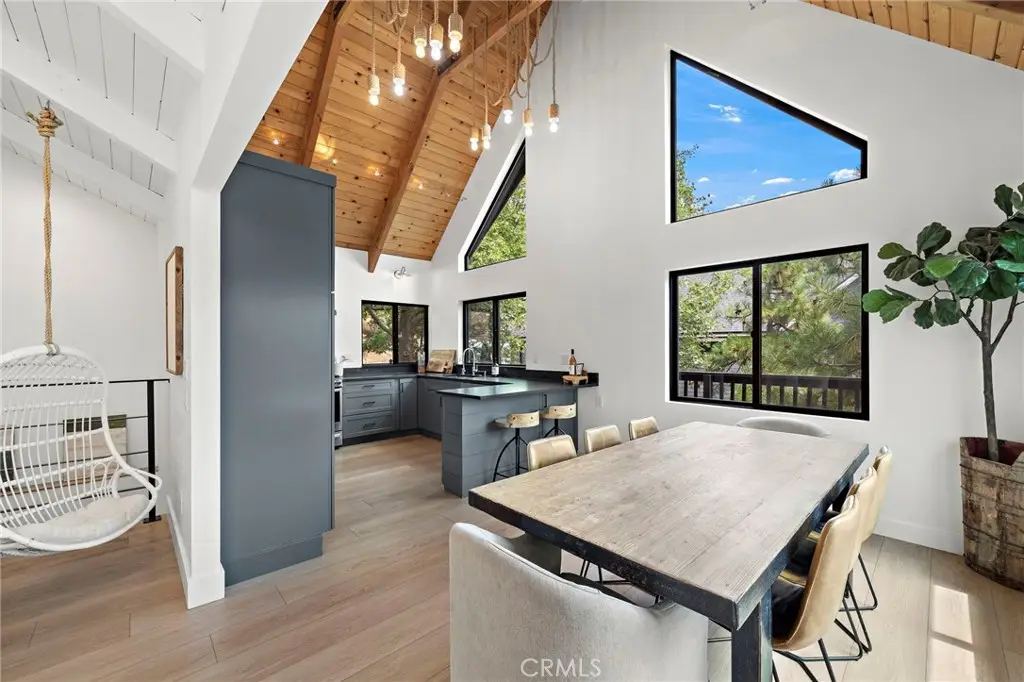 This stunning 4-bedroom, 3.5-bath mountain retreat combines modern upgrades with timeless lodge-style charm, offering captivating lake views from nearly every window. Thoughtfully remodeled in 2020-2021, the home features a bright open floor plan perfect for both comfort and entertaining. The main level showcases a dramatic great room with vaulted ceilings, expansive windows, recessed lighting, and a cozy gas fireplace that opens to a large entertainer's deck. The remodeled kitchen is a chef's dream with stainless steel appliances including a refrigerator, shaker-style cabinetry, pantry with pullout shelves, granite counters, peninsula with seating, and large windows framing the view. Two primary suites with spa-inspired baths--one on the main level and another on the lower level--provide privacy and flexibility, while two additional bedrooms and a spacious family room with a second fireplace and walk-out access to the lower deck with a swinging bench create the perfect retreat for family and guests. Outdoor living shines with two expansive decks crafted in durable Trek decking, ideal for gatherings, dining, or simply enjoying the mountain air and lake views. Additional highlights include dual HVAC and A/C systems with split thermostats, vinyl flooring throughout, inside laundry with washer and dryer, a finished pull-through two-car garage with automatic doors on both sides, and ample guest parking. Sold mostly furnished for a true move-in ready experience, this home is ideally located just above the trails of North Bay Cove with lake rights, peaceful morning walks, sunset strolls, and easy access off Bay Road with level parking. Just minutes from Blue Jay and Lake Arrowhead Village shops and dining, this exceptional property offers the perfect blend of modern amenities, mountain appeal, and lake lifestyle--whether as a primary residence, weekend escape.