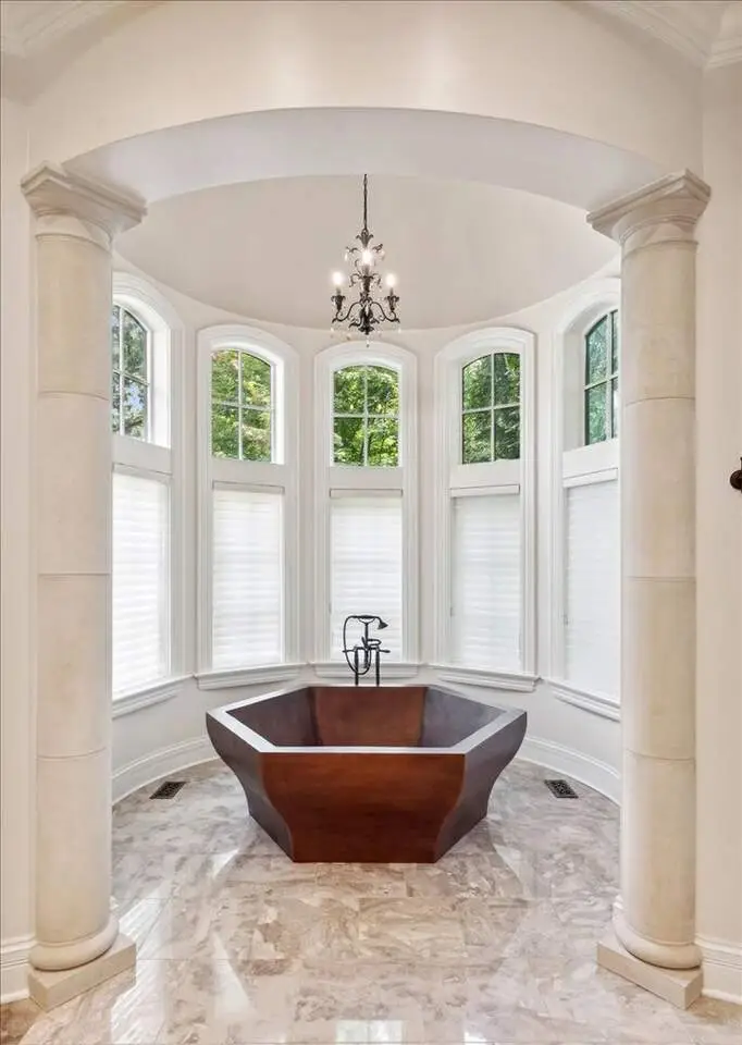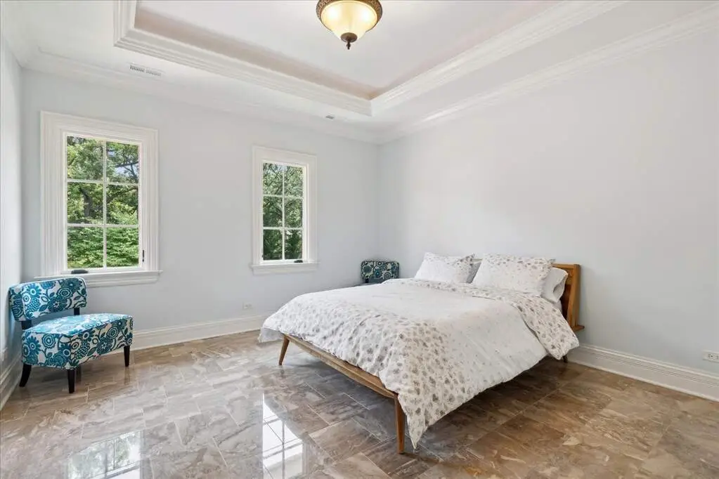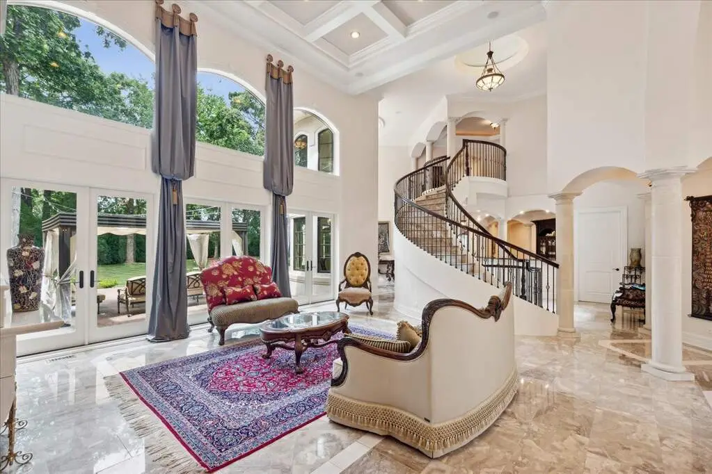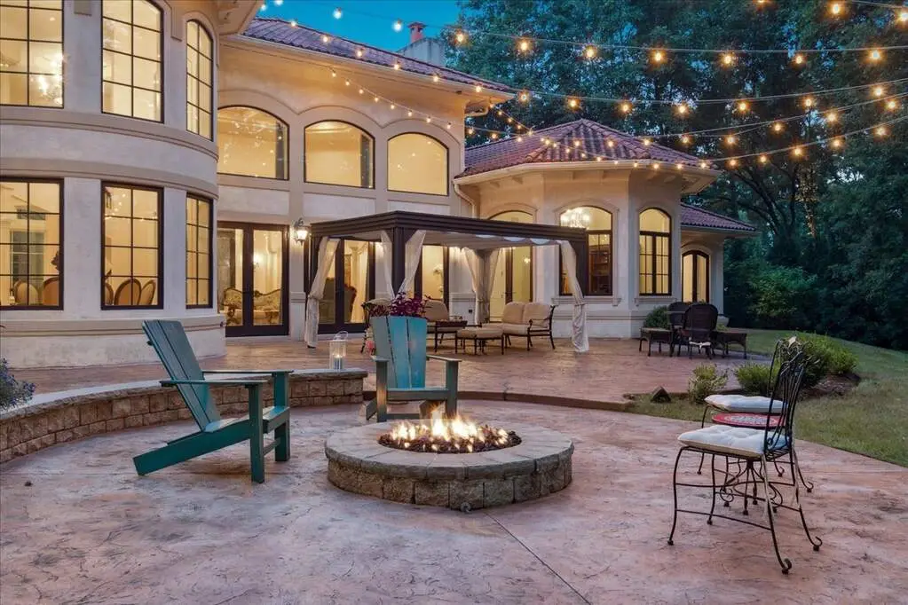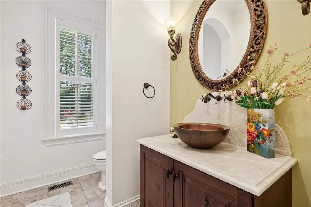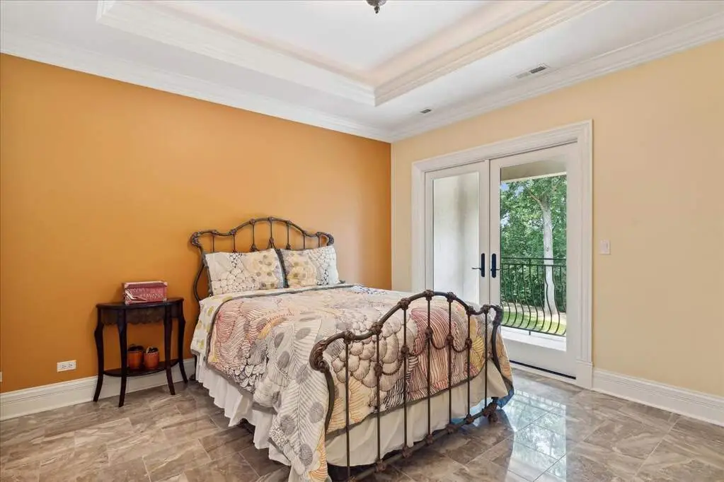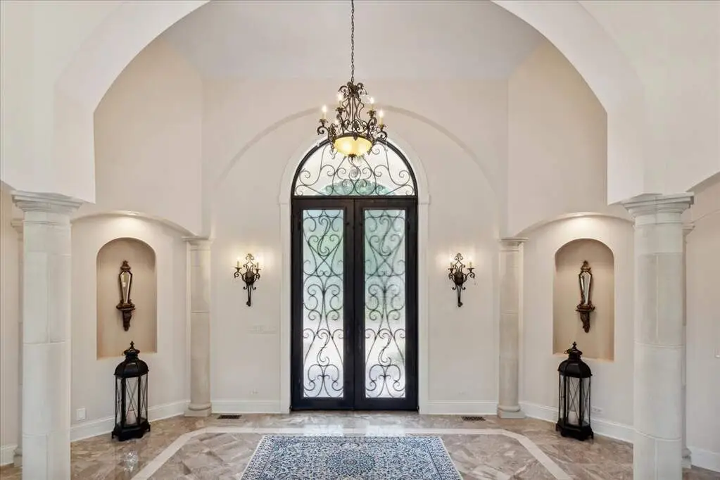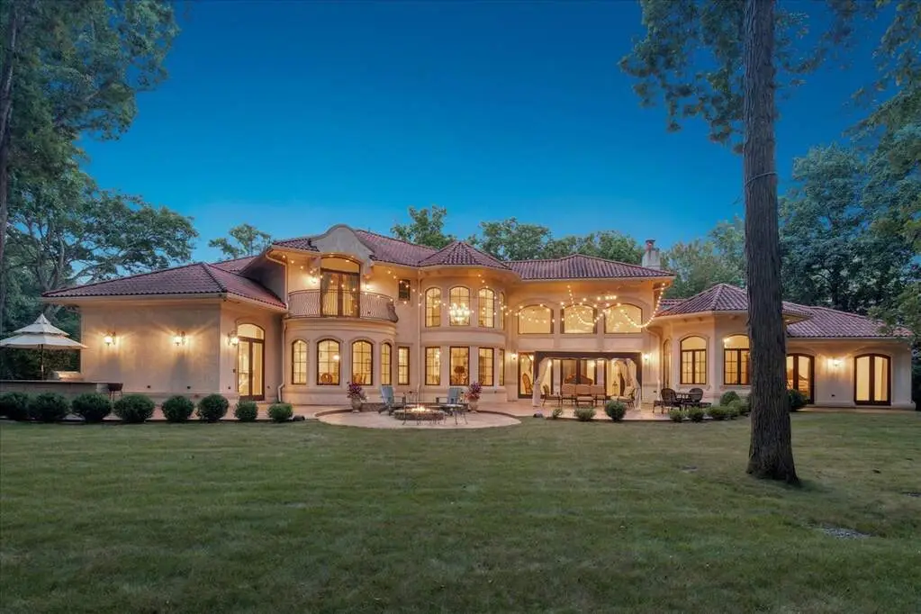 This exceptional 5,700 SF Mediterranean-style villa, crafted with stucco and stone and crowned with a clay tile roof, was meticulously designed and built by the current owners in 2012. The home boasts soaring ceilings and expansive windows that frame views of the beautifully manicured grounds and gardens. Distinctive architectural details and millwork enhance its elegance, while heated marble floors throughout add a touch of luxury. Guests are welcomed into a grand foyer that overlooks a two-story living room featuring a coffered ceiling, a stone fireplace, and three sets of glass doors leading to the patio. The formal dining room, with its stunning domed ceiling and adjacent bar area, is perfect for entertaining. The chef's kitchen, complete with a breakfast room, showcases granite and Taj Mahal quartzite countertops, a spacious breakfast bar with seating for four, two walk-in pantries, a Wolf double oven with a six-burner stove, oversized Subzero refrigerator with freezer and frig drawers, and two Miele dishwashers. This space flows seamlessly into the family room, which opens to an outdoor patio equipped with a built-in grill, serving space, and a gas-start fire pit, all overlooking the meticulously landscaped 1.63-acre property. The first-floor primary suite is a retreat in itself, featuring a tray ceiling, two custom-designed walk-in closets, built-in cabinetry, and an opulent bath with a unique copper-pounded tub, a separate shower, a double vanity, and an adjacent private office. A wrought iron bridal staircase leads to the upper level, where you'll find four large bedrooms, four luxurious bathrooms, plus a spacious loft. The English basement exceeds expectations with its deep window wells allowing natural sunlight to illuminate the space. This extraordinary level includes a fitness room with five lockers, a sauna and steam shower, a game room with a billiard area, a dance floor with a disco ball, a fully equipped wet bar with a mirrored backsplash, a wine beverage center, and a theater room. Exceptional in every way-this home is a must-see!