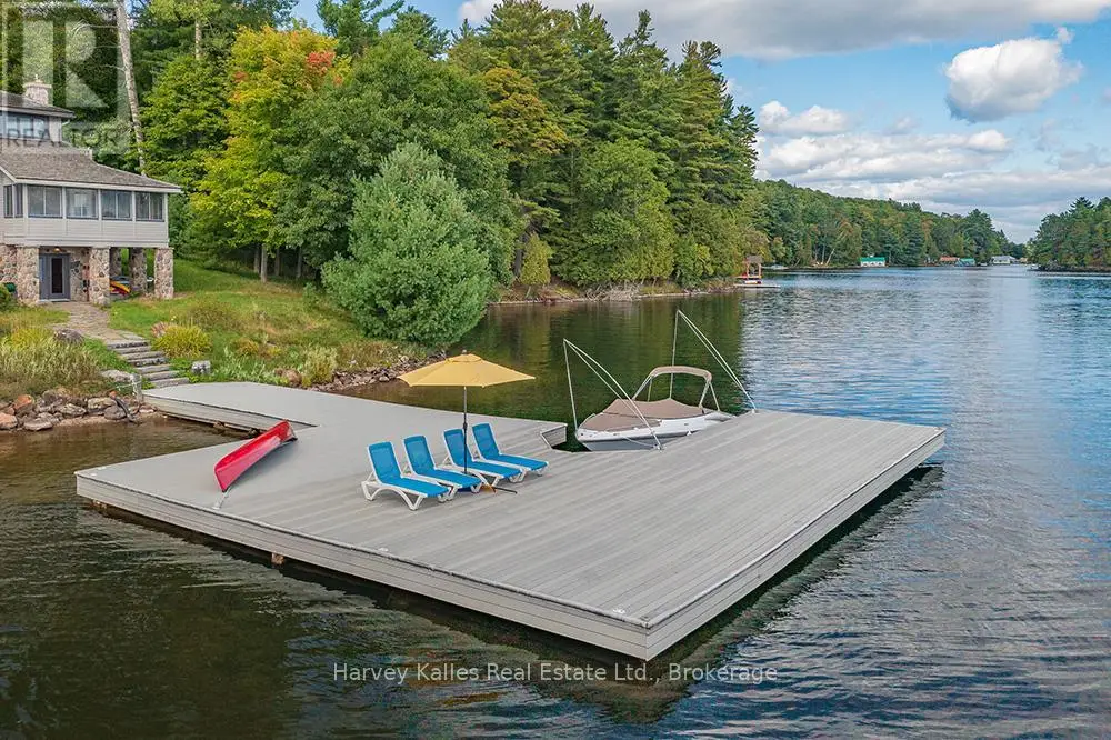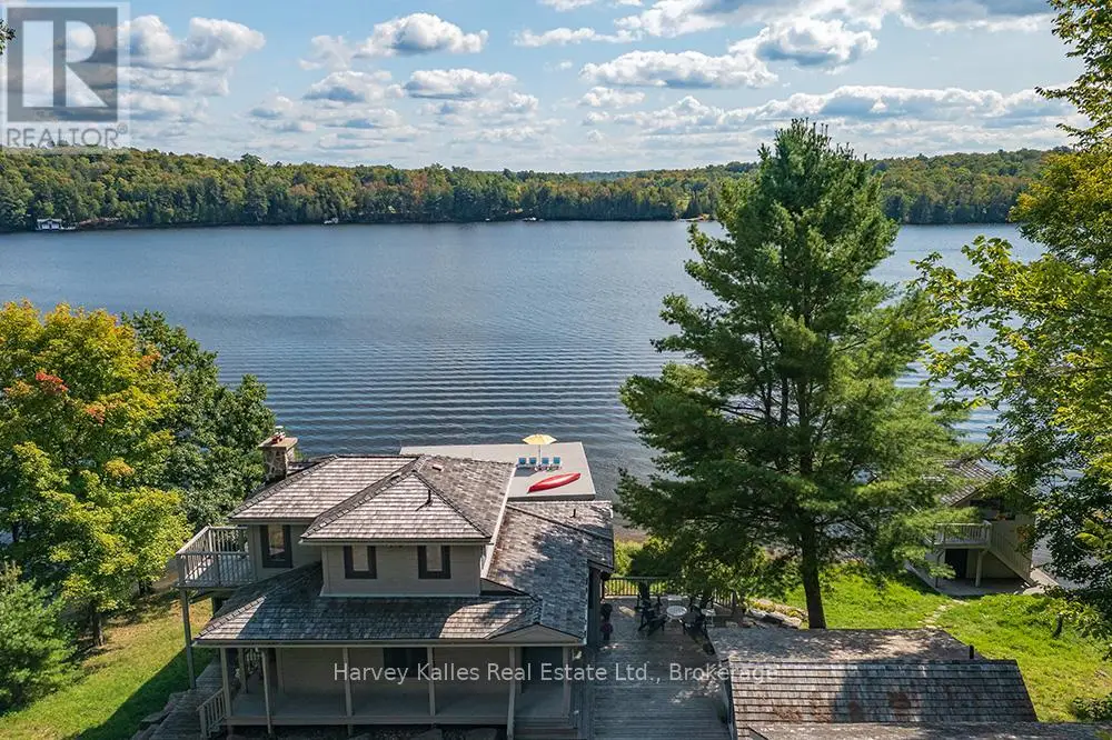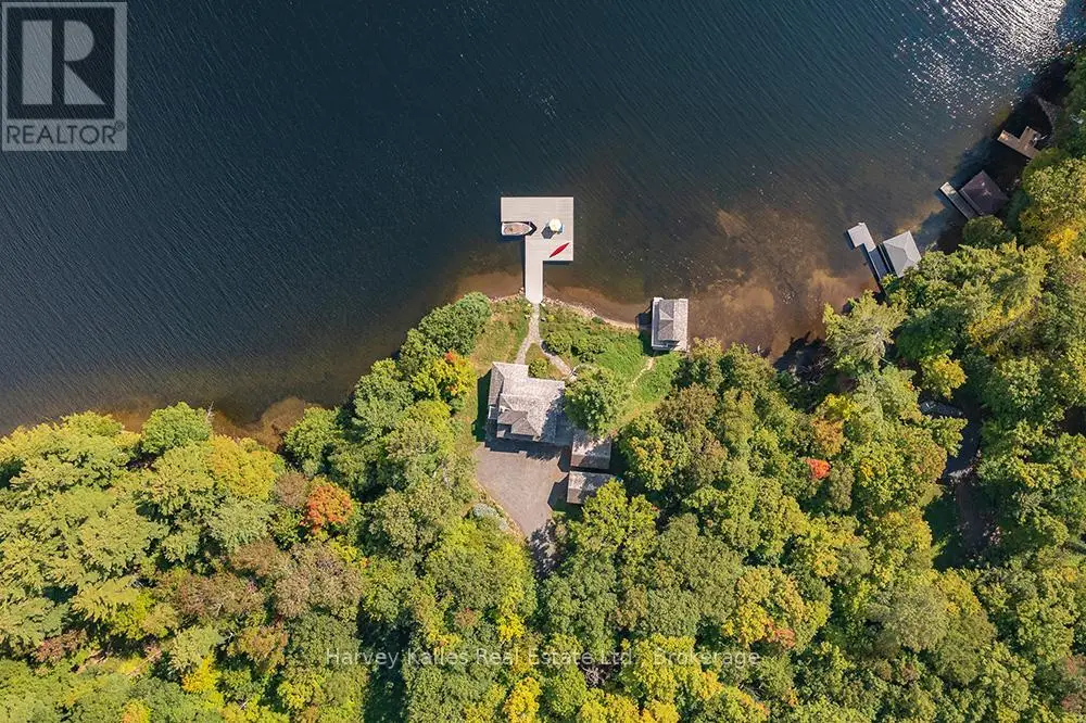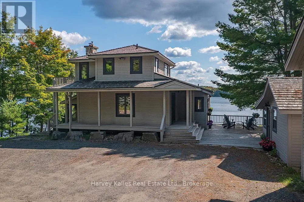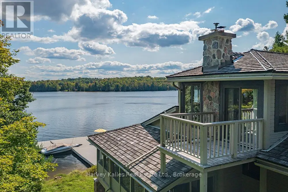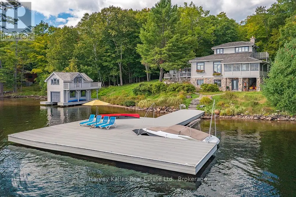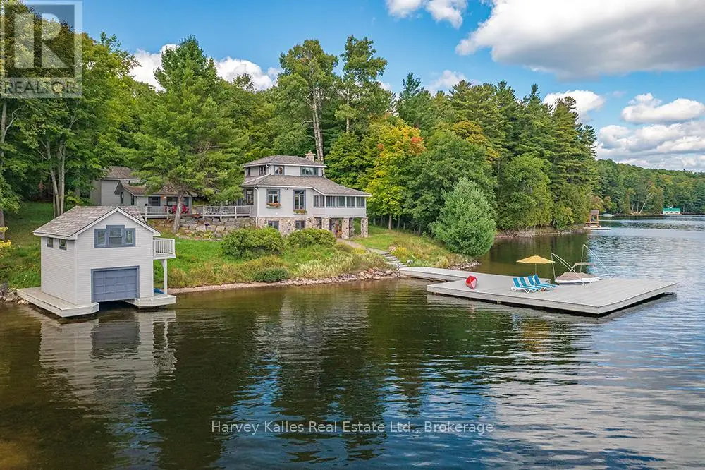 Elevate your lakeside lifestyle to unparalleled heights along Lake of Bays's coveted shores. Ideally situated with sought-after southern exposure, this remarkable property boasts an impressive 332' of frontage and 5.74 acres. For those who wish to have additional privacy, the adjacent vacant lot with 205' of frontage and 3.32 acres is also available for purchase (MLS #X12102319). Upon entering the main cottage, you'll love the sunlit kitchen with exquisite finishes and built-in appliances. The open-concept layout is a dream for those who love to entertain and the spacious sunroom offers additional space for your guests where they can soak in the mesmerizing lake views. This multi-level cottage ingeniously provides a thoughtful separation between the guest bedrooms, owners retreat and living space. The primary bedroom suite is perfectly tucked away, featuring a full ensuite bathroom, a walk-in closet, and a private balcony, affording you a personal retreat that's second to none. The two additional bedrooms are located on the lower level, each with lake views and access to a full guest bathroom and a walkout from the family room to the lakeside. An independent secondary cottage is mere steps away, equipped with a full kitchen, a 3-piece bathroom, and two bedrooms, ensuring ample accommodations for your guests or family. At the water's edge, a shallow, sandy entry to Lake of Bays beckons individuals of all ages, providing a safe and inviting place to wade into the crystal-clear waters. The extensive composite dock is your gateway to endless days basking in the warm sun, and as a bonus, a 2-storey boathouse not only safeguards your watercraft but also offers extra storage or accommodations. Completing this splendid package is a new single-car garage with large studio or gym space. Whether you aspire to make this your permanent residence or seasonal retreat, this property leaves no desire unfulfilled (id:6370)