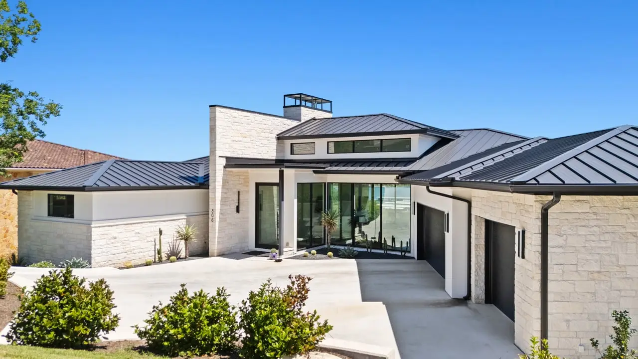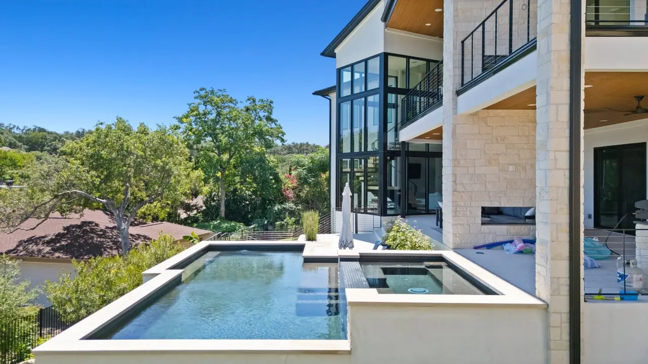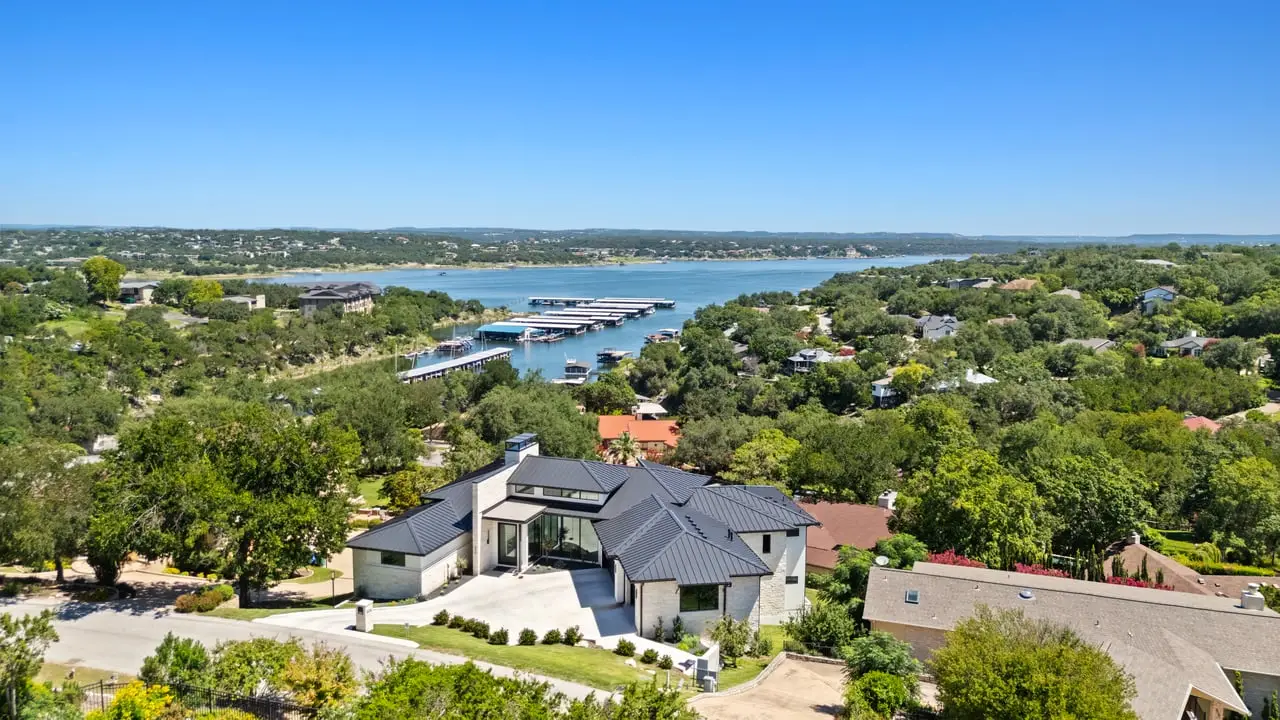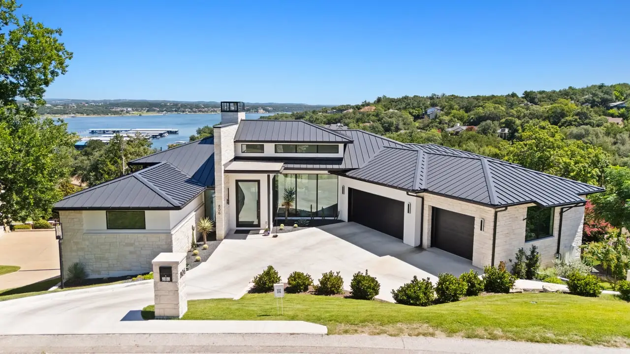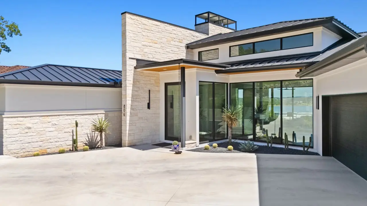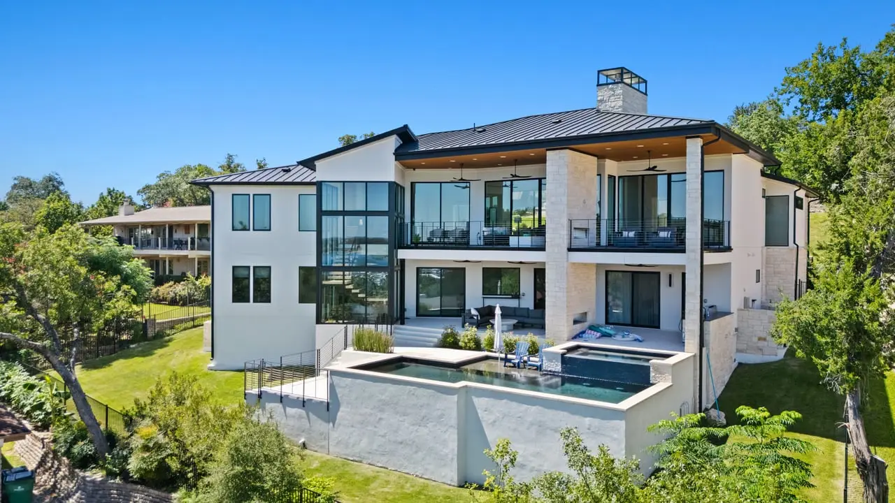 This breathtaking modern residence in the heart of Lakeway boasts captivating views of Lake Travis. Crafted by Strobel Custom Homes in a new construction endeavor, every aspect of this home has been meticulously considered. Luxurious touches abound, from the striking iron staircase encased in glass to the distinctive and modern light fixtures. Thoughtful splashes of color accentuate the space perfectly, complemented by multiple fireplaces both indoors and outdoors. The primary bath features a stunning granite wall, and the expansive floor-to-ceiling windows allow for an abundance of natural light and views of the sparkling pool and lake. A chic wet bar, complete with a serving window to the pool deck, adds an element of sophistication. The well-designed floorplan includes two bedrooms on the main level and two on the lower level, along with an office/flex space that overlooks the inviting pool. The outside entertaining areas both on the main and pool level give way to lake views, duel sided fireplaces, outdoor kitchen, swim up bar area and abundant pool decking. All construction information is available on property website. 806sunfish.com