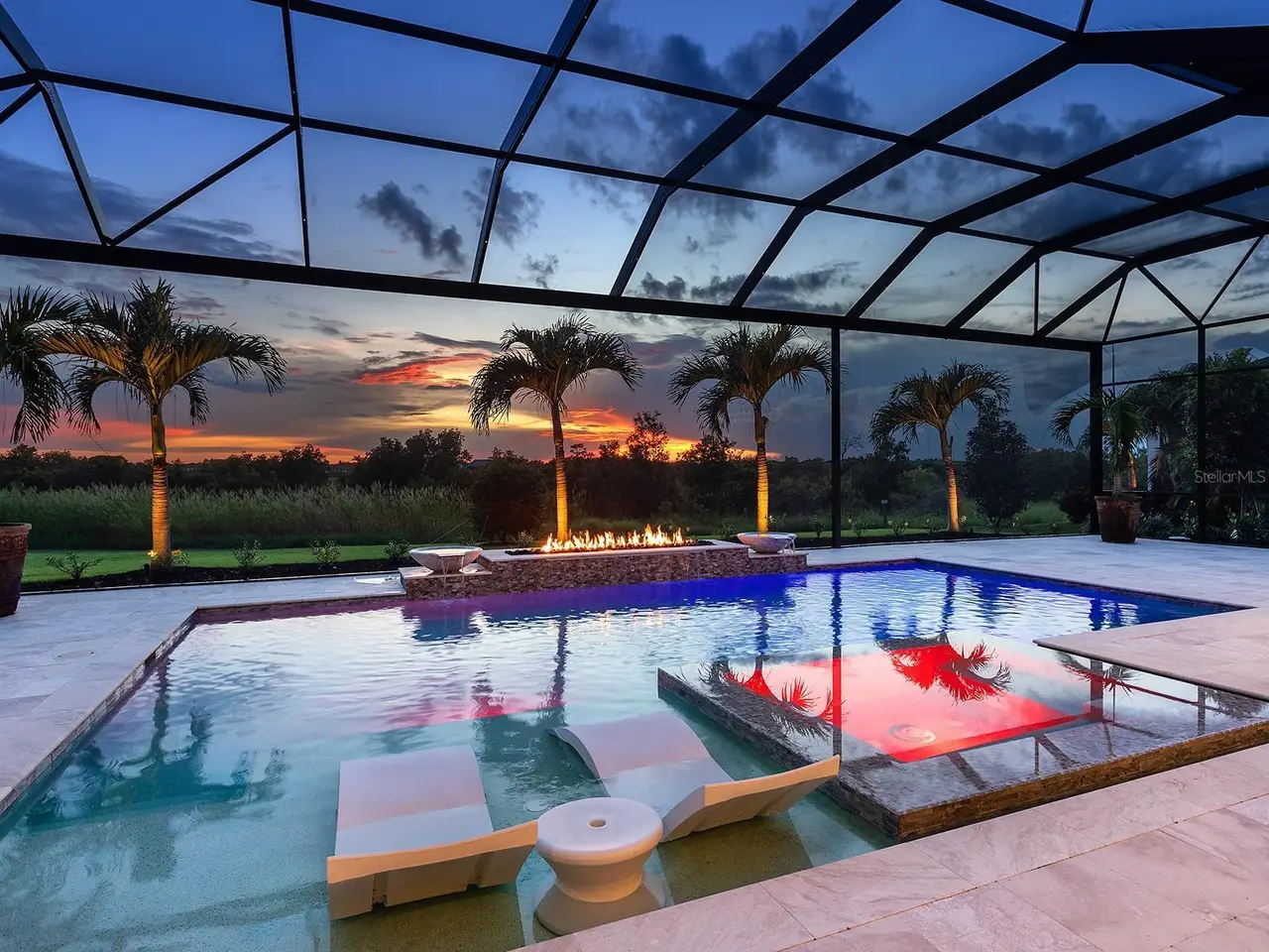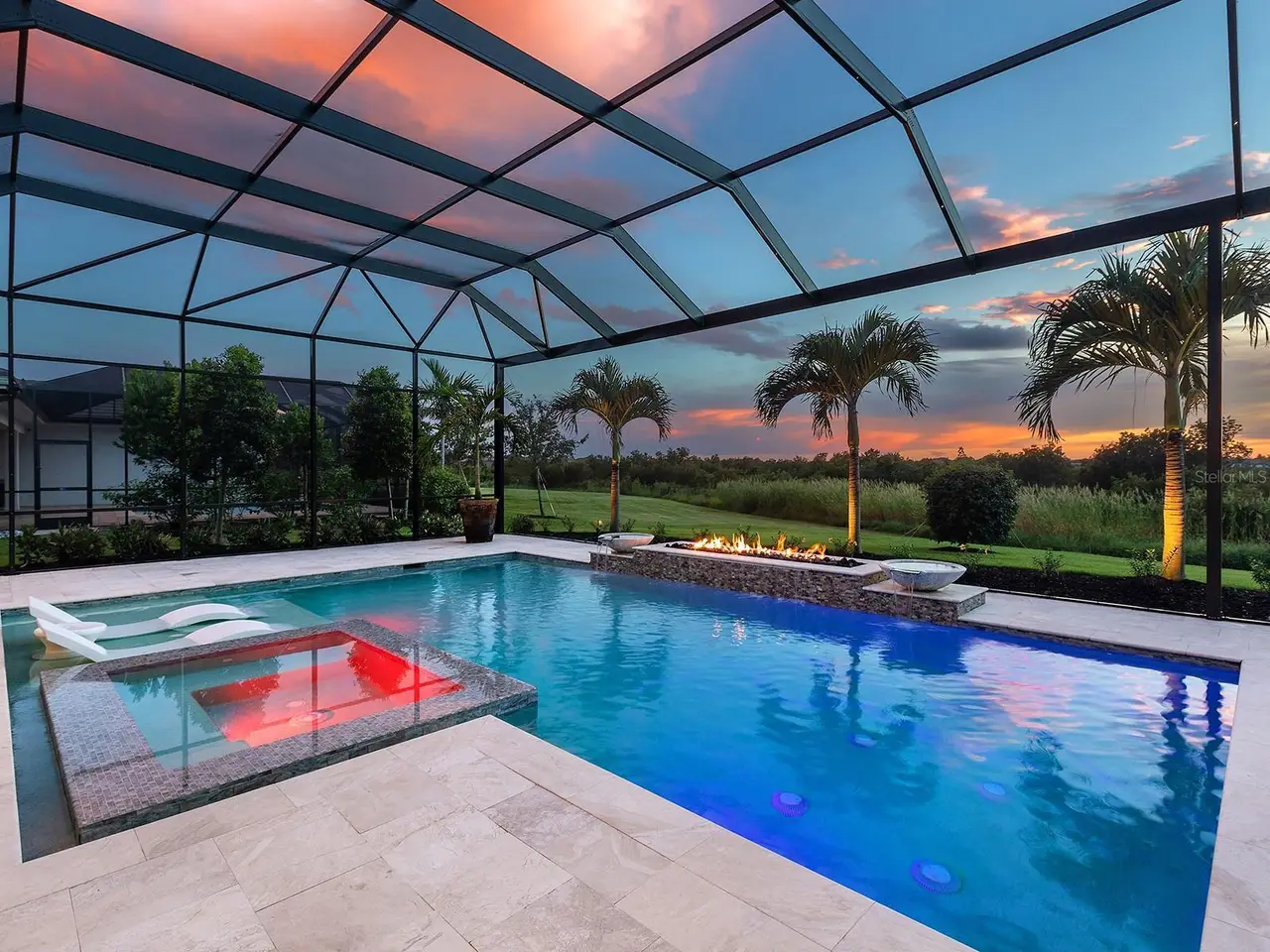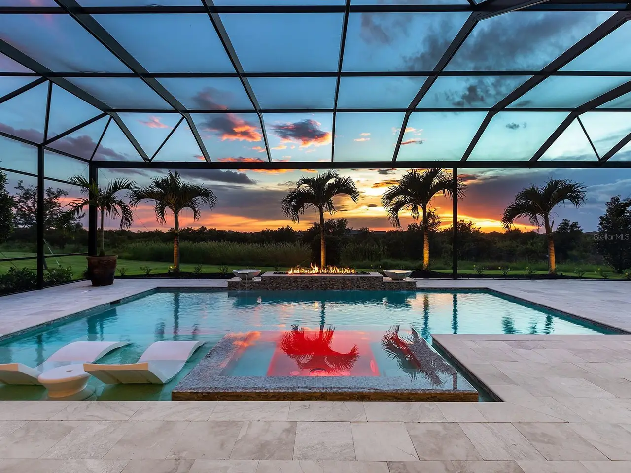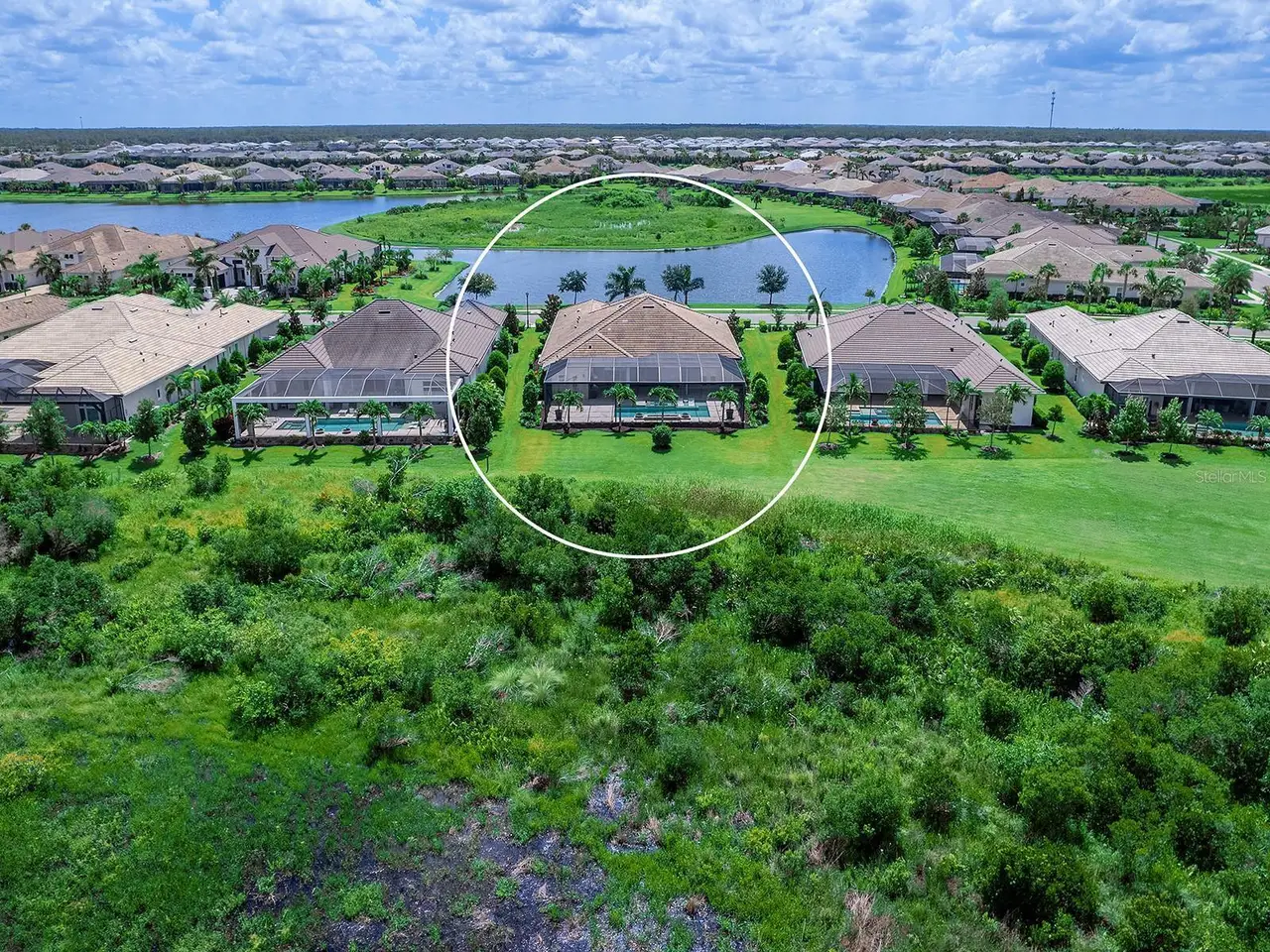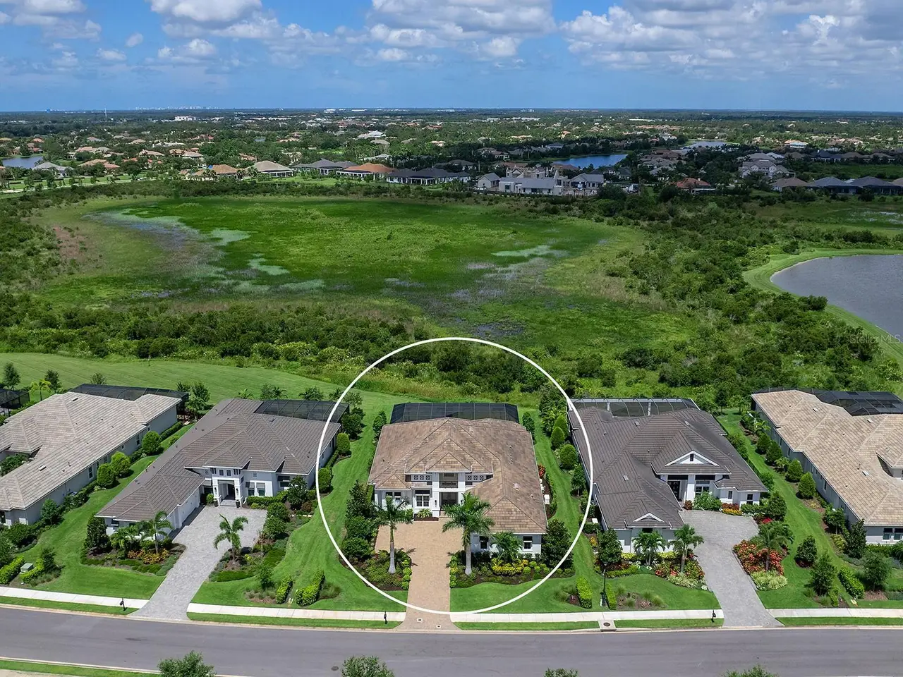 Prestigious living in The Lake Club of Lakewood Ranch is within reach! Nestled among towering palms and verdant landscaping is this completely, custom Madison II home built by Stock Luxury Homes in 2021. The lush Florida conservation wetland provides a beautiful backdrop for the western rear exposure with spectacular sunsets. This entire residence had every detail carefully hand-selected to evoke a luxurious and comforting residence including oak hardwood flooring, cove crown molding and custom ceilings, high-end designer light fixtures, plantation shutters, and top-of-the-line functional selections in every room. Superior details and a sense of security continue with high-end construction, impact doors and windows throughout, additional remote control hurricane screens on the lanai, 22kw whole-house generator, surge protector, and whole-house water filtration system. The central great room is the heart of the home with custom coffered ceiling, custom built-in display shelving and entertainment cabinetry, and a full wall of impact sliding glass doors to the lanai. Enjoy a modern open-concept floor plan that flows effortlessly throughout the living areas and out onto the marble paver lanai. With beautiful and private views of the preserve, the lanai offers a serene space to gather around the gas fireplace and under wood ceilings, take in the views from panoramic screen enclosure, or dine by the outdoor kitchen. The custom saltwater pool offers a sunken 360-edge spa, sunshelf, Nebula lights built into the screen enclosure to create a starlight effect above, and a built-in fire bar feature plus water bowls – you won’t find another lanai like this at any other home. The luxurious lifestyle continues indoors with the executive kitchen that is expertly outfitted with high-end appliances including Wolf gas cooktop, Miele dishwasher, Sub-Zero refrigerator, and dual Wolf wall ovens. The custom cabinetry offers complimentary two-tone colors, thick quartz counters with full-height backsplash, pots and pans drawers, additional integrated pantry tower, and a walk-in pantry with shelving. The adjacent dining room has custom ceilings, disappearing corner impact sliders, and a breathtaking designer chandelier. Work from home in the study equipped with dual built-in desks with glass tops, file drawers, and display shelving. The primary suite sparkles with designer wallpaper, custom ceilings, impact French doors to the lanai, and impressive dual walk-in closets with custom closet systems. The spa-like bathroom gives you a five-star experience with dual vanities, make-up space, linen closet storage tower, modern freestanding soaking tub, and walk-in shower with rain shower head. Guests will find similar comfort in two guest suites with their own private en-suite bathrooms. The spacious rear bonus room is ideal for gathering with a custom dry bar with quartz counters, mirrored backsplash, display cabinetry, and two Sub-Zero wine refrigerators. There is also a dedicated full pool bathroom with walk-in shower and exterior lanai access, plus a guest powder bathroom. A functional laundry room, mudroom-style garage entry, spacious 3-car garage and oversized driveway complete this impressive home. You’ll also enjoy a lower property tax bill than other homes because the debt portion of the CDD Lakewood Ranch Stewardship has been PAID OFF. The Lake Club is an exclusive premier, gated community with a Grande Clubhouse, restaurant, pool, tennis, pickleball and more.