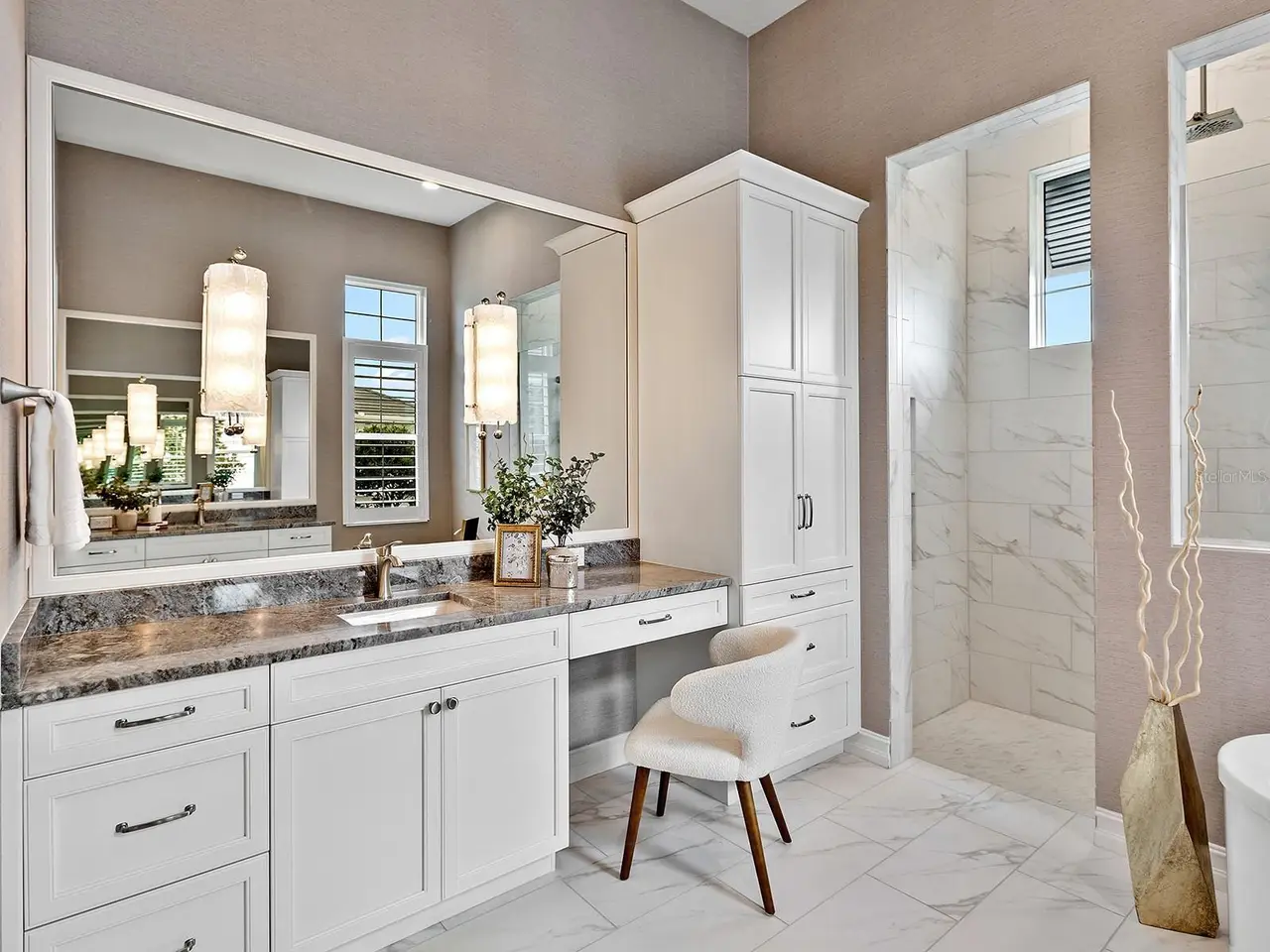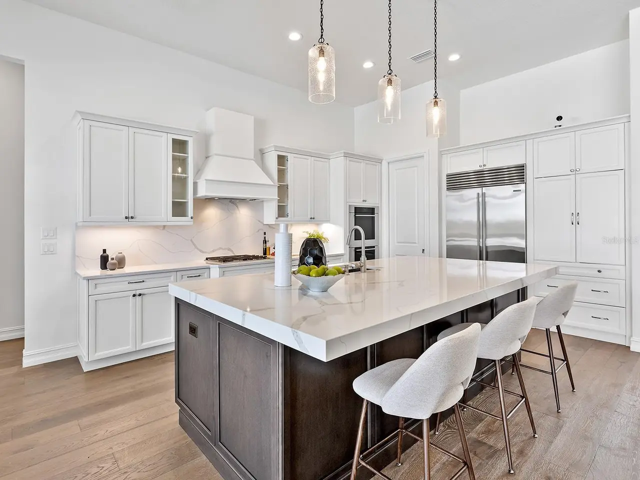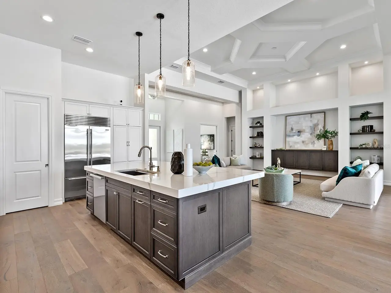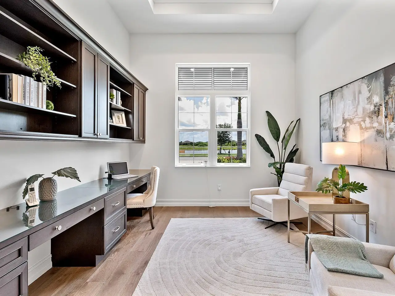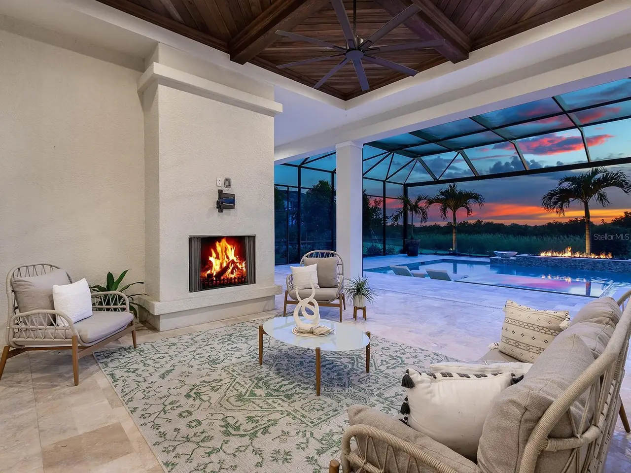 Prestigious living in The Lake Club of Lakewood Ranch is within reach! Nestled among towering palms and verdant landscaping is this completely, custom Madison II home built by Stock Luxury Homes in 2021. The lush Florida conservation wetland provides a beautiful backdrop for the western rear exposure with spectacular sunsets. This entire residence had every detail carefully hand-selected to evoke a luxurious and comforting residence including oak hardwood flooring, cove crown molding and custom ceilings, high-end designer light fixtures, plantation shutters, and top-of-the-line functional selections in every room. Superior details and a sense of security continue with high-end construction, impact doors and windows throughout, additional remote control hurricane screens on the lanai, 22kw whole-house generator, surge protector, and whole-house water filtration system. The central great room is the heart of the home with custom coffered ceiling, custom built-in display shelving and entertainment cabinetry, and a full wall of impact sliding glass doors to the lanai. Enjoy a modern open-concept floor plan that flows effortlessly throughout the living areas and out onto the marble paver lanai. With beautiful and private views of the preserve, the lanai offers a serene space to gather around the gas fireplace and under wood ceilings, take in the views from panoramic screen enclosure, or dine by the outdoor kitchen. The custom saltwater pool offers a sunken 360-edge spa, sunshelf, Nebula lights built into the screen enclosure to create a starlight effect above, and a built-in fire bar feature plus water bowls – you won’t find another lanai like this at any other home. The luxurious lifestyle continues indoors with the executive kitchen that is expertly outfitted with high-end appliances including Wolf gas cooktop, Miele dishwasher, Sub-Zero refrigerator, and dual Wolf wall ovens. The custom cabinetry offers complimentary two-tone colors, thick quartz counters with full-height backsplash, pots and pans drawers, additional integrated pantry tower, and a walk-in pantry with shelving. The adjacent dining room has custom ceilings, disappearing corner impact sliders, and a breathtaking designer chandelier. Work from home in the study equipped with dual built-in desks with glass tops, file drawers, and display shelving. The primary suite sparkles with designer wallpaper, custom ceilings, impact French doors to the lanai, and impressive dual walk-in closets with custom closet systems. The spa-like bathroom gives you a five-star experience with dual vanities, make-up space, linen closet storage tower, modern freestanding soaking tub, and walk-in shower with rain shower head. Guests will find similar comfort in two guest suites with their own private en-suite bathrooms. The spacious rear bonus room is ideal for gathering with a custom dry bar with quartz counters, mirrored backsplash, display cabinetry, and two Sub-Zero wine refrigerators. There is also a dedicated full pool bathroom with walk-in shower and exterior lanai access, plus a guest powder bathroom. A functional laundry room, mudroom-style garage entry, spacious 3-car garage and oversized driveway complete this impressive home. You’ll also enjoy a lower property tax bill than other homes because the debt portion of the CDD Lakewood Ranch Stewardship has been PAID OFF. The Lake Club is an exclusive premier, gated community with a Grande Clubhouse, restaurant, pool, tennis, pickleball and more.