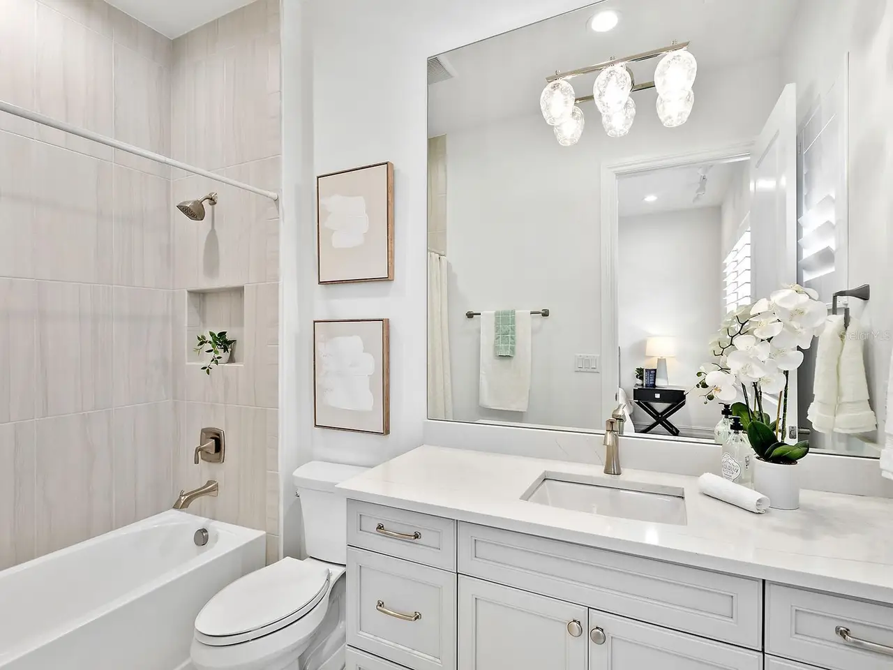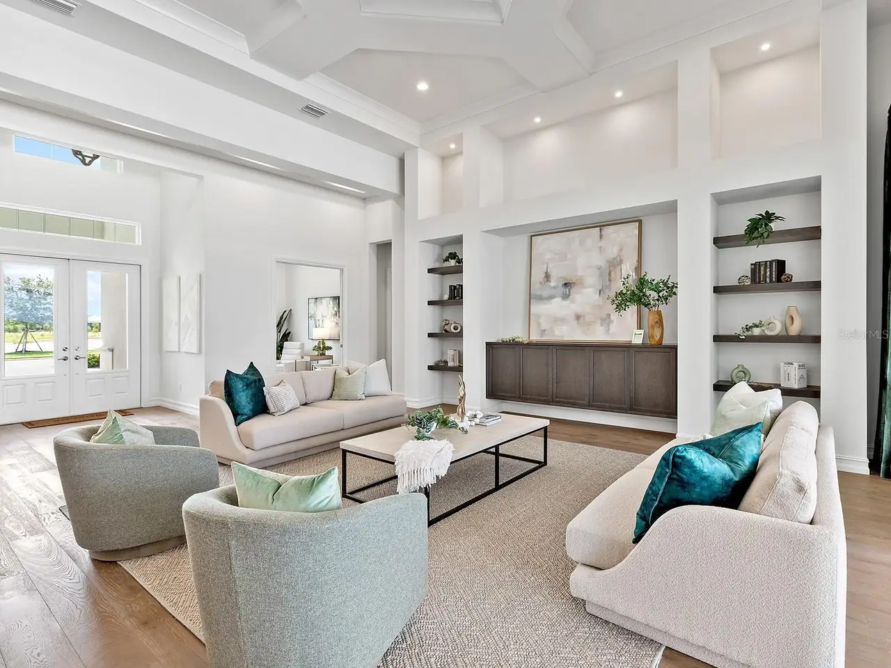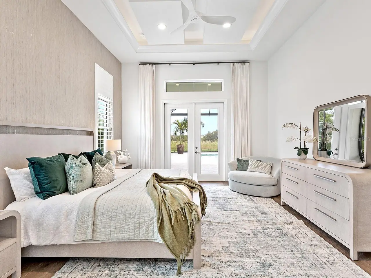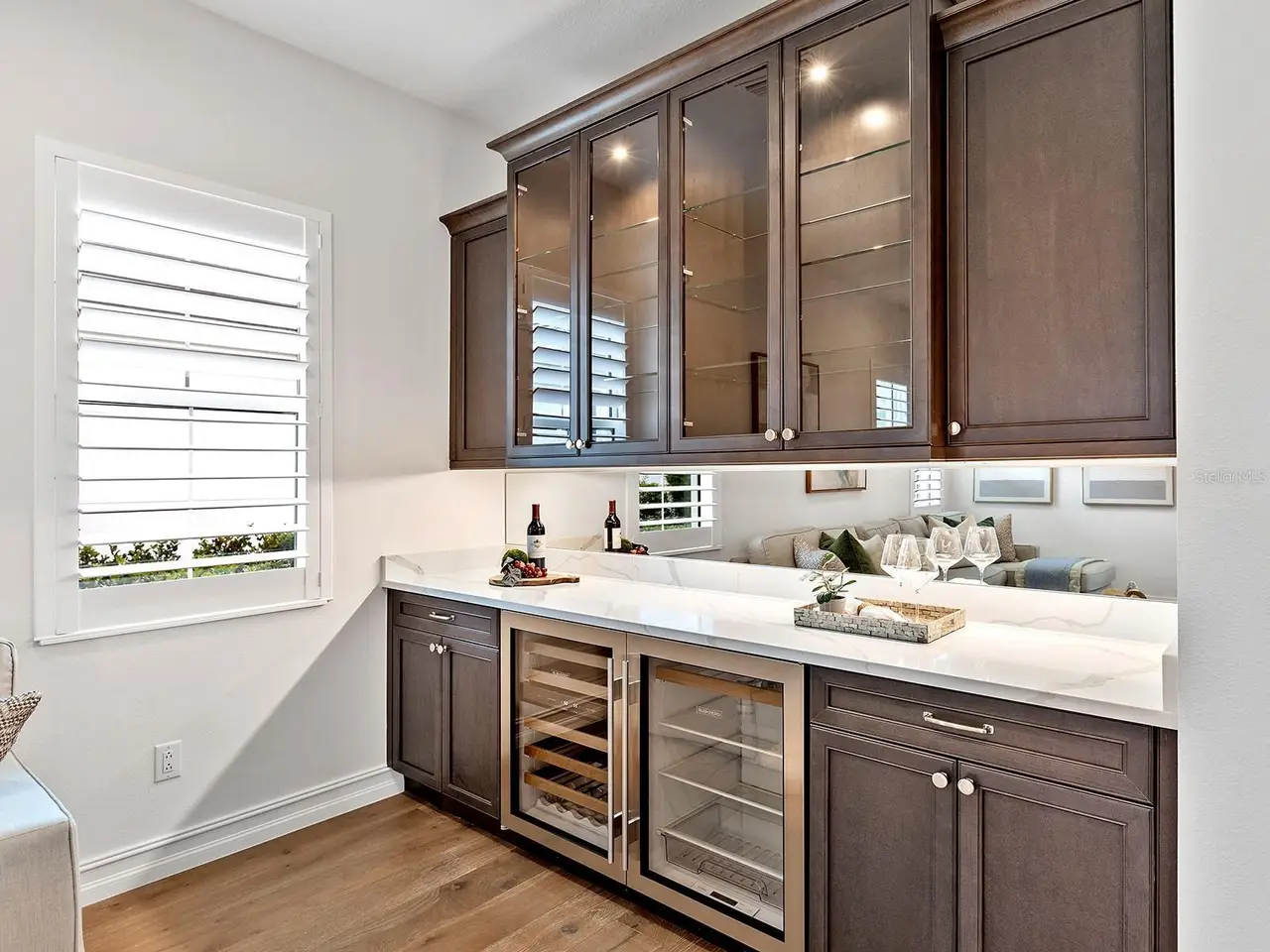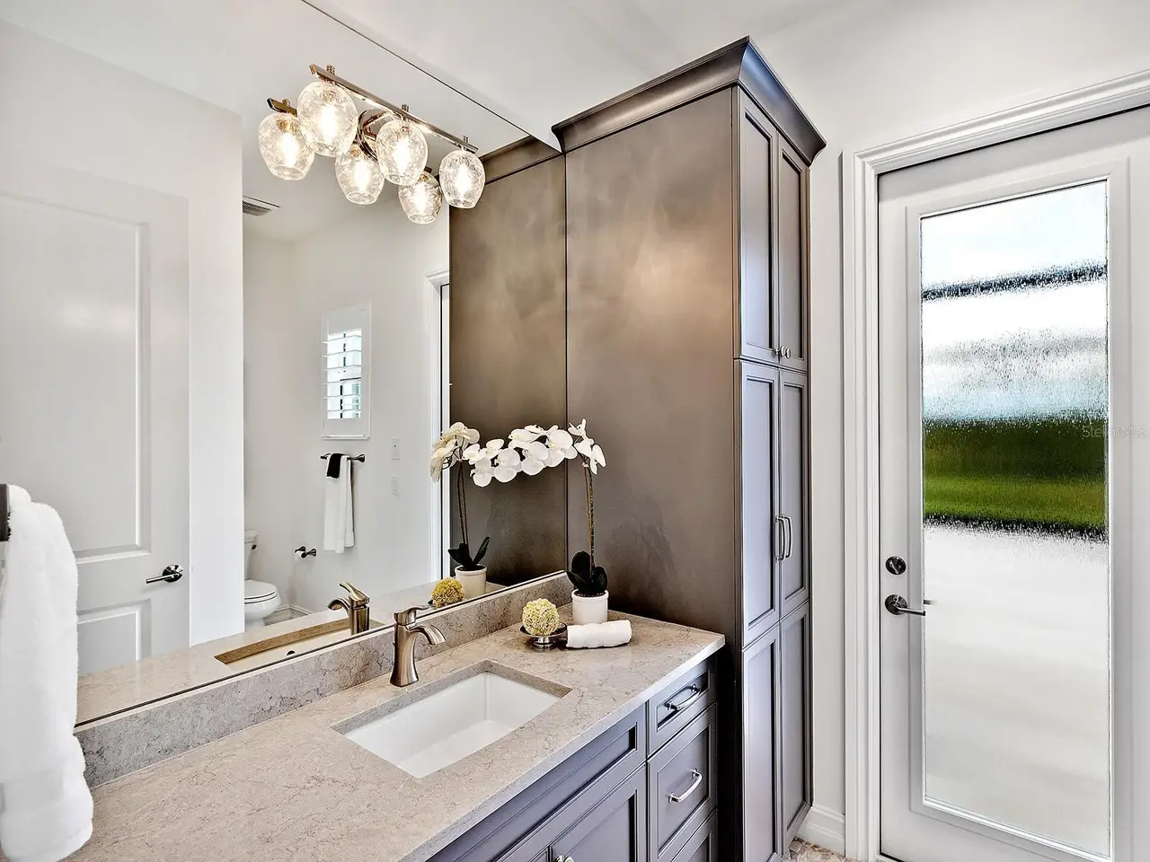 Prestigious living in The Lake Club of Lakewood Ranch is within reach! Nestled among towering palms and verdant landscaping is this completely, custom Madison II home built by Stock Luxury Homes in 2021. The lush Florida conservation wetland provides a beautiful backdrop for the western rear exposure with spectacular sunsets. This entire residence had every detail carefully hand-selected to evoke a luxurious and comforting residence including oak hardwood flooring, cove crown molding and custom ceilings, high-end designer light fixtures, plantation shutters, and top-of-the-line functional selections in every room. Superior details and a sense of security continue with high-end construction, impact doors and windows throughout, additional remote control hurricane screens on the lanai, 22kw whole-house generator, surge protector, and whole-house water filtration system. The central great room is the heart of the home with custom coffered ceiling, custom built-in display shelving and entertainment cabinetry, and a full wall of impact sliding glass doors to the lanai. Enjoy a modern open-concept floor plan that flows effortlessly throughout the living areas and out onto the marble paver lanai. With beautiful and private views of the preserve, the lanai offers a serene space to gather around the gas fireplace and under wood ceilings, take in the views from panoramic screen enclosure, or dine by the outdoor kitchen. The custom saltwater pool offers a sunken 360-edge spa, sunshelf, Nebula lights built into the screen enclosure to create a starlight effect above, and a built-in fire bar feature plus water bowls – you won’t find another lanai like this at any other home. The luxurious lifestyle continues indoors with the executive kitchen that is expertly outfitted with high-end appliances including Wolf gas cooktop, Miele dishwasher, Sub-Zero refrigerator, and dual Wolf wall ovens. The custom cabinetry offers complimentary two-tone colors, thick quartz counters with full-height backsplash, pots and pans drawers, additional integrated pantry tower, and a walk-in pantry with shelving. The adjacent dining room has custom ceilings, disappearing corner impact sliders, and a breathtaking designer chandelier. Work from home in the study equipped with dual built-in desks with glass tops, file drawers, and display shelving. The primary suite sparkles with designer wallpaper, custom ceilings, impact French doors to the lanai, and impressive dual walk-in closets with custom closet systems. The spa-like bathroom gives you a five-star experience with dual vanities, make-up space, linen closet storage tower, modern freestanding soaking tub, and walk-in shower with rain shower head. Guests will find similar comfort in two guest suites with their own private en-suite bathrooms. The spacious rear bonus room is ideal for gathering with a custom dry bar with quartz counters, mirrored backsplash, display cabinetry, and two Sub-Zero wine refrigerators. There is also a dedicated full pool bathroom with walk-in shower and exterior lanai access, plus a guest powder bathroom. A functional laundry room, mudroom-style garage entry, spacious 3-car garage and oversized driveway complete this impressive home. You’ll also enjoy a lower property tax bill than other homes because the debt portion of the CDD Lakewood Ranch Stewardship has been PAID OFF. The Lake Club is an exclusive premier, gated community with a Grande Clubhouse, restaurant, pool, tennis, pickleball and more.