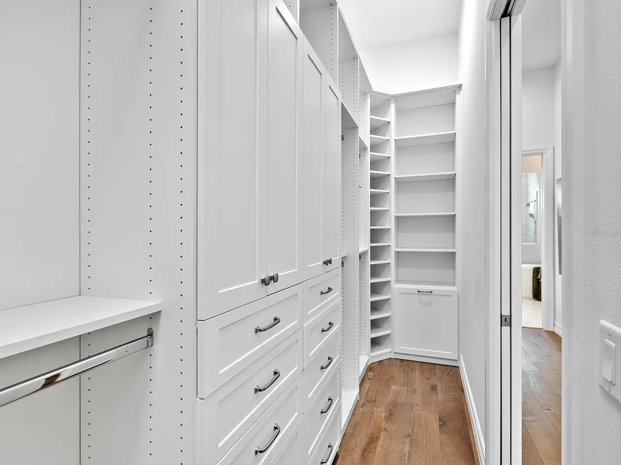 Dual walk-in closets with custom systems