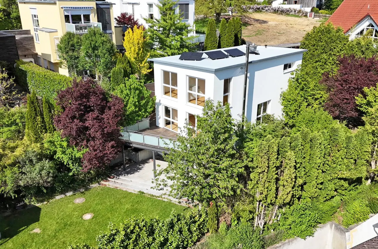 This charming detached house on Birkenberg in Landshut offers a unique combination of modern architecture, a quiet location and impressive views. On a generous plot of 713 m², the house extends over 3 floors with a living area of approx. 170 m² and an additional usable area of 60 m². Built in 2006 and equipped to a high standard, the house impresses with its clear lines and classic flat roof, which harmonizes perfectly with the modern design. The hillside location creates a special room layout, with the main entrance on the first floor (EG) and the garden accessible via the basement (UG). This design not only provides bright, light-flooded rooms, but also a breathtaking panoramic view from the living area and the upper floors. The sunrises and sunsets are particularly impressive, giving the house an incomparable atmosphere. The house has 6 rooms, including 5 bedrooms and 2 modern tiled bathrooms, which create a harmonious overall picture. High-quality parquet flooring in the living and sleeping areas and generous window fronts ensure a bright, warm living ambience. The fireplace in the living room creates a cozy, feel-good atmosphere. Another highlight is the garden, which was redesigned in 2019, is easy to maintain and beautifully ingrown. The garden with terrace offers plenty of privacy and invites you to spend relaxing hours outdoors. The house also has a practical garage and 4 parking spaces, providing ample parking space. The quiet and green location on Birkenberg combines rural flair with proximity to the city. Shopping facilities, schools and excellent transport links make this residential area particularly attractive. The center of Landshut and the A92 freeway with a direct connection to Munich can be reached in just a few minutes. This hidden gem on Birkenberg combines modern functionality, a harmonious living ambience and a fantastic location - perfect for anyone looking for a high quality of life and stylish living. Arrange a viewing appointment now and let this exceptional property convince you!