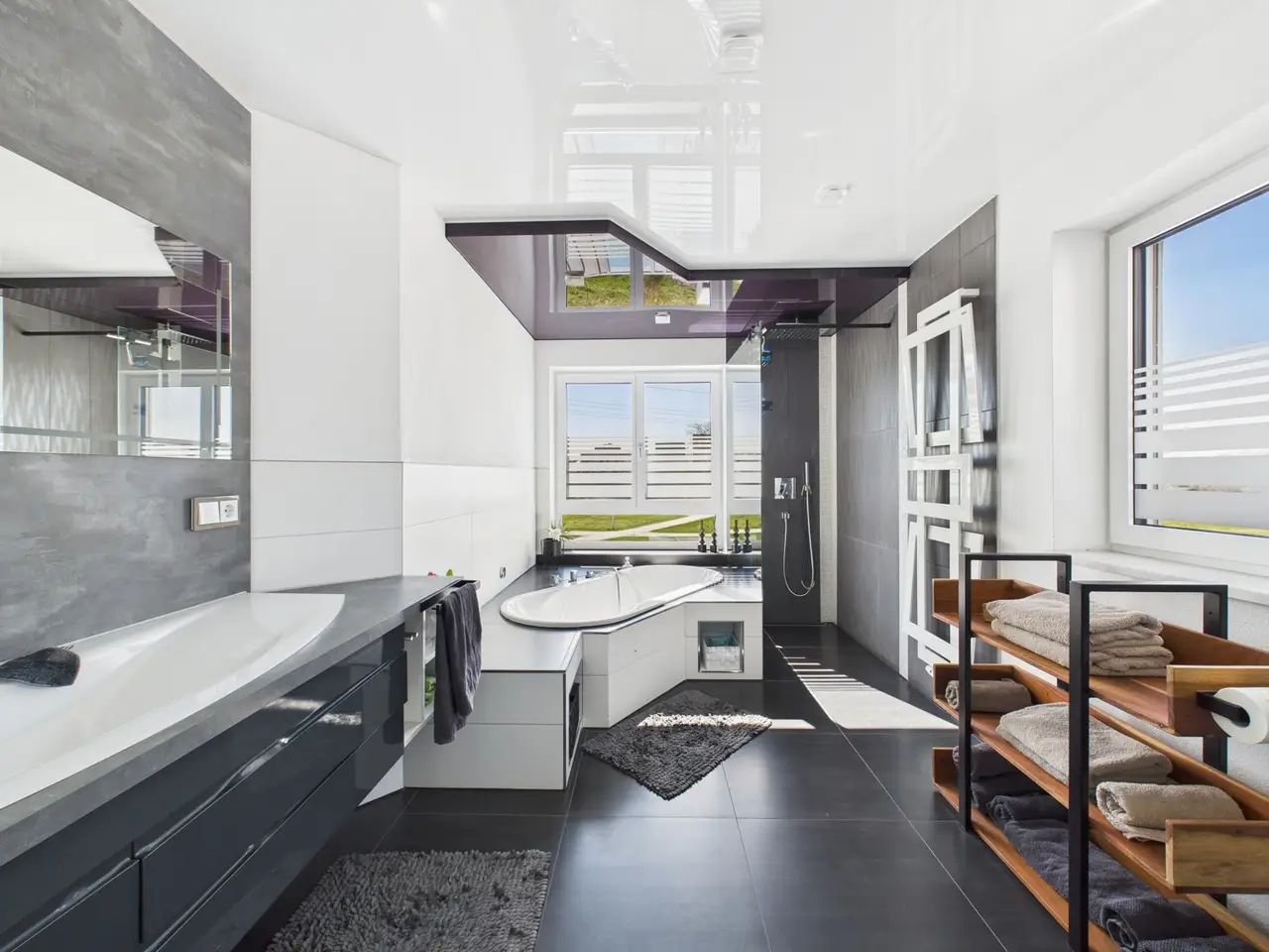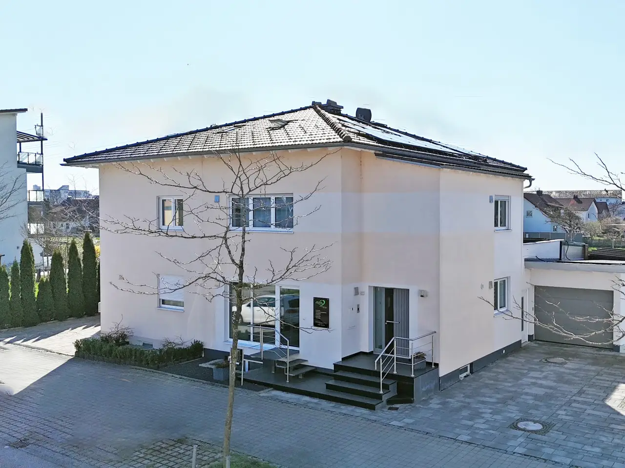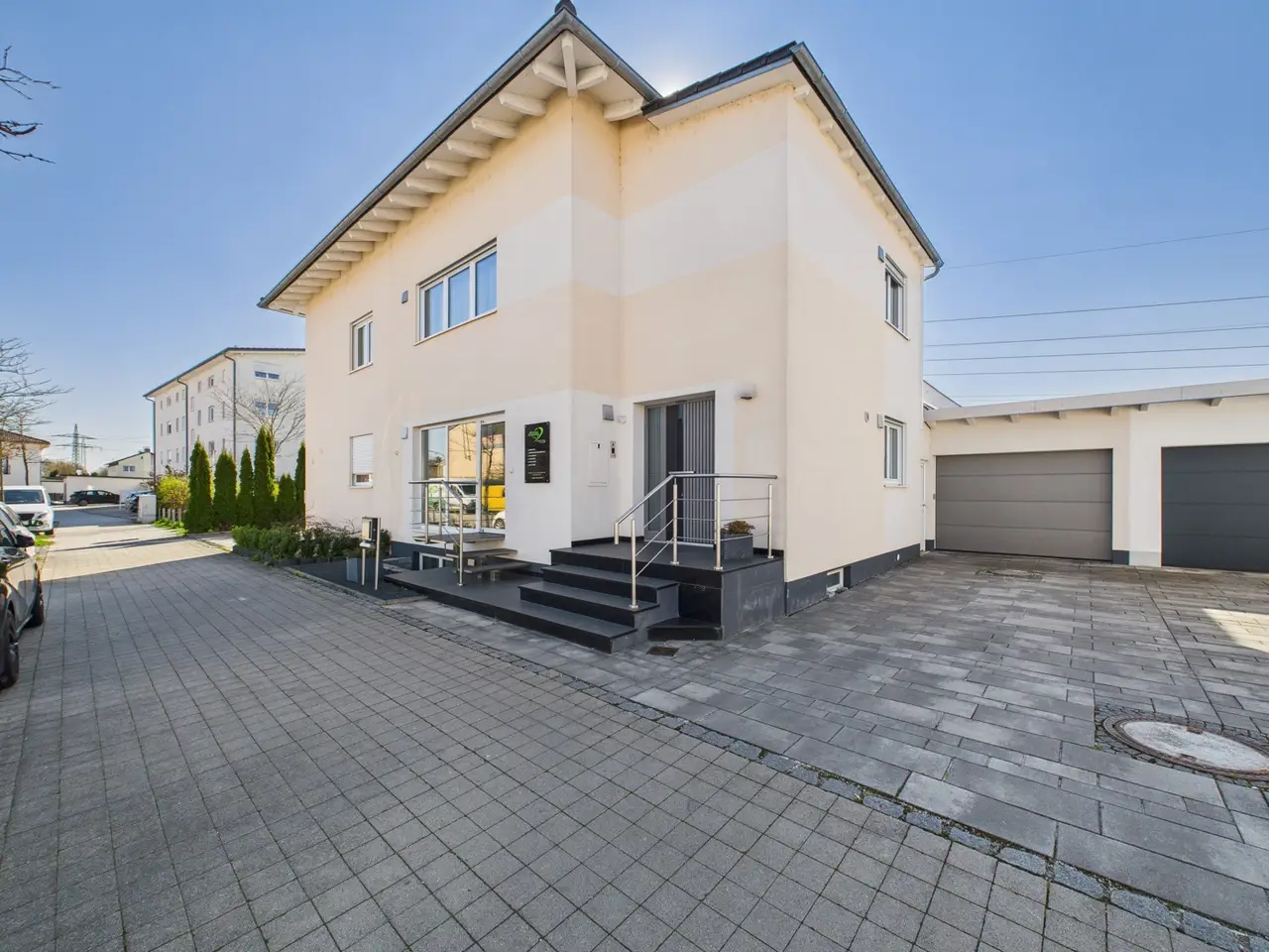 In the middle of the popular and quiet Wolfgangsiedlung estate in Landshut, this exceptional home awaits you with an intelligent room layout, modern technology and a special feel-good character on around 170 m² of living space. Whether as a family home, multi-generational home or a combination of living and working - here you will find space for your visions. Even the bright, open entrance area conveys a feeling of spaciousness. Directly adjacent, the large, modern living room with floor-to-ceiling windows and flowing transition to the dining area invites you to arrive and relax. The timeless kitchen impresses with its clear lines and functionality - perfect for anyone who loves cooking and design in equal measure. A conservatory with a view of the greenery and a covered terrace with a stylish partition wall to the neighbor create an outdoor retreat that unfolds its charm at any time of year - private, idyllic and sheltered. The light-flooded, open staircases with elegant glass walls harmoniously connect the four levels of this house. On the upper floor, you will find a romantically designed bathroom with high-quality fittings, a barrier-free shower, elegant stretch ceilings and a fantastic view of the greenery directly from the bathtub. The spacious master bedroom has a separate dressing room, while two bright children's bedrooms - one of which has access to its own roof terrace - offer individual retreats for each family member. The converted attic creates additional living or storage space - ideal as a work area, studio or teenager's room. Two further rooms await you in the basement: a bright room with a large window and a large hobby room for sports, leisure or home office. The basement is completed by a separate shower room with toilet and a room prepared for a sauna - for your private wellness oasis. If required, the property can also be used as a two-party house - with a separate entrance to the possible granny apartment. This leaves room for flexible living concepts - regardless of whether you are planning for a family, want to unite several generations under one roof or combine living and working. The house is technically well equipped: PV system with storage Groundwater heat pump Triple-glazed plastic windows Decentralized ventilation system with central control Central vacuum cleaner system Modern decalcification system Summary: This modern semi-detached house is a real space miracle in one of Landshut's most sought-after locations. The Wolfgangsiedlung offers a perfect combination of tranquillity, family-friendliness and urban proximity - a place where you will feel at home for a long time. You can call up the 360-degree digital tour under this link: