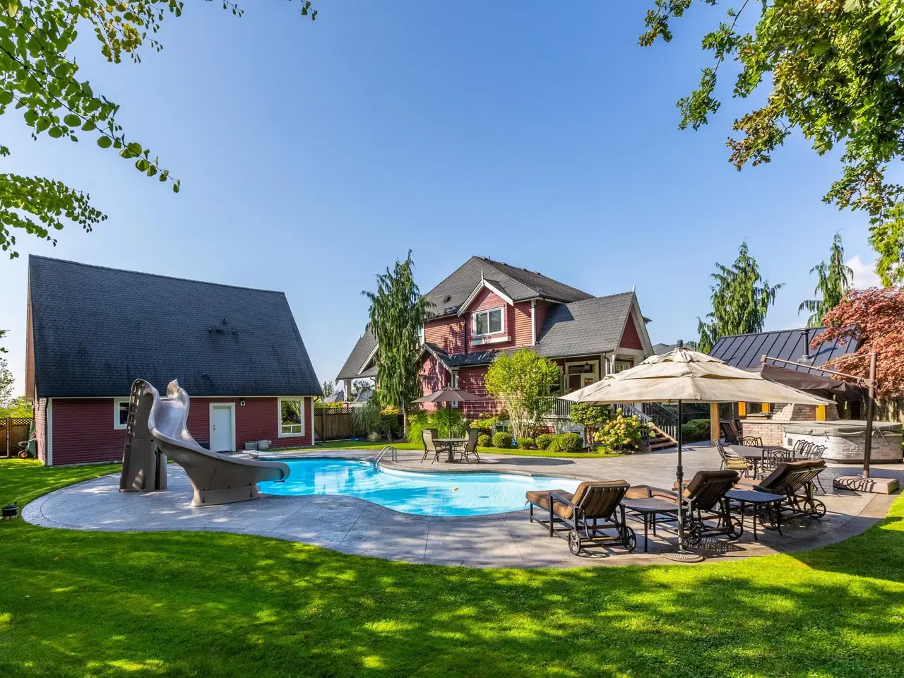 Stunning family home in UPPER MURRAYVILLE! Featuring natural stone countertops, wide plank hardwood floors, theater room, 9 bedrooms, 8 bathrooms, new heat pump and too many special features to mention. Must See lush backyard oasis with an inground pool, fire pit, beautiful garden seating areas and a covered outdoor kitchen and fireplace—perfect for entertaining. The 2 bedroom basement suite and a 2 bedroom in-law space with a loft, gives you ample room for the entire family. Private workshop with a powder room, plus garage space for 5 vehicles. Live on this meticulously maintained nearly 1 acre in Historic Murrayville now, subdivide later. A truly rare opportunity!