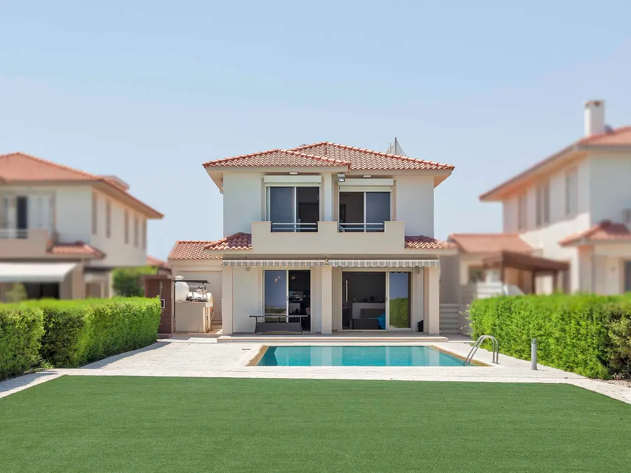 Luxurious five Bedroom Beachfront House for Sale in Pervolia, Larnaca. Just 70m from the beach, close to Kiti village amenities, with easy access to Larnaca-Limassol motorway. Elevated location minutes from Pervolia's finest sandy beaches and near Larnaca airport. The house features 5 bedrooms, open plan kitchen, living, dining, 1 ground floor bedroom, 4 spacious bedrooms upstairs with en suite showers, 6WC, double glazed windows, appliances, solar photovoltaic panels for pool. Includes BBQ area, garden, covered parking. Renovated in 2021. Residential, quiet area with mesmerizing sea view.