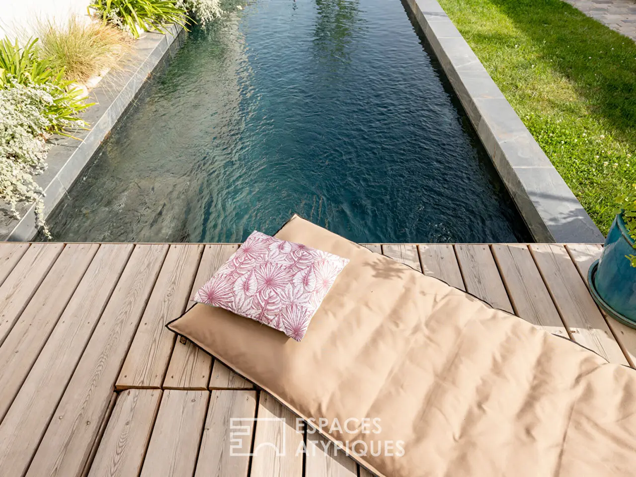 At the front of the plot, a completely independent studio offers a flexible space, ideal for accommodating a freelance professional, an independent teenager, or a passing guest. It features a bright living room, an adjoining bathroom, and a separate toilet. The main house, at the back of the plot, opens onto a private, planted garden, not overlooked, featuring a slate swimming pool and a wooden terrace inviting you to relax.