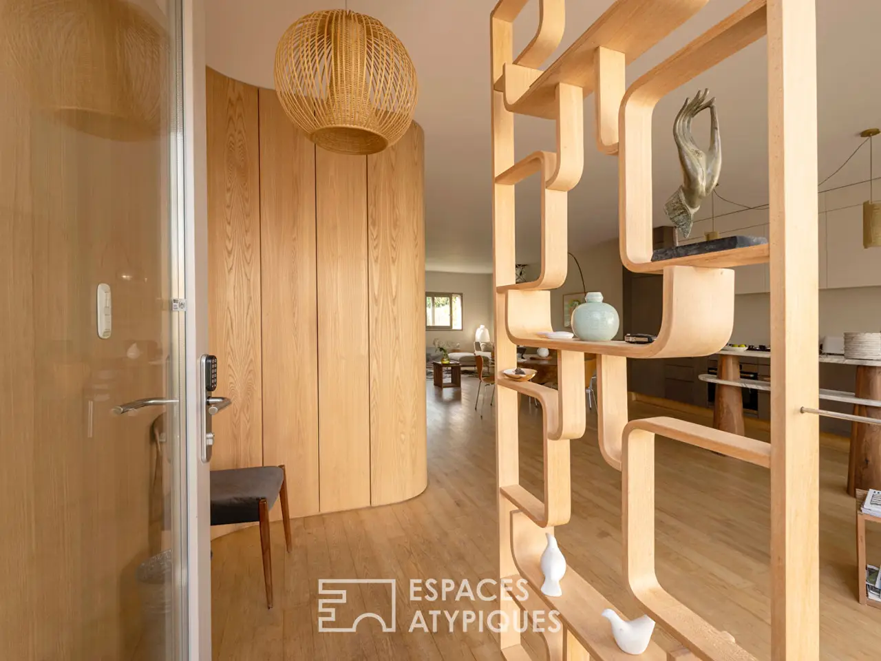 The ground floor features an entrance hall with storage, a spacious living room bathed in light thanks to large bay windows, and a custom-designed kitchen designed by a carpenter, where every detail has been designed with a contemporary and functional spirit. A fitted laundry room with access to a second rear garden, as well as a separate toilet with a washbasin, complete this level.