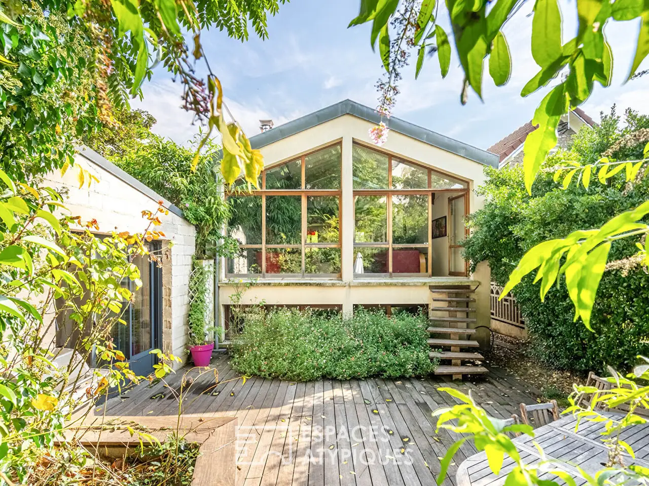 Ideally located in Perreux sur Marne, between the city center and the RER E station of Nogent-Le Perreux, this house from the 40s has been completely reinterpreted to give birth to a 131.90 sqm loft where contemporary and vintage are harmoniously combined. On the raised ground floor, a magnificent 70sqm plateau offers up to 5m of ceiling height, benefiting from constant brightness thanks to its large bay window and skylights. The combination of wood, metal and concrete combine perfectly to offer an inimitable architectural style. The equipped kitchen opens onto the living room arranged in open space where the living room and the dining room are harmoniously organized. This reception area benefits from a breathtaking view of the terrace and the west-facing garden. From this plateau, a remarkable custom-designed wooden staircase leads upstairs, giving access to a large bedroom whose old-world charm is preserved by its beams and slightly sloping ceiling. In addition, a spacious shower room with WC, decorated with red and white ceramic tiles, gives it a resolutely retro style. On the mezzanine, a second bright bedroom of 19sqm is revealed, whose large openings offer a bucolic view of a pretty flower bed and the terrace. A custom-designed, rounded bathroom with WC completes this level. In the garden, a second 70sqm house in its raw state with sliding aluminum glass roofs and a zinc roof offers infinite potential: to accommodate the family, practice your liberal activity or set up an artist's studio. On the garden level, a workshop and a garage enhance this property. Quality insulation and double glazing ensure excellent energy performance, rated C, thus guaranteeing thermal comfort throughout the year and energy savings. This atypical loft with its architectural style and bucolic setting offers a modern and friendly living space. RER E Nogent le Perreux 5 minutes walk Shops 500m away REF. 7832 Additional information * 4 rooms * 2 bedrooms * 2 bathrooms * Floor : 2 * 2 floors in the building * Outdoor space : 414 SQM * Property tax : 2 381 €