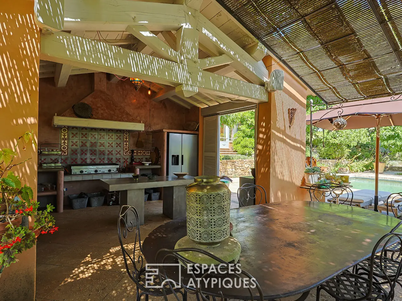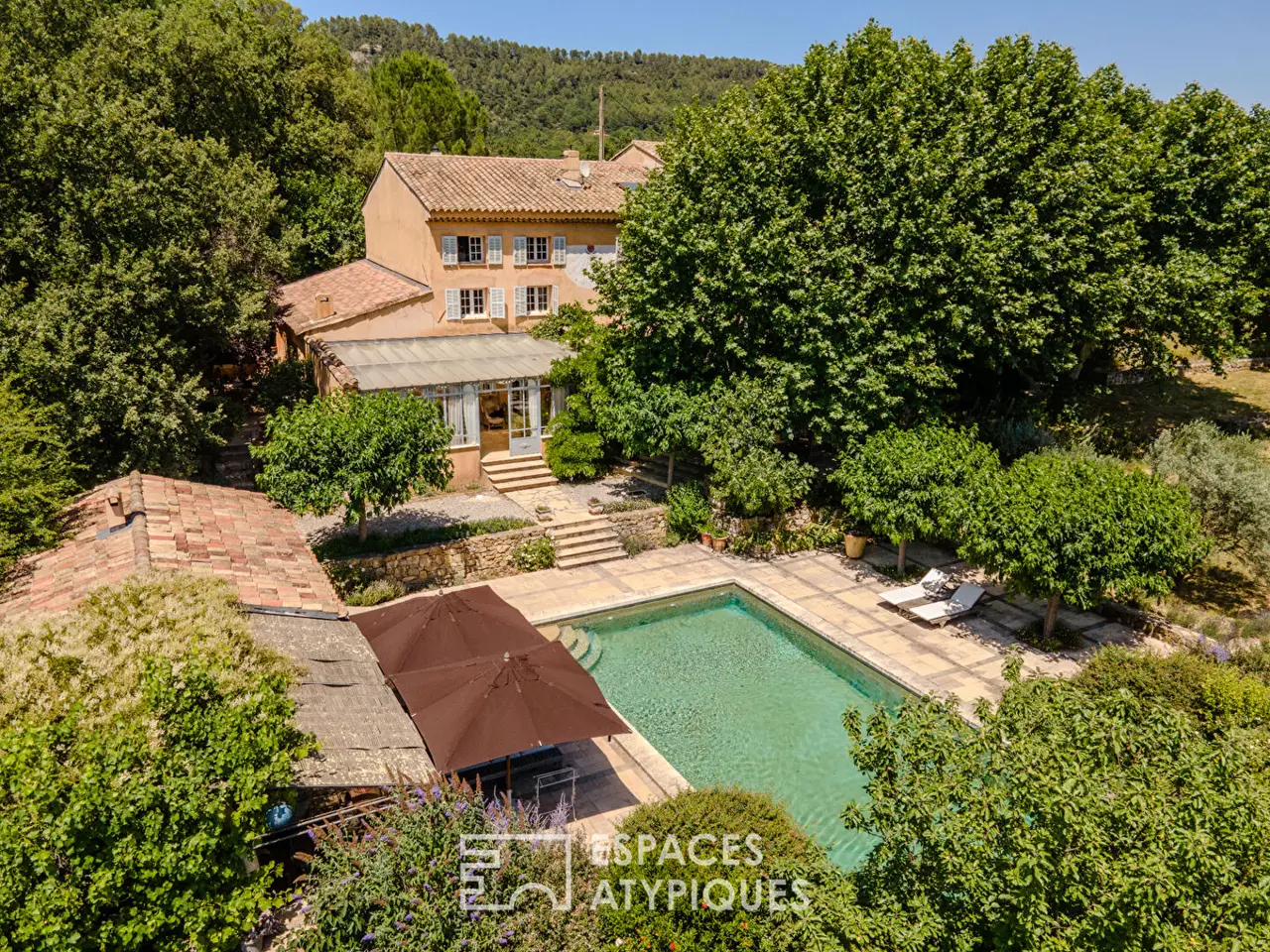 In the heart of abundant nature made up of vineyards and forests, in a reserved and quiet location, you will find this magnificent property of 500m2 steeped in history. From the 18th century, this south-facing stone bastide is built on an estate of more than one hectare, planted with olive trees and many fruit trees. The property, renovated with care and with a particular affinity for noble materials, is composed of: A sumptuous entrance, a dining room with its wine cellar, a beautifully decorated cozy living room, which perfectly accompanies the fireplace, a very spacious kitchen which confirms the unique character of the property with its central travertine island, custom-designed wooden furniture, its cut stone sink and its magnificent cooking range! The ground floor ends with a magnificent old-fashioned ironworker's veranda, a utility room and a large workshop opening onto a shaded terrace. Different levels bring us to a spacious bedroom, a bathroom, a master suite with bathroom and dressing room, always accompanied by quality materials, a relaxation lounge and an office with magnificent wooden bookcases. On the other wing of the house, we discover an additional bedroom as well as an apartment with living room, kitchen, bedroom and bathroom, which can have independent access. The property promises pleasant moments of relaxation and entertainment with its magnificent stone swimming pool and its pool house, its walks along the river and its vegetable garden. In a quiet and bucolic setting, you will benefit from quick access to the highway and all amenities. Located 45 minutes from the coast and Hyeres airport, and 50 minutes from Aix-en-Provence. CLASSE ENERGIE : D227/ CLASSE CLIMAT : D39. Estimated average amount of annual energy expenditure for standard use, established from energy prices for the year 2021: between 11620€ and 15810€ REF. 7071 Additional information * 10 rooms * 4 bedrooms * 1 bathroom * 3 shower rooms * Floor : 3 * 3 floors in the building * Outdoor space : 11000 SQM * Parking : 20 parking spaces * Property tax : 4 431 €