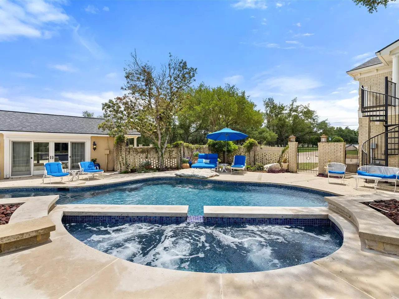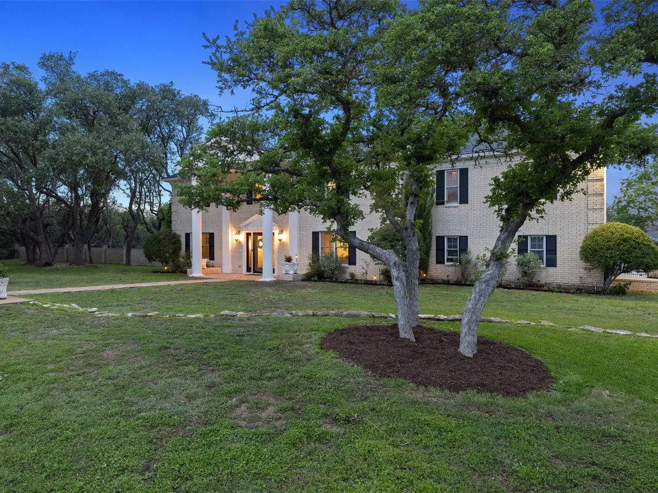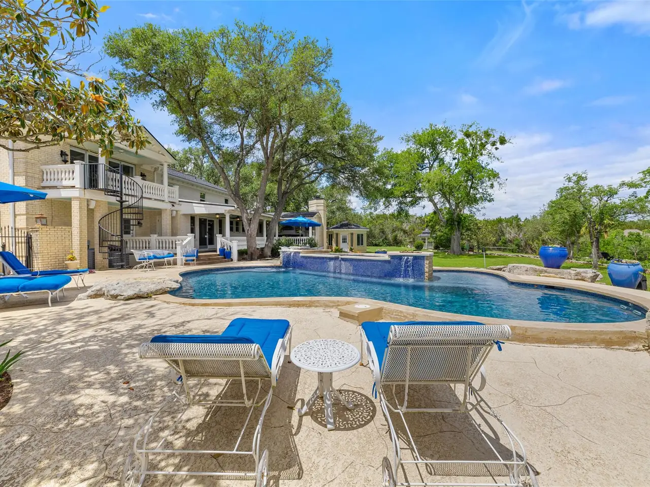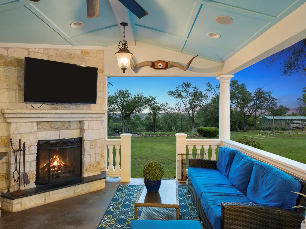 Nestled on a scenic ridge in Leander, this stunning 4-acre Hill Country estate offers sweeping panoramic views and luxurious indoor-outdoor living. Surrounded by mature oaks and native landscaping, the elegant brick and stucco home feels like a private retreat, just minutes from Lake Travis, top-rated schools, and the amenities of Cedar Park and Northwest Austin. Nature lovers will appreciate the nearby Brushy Creek Regional Trail and the Louis Rene Barrera Indiangrass Wildlife Sanctuary. Inside, natural light floods the open-concept layout through expansive windows that frame breathtaking vistas. The gourmet kitchen is a chef's dream with high-end appliances, granite countertops, and custom cabinetry, flowing seamlessly into a spacious living area anchored by a striking brick fireplace. Additional highlights include skylights, surround sound, a formal dining room with its own fireplace, a butler's pantry, and a wine refrigerator. The primary suite is a true sanctuary with a spa-like bathroom, terrace access, and a private spiral staircase. Spacious guest bedrooms offer comfort and privacy, while the outdoor space is built for entertaining: a large covered patio, sparkling pool, outdoor kitchen with built-in grill, fireplace, and integrated sound system. A detached, climate-controlled office offers a quiet workspace, while the two-car garage with epoxy flooring is ideal for a gym, second office, or workshop. The charming guest house includes a full kitchen, bathroom, and its own two-car garage. Rounding out the estate is a full sport court for basketball or pickleball and a versatile barn with stables and enclosed storage. This estate is a rare blend of Hill Country charm and modern luxury--just moments from Austin.