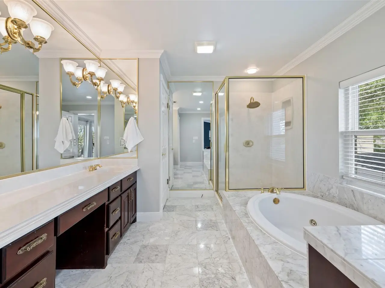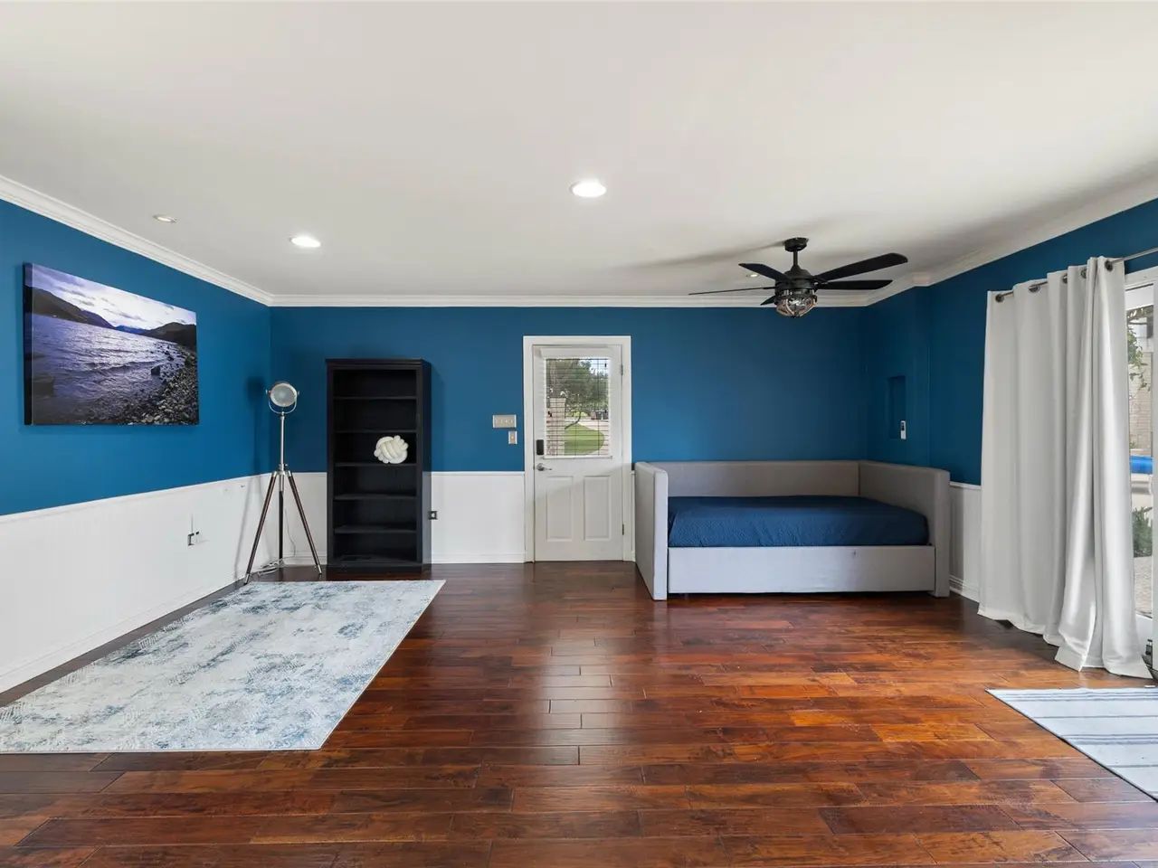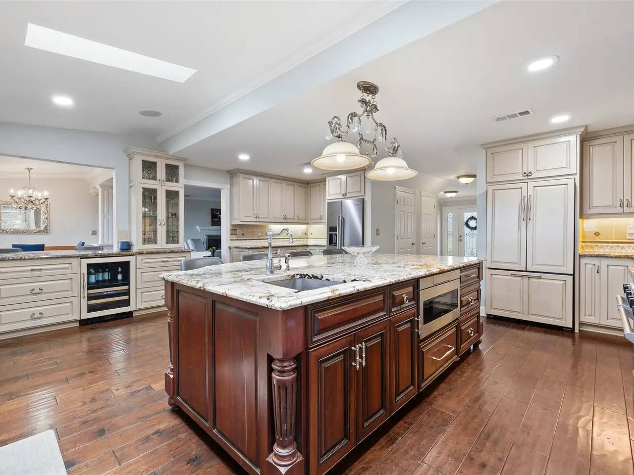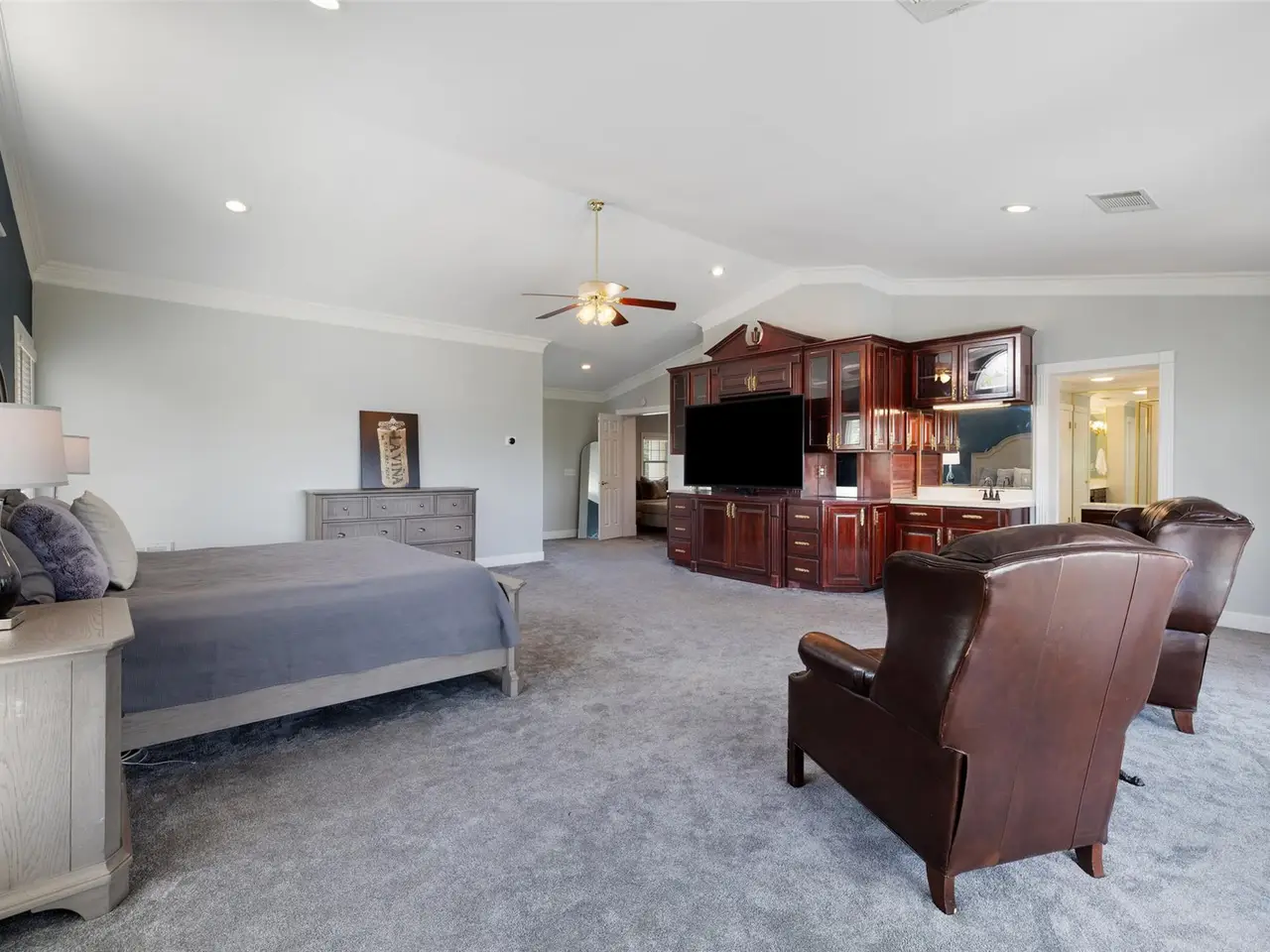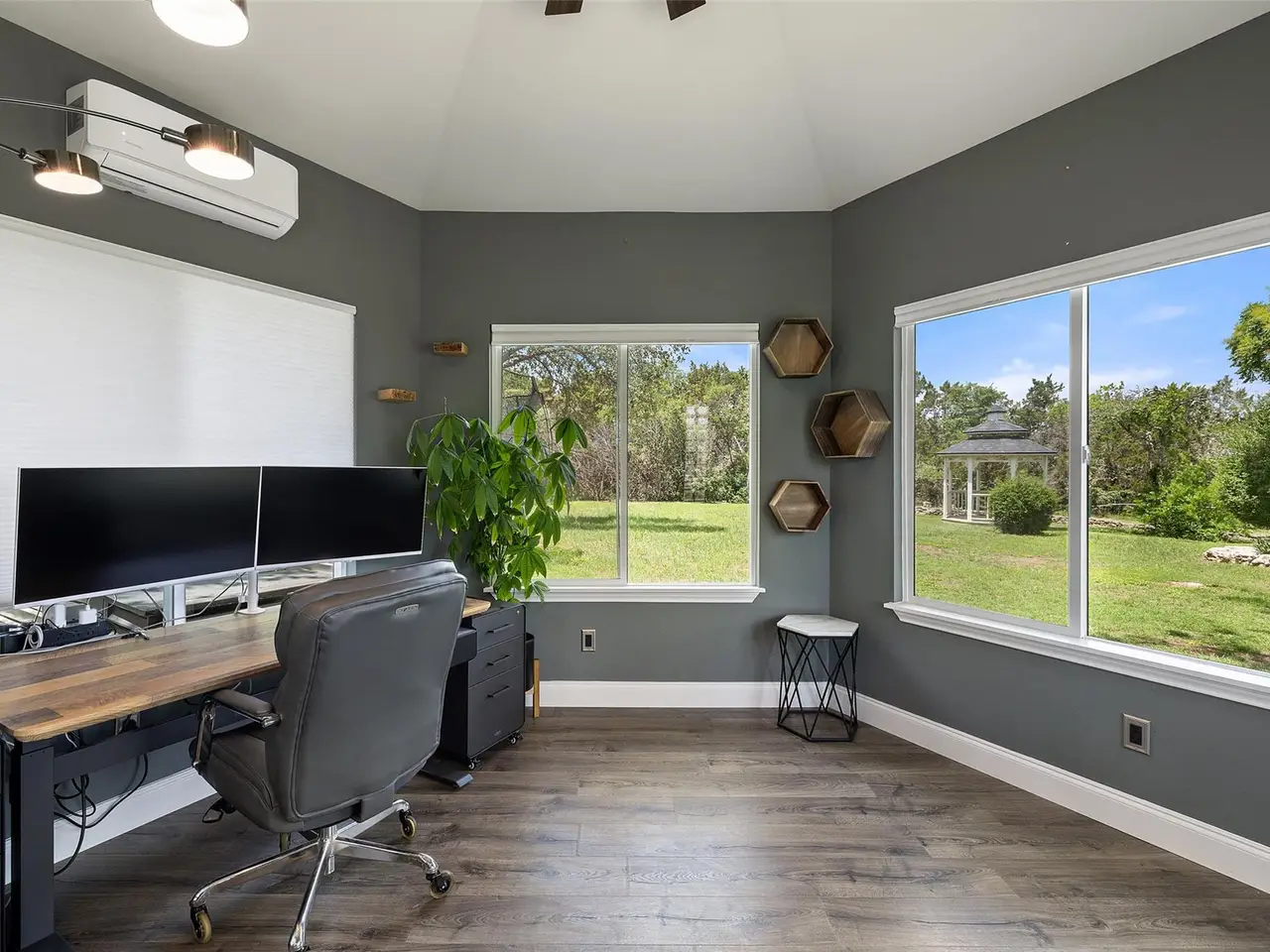 Nestled on a scenic ridge in Leander, this stunning 4-acre Hill Country estate offers sweeping panoramic views and luxurious indoor-outdoor living. Surrounded by mature oaks and native landscaping, the elegant brick and stucco home feels like a private retreat, just minutes from Lake Travis, top-rated schools, and the amenities of Cedar Park and Northwest Austin. Nature lovers will appreciate the nearby Brushy Creek Regional Trail and the Louis Rene Barrera Indiangrass Wildlife Sanctuary. Inside, natural light floods the open-concept layout through expansive windows that frame breathtaking vistas. The gourmet kitchen is a chef's dream with high-end appliances, granite countertops, and custom cabinetry, flowing seamlessly into a spacious living area anchored by a striking brick fireplace. Additional highlights include skylights, surround sound, a formal dining room with its own fireplace, a butler's pantry, and a wine refrigerator. The primary suite is a true sanctuary with a spa-like bathroom, terrace access, and a private spiral staircase. Spacious guest bedrooms offer comfort and privacy, while the outdoor space is built for entertaining: a large covered patio, sparkling pool, outdoor kitchen with built-in grill, fireplace, and integrated sound system. A detached, climate-controlled office offers a quiet workspace, while the two-car garage with epoxy flooring is ideal for a gym, second office, or workshop. The charming guest house includes a full kitchen, bathroom, and its own two-car garage. Rounding out the estate is a full sport court for basketball or pickleball and a versatile barn with stables and enclosed storage. This estate is a rare blend of Hill Country charm and modern luxury--just moments from Austin.
