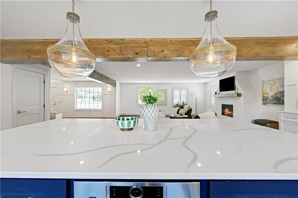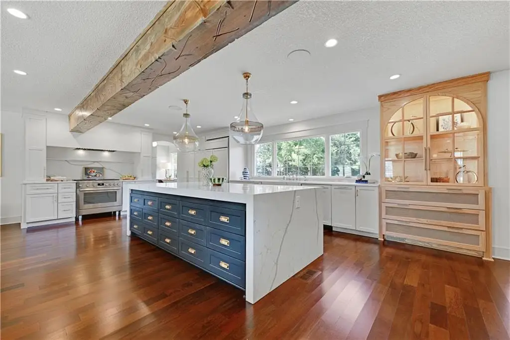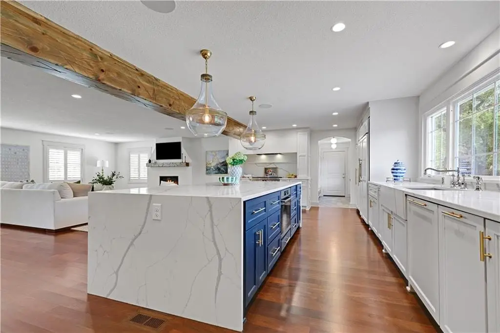 Stunning, remodeled 1.5-story estate on a beautifully landscaped corner lot spanning over 1 acre in the heart of Leawood. This home has been thoughtfully redesigned with extensive renovations, floor plan enhancements, and premium upgrades throughout. Upon entry, a formal living room and dining room, with elegant fireplaces create inviting spaces for both everyday living and entertaining. A custom wet bar with beverage fridge adds to the homes hosting appeal. The show-stopping chef's kitchen features a quartz waterfall island, top-of-the-line appliances, and an oversized window overlooking the private backyard. Adjacent to the kitchen, a well-appointed mud hall includes built-in cabinetry, a desk, cubbies, connecting to the spacious three-car carriage garage. The main-level primary suite offers peaceful backyard views, two walk-in closets (one with its own washer and dryer), and a fully renovated spa-like bathroom with a private water closet. Upstairs, three large bedrooms each include ensuite bathrooms and custom closets. A second laundry room w/ washer/dryer that stays completes the upper level. High-end finishes include Brazilian hardwood floors, designer lighting, quartz and quartzite surfaces, surround sound on the main floor, and custom millwork. Major mechanical updates include a brand-new septic system, partial concrete driveway, new water heater, new sprinkler system in backyard and professional landscaping. The property is enclosed by 558 feet of 5-foot steel fencing. With the newly installed septic system, the property is now perfectly suited for the addition of a poolan ideal setup for creating your dream backyard retreat. A rare opportunity to own a fully updated, move-in ready home on a premier Leawood estate lot.