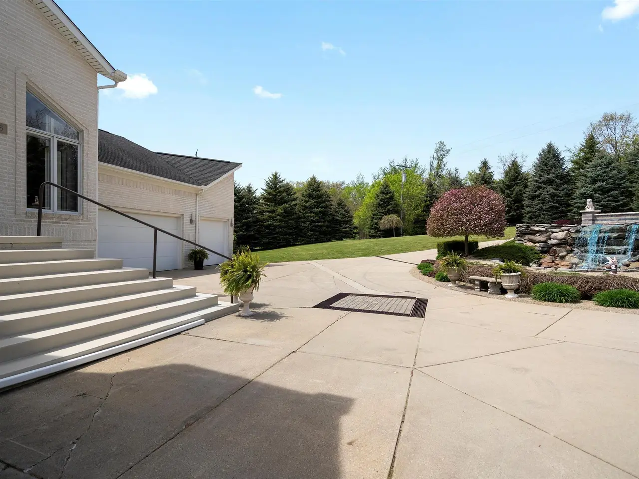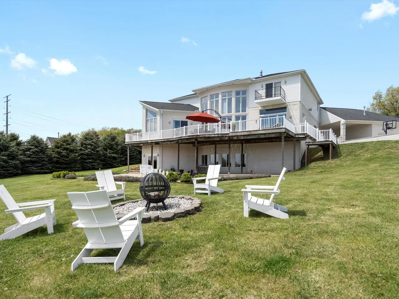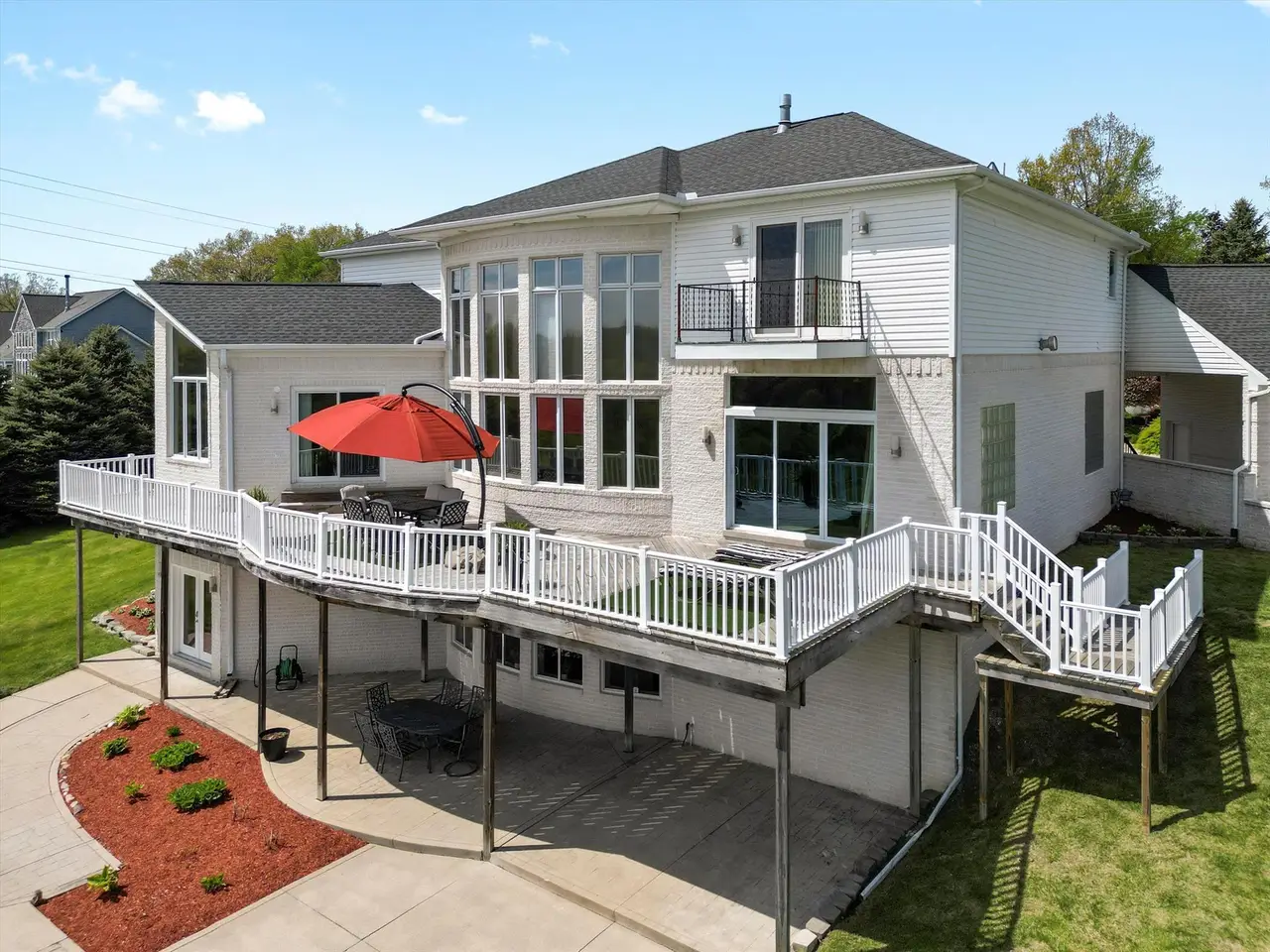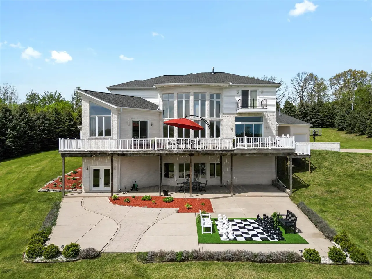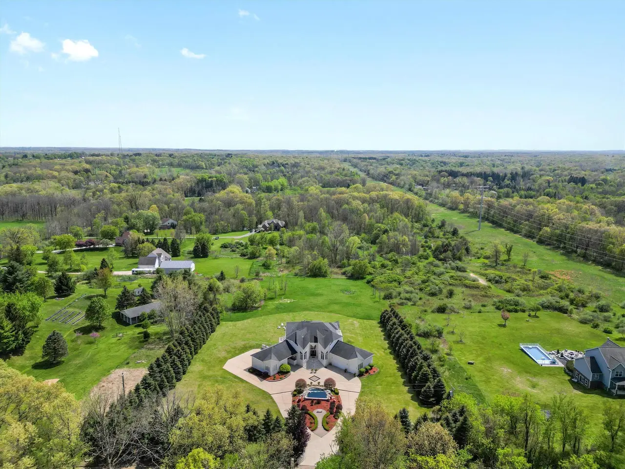 Contemporary Modern estate on 3+ private acres in Addison Township. This spacious home offers 5 bedrooms, 4 full baths, and 1 half bath, including two primary suites—one on the main floor and one on the second level. Open floor plan with clean lines and abundant natural light. The home features a 5-car garage setup with a separate 2-car and 3-car garage. A circular driveway with a water fountain feature provides an elegant entrance. Enjoy outdoor living on the expansive deck that spans the entire back of the home, overlooking a serene property with 100 planted pine trees for added privacy and beauty. The finished walk-out basement includes a home gym, game room, second kitchen, and full bathroom, offering flexible living and entertaining options. Located in a quiet, natural setting yet convenient to Lake Orion, Rochester, and area amenities. This property combines modern style, function, and seclusion.