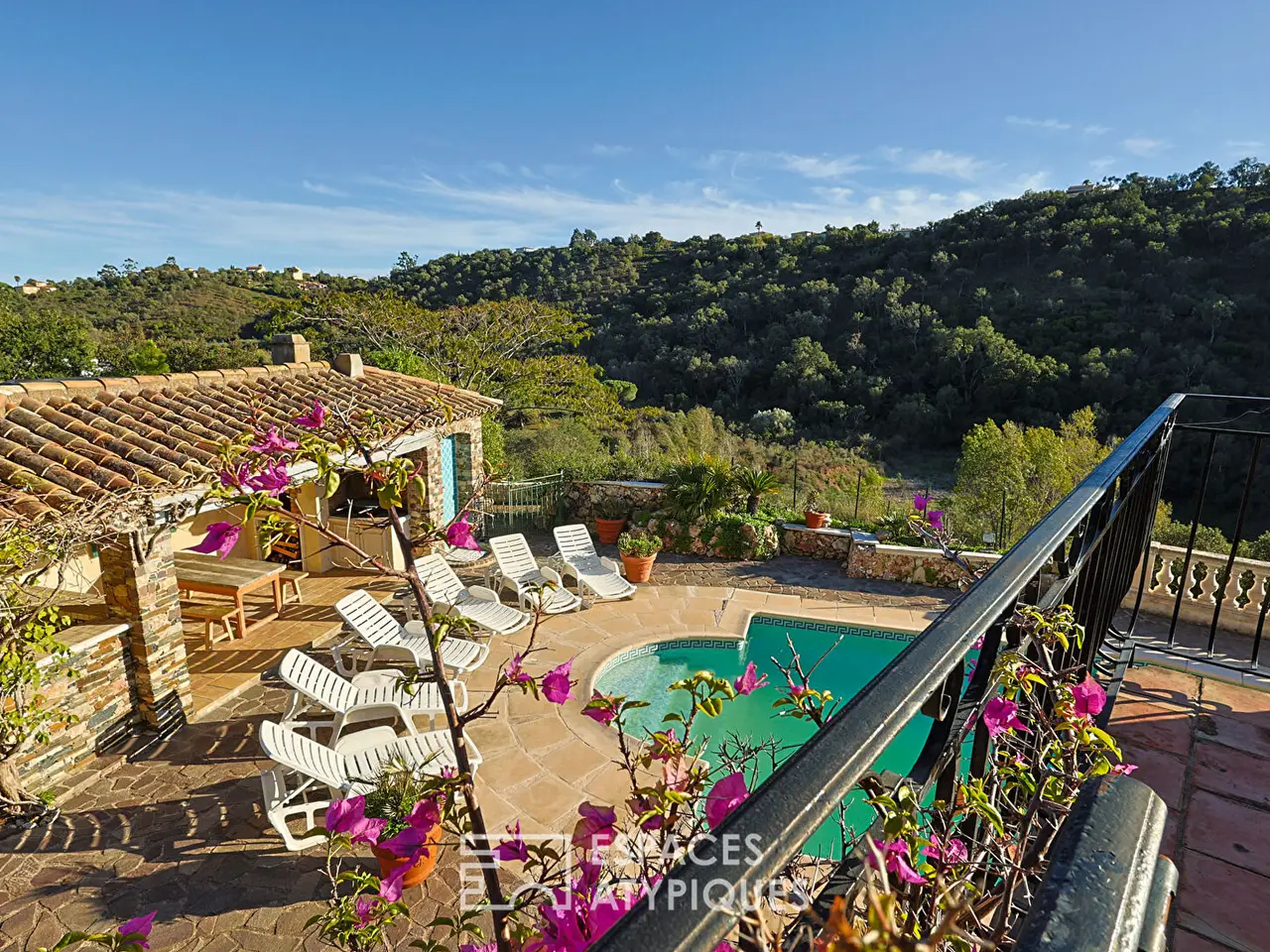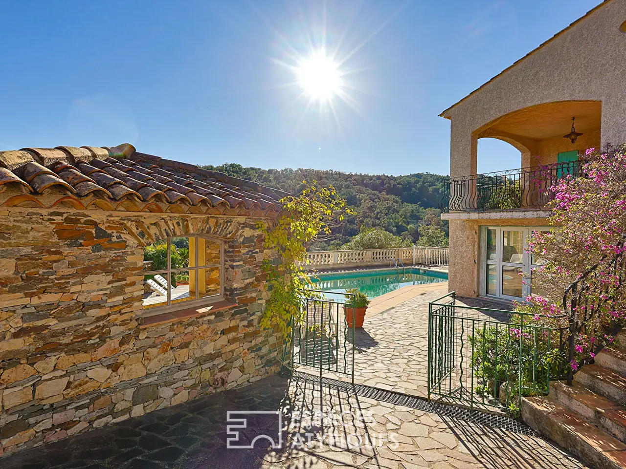 Family home with swimming pool and pool houseNestled in an idyllic setting in Les Issambres, this Provencal family home of approximately 335 m2 captivates with its authenticity and peaceful atmosphere. Situated on a vast plot of 8,445 m2, including 2,200 m2 landscaped around the house, it offers breathtaking views of the surrounding nature. Its outdoor space, complete with a swimming pool and pool house, invites relaxation and contemplation in a preserved green setting.Spread over three levels and facing south, it enjoys total privacy, without direct vis-a-vis, in a peaceful cul-de-sac, just 1.5 km from the sea and amenities.On the ground floor and first floor, you will discover the main residence of approximately 185 m2. The entrance leads to a spacious living-dining room of 50 m2 with fireplace, giving access to two terraces, one covered and the other outdoors. A spacious kitchen of approximately 15 m2 offers multiple layout possibilities.The sleeping area includes three spacious bedrooms with built-in wardrobes, two of which open onto an open-air terrace.Upstairs, an elegant master suite of more than 26 m2, with its dressing room, bathroom and separate toilet, opens onto a pleasant Tropezian terrace.The garden level houses three apartments, including two studios of 21 m2 with mezzanine, as well as a T2 of 37 m2. In addition, a 70 m2 space with a fireplace can be redesigned to accommodate a gym, a home cinema, an office, or other.Outside, a 4.5 x 11 meter chlorine swimming pool is surrounded by a well-equipped pool house, including a bread oven, barbecue, outdoor shower, toilets and laundry area.This property, offers immense potential, whether to accommodate a large family in an exceptional living environment or for a rental investment project.ENERGY CLASS: C (149 kWh/m2/year) / CLIMATE CLASS: A (4 kg CO2/m2/year). Estimated average amount of annual energy expenditure for standard use, established based on energy prices for the year 2021: between 2930 euros and 4010 euros.Contact: Manuela MILLIENNE Agency DirectorREF. 10290Additional information* 9 rooms* 7 bedrooms* 2 bathrooms* 5 shower rooms* 2 floors in the building* Outdoor space : 8445 SQM* Parking : 8 parking spaces* Property tax : 5 567 €Energy Performance CertificatePrimary energy consumptionc : 149 kWh/m2.yearHigh performance housing*A*B*149kWh/m2.year4*kg CO2/m2.yearC*D*E*F*GExtremely poor housing performance* Of which greenhouse gas emissionsa : 4 kg CO2/m2.yearLow CO2 emissions*4kg CO2/m2.yearA*B*C*D*E*F*GVery high CO2 emissionsEstimated average amount of annual energy expenditure for standard use, established from energy prices for the year 2021 : between 2930 € and 4010 €Agency feesThe fees include VAT and are payable by the vendorMediatorMediation Franchise-Consommateurswww.mediation-franchise.com29 Boulevard de Courcelles 75008 ParisInformation on the risks to which this property is exposed is available on the Geohazards website : www.georisques.gouv.fr