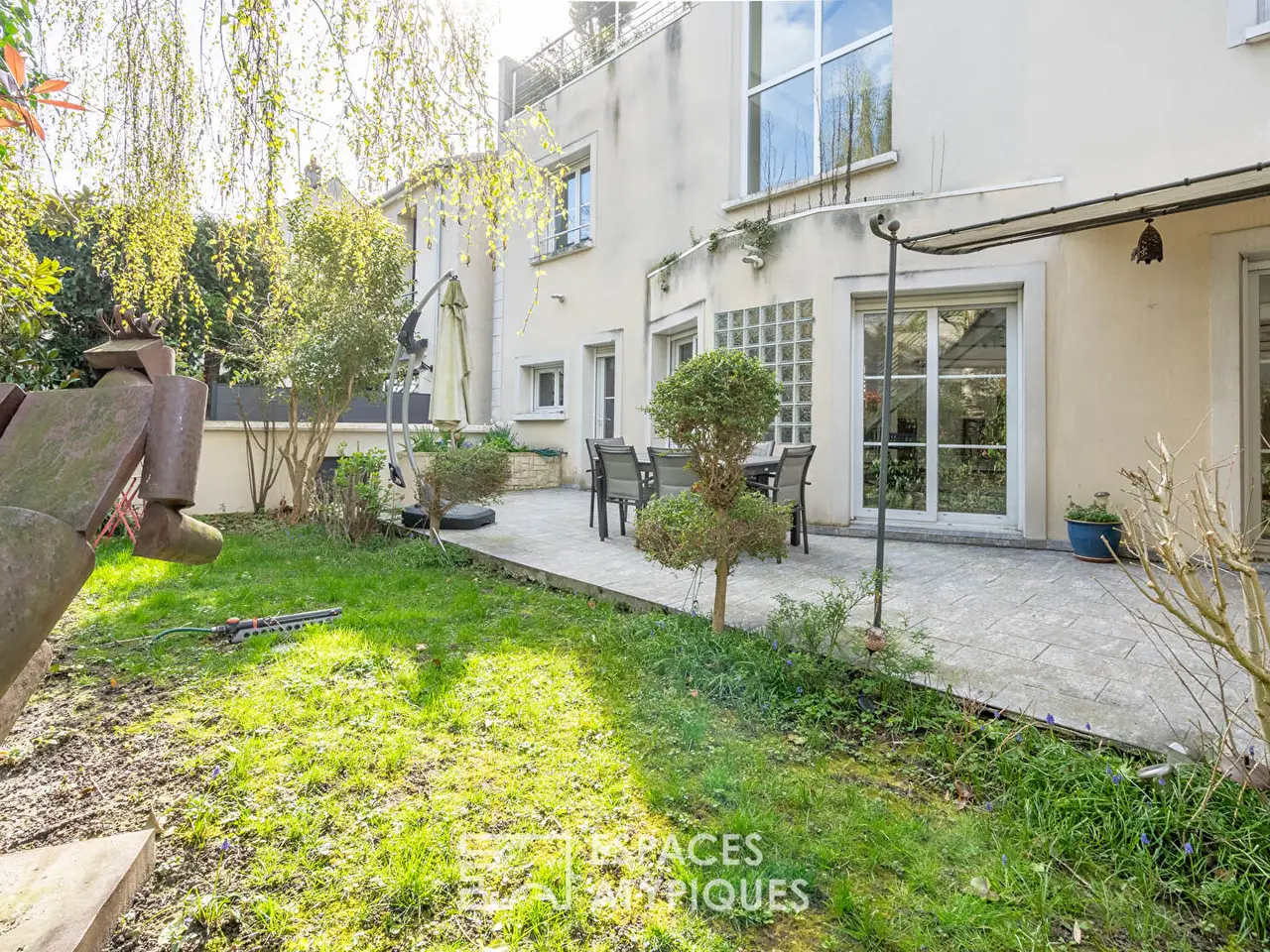Located in a quiet area near the Lilas town hall, this architect-designed house with a surface area of ??approximately 200m2, a true work of art on four levels designed to offer an exceptional living space. A large living room of approximately 47m2 and benefiting from large openings to the outside providing constant light, extends under 8 meters of ceiling height creating a feeling of freedom. An open kitchen of approximately 12m2 with direct access to the garden of approximately 95m2 and the terrace, an office, storage space and toilets complete this level. On the first level, on the one hand there are two bedrooms sharing a bathroom and a toilet and on the other hand a walkway leading to the master suite with a bathroom equipped with a spa bath, a shower, dressing room and toilet, offering comfort and privacy. On the second level, a second walkway leads to a fourth bedroom as well as a rooftop of around 40m2, ideal for enjoying the sun. A large basement of approximately 78m2 including a games room, a garage, a wine cellar, toilets and a laundry room complete the package. Metro line 11: Serge Gainsbourg at 350 meters REF. 11665 Additional information * 7 rooms * 4 bedrooms * 2 shower rooms * 2 floors in the building * Outdoor space : 252 SQM * Property tax : 3 350 € Energy Performance Certificate Primary energy consumption c : 144 kWh/m2.year High performance housing
