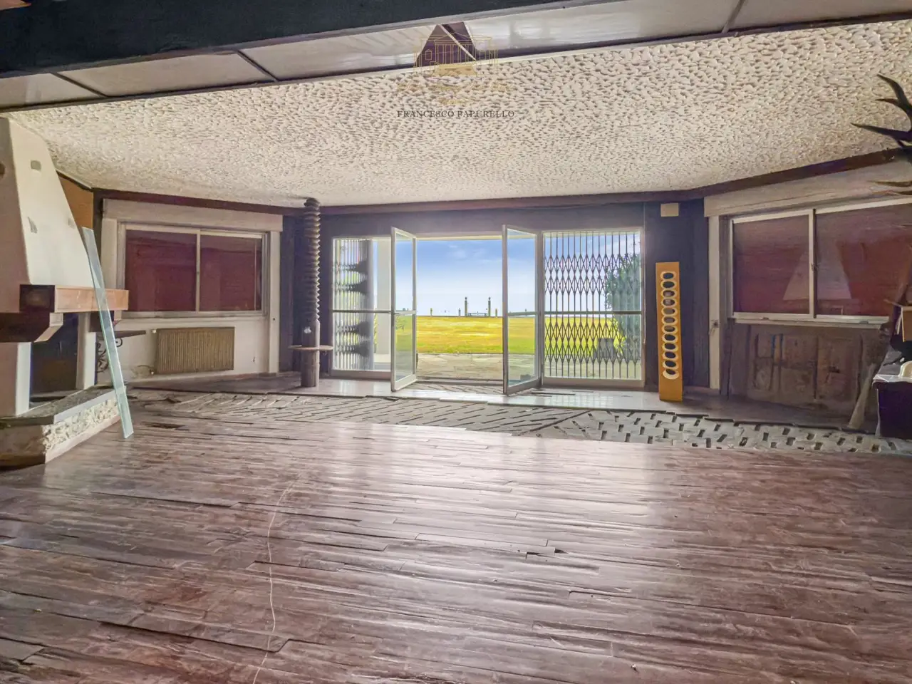 Large living room with fireplace opening to garden