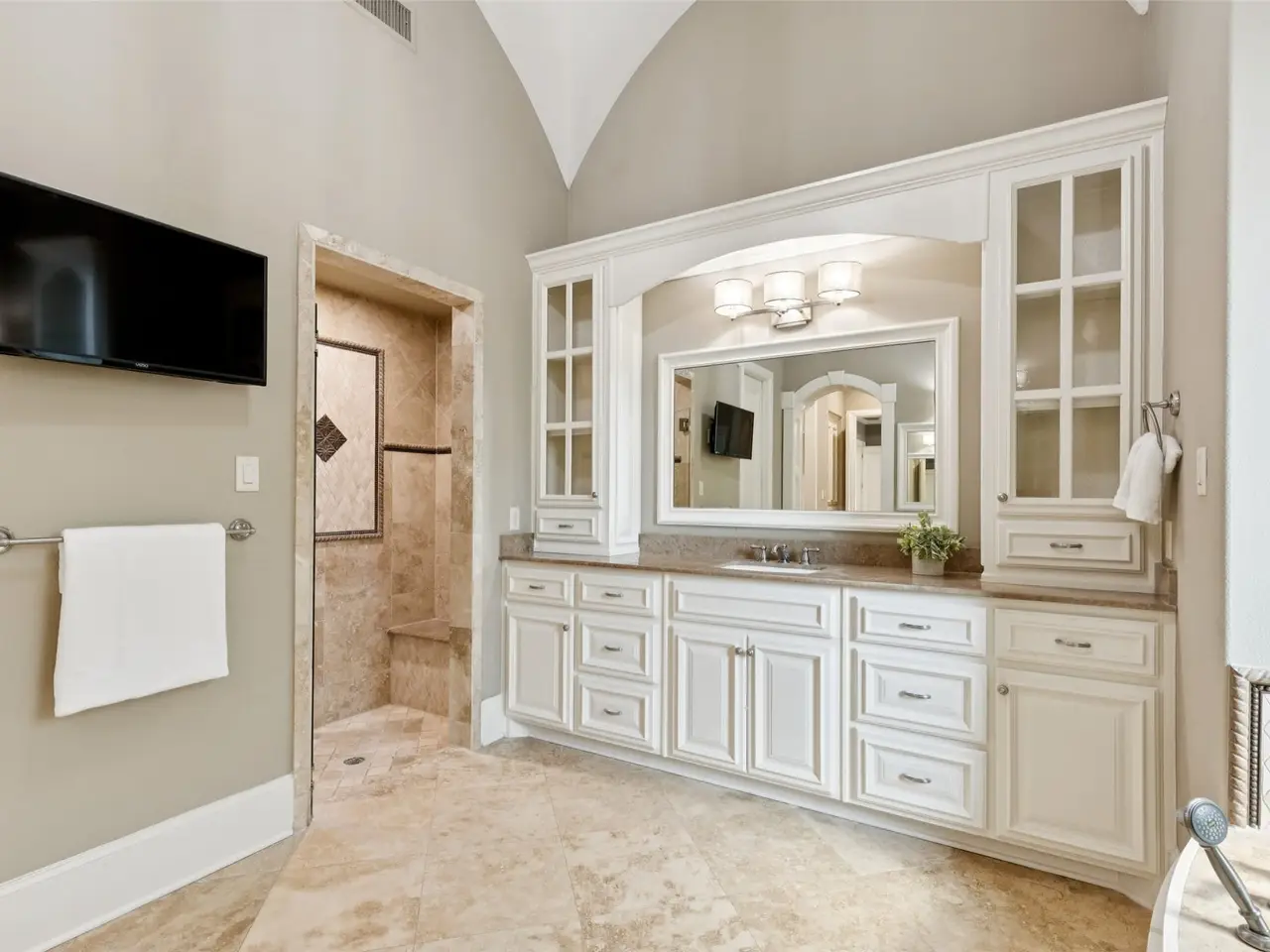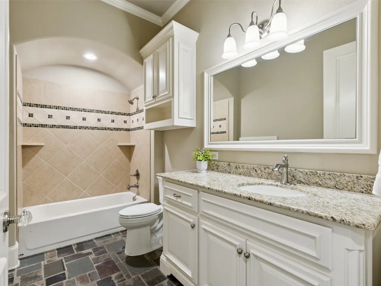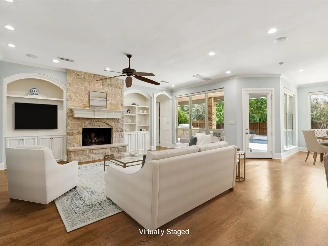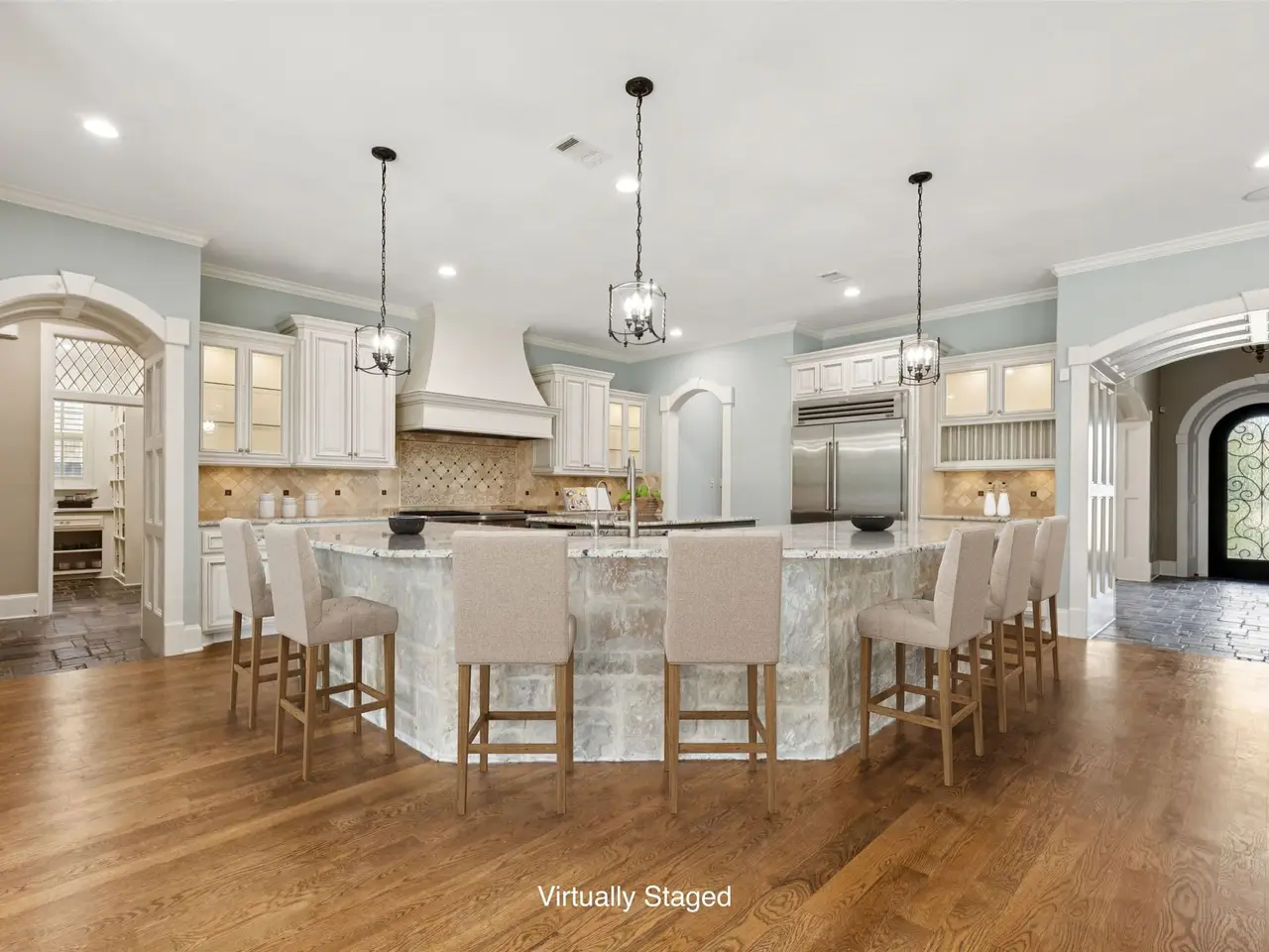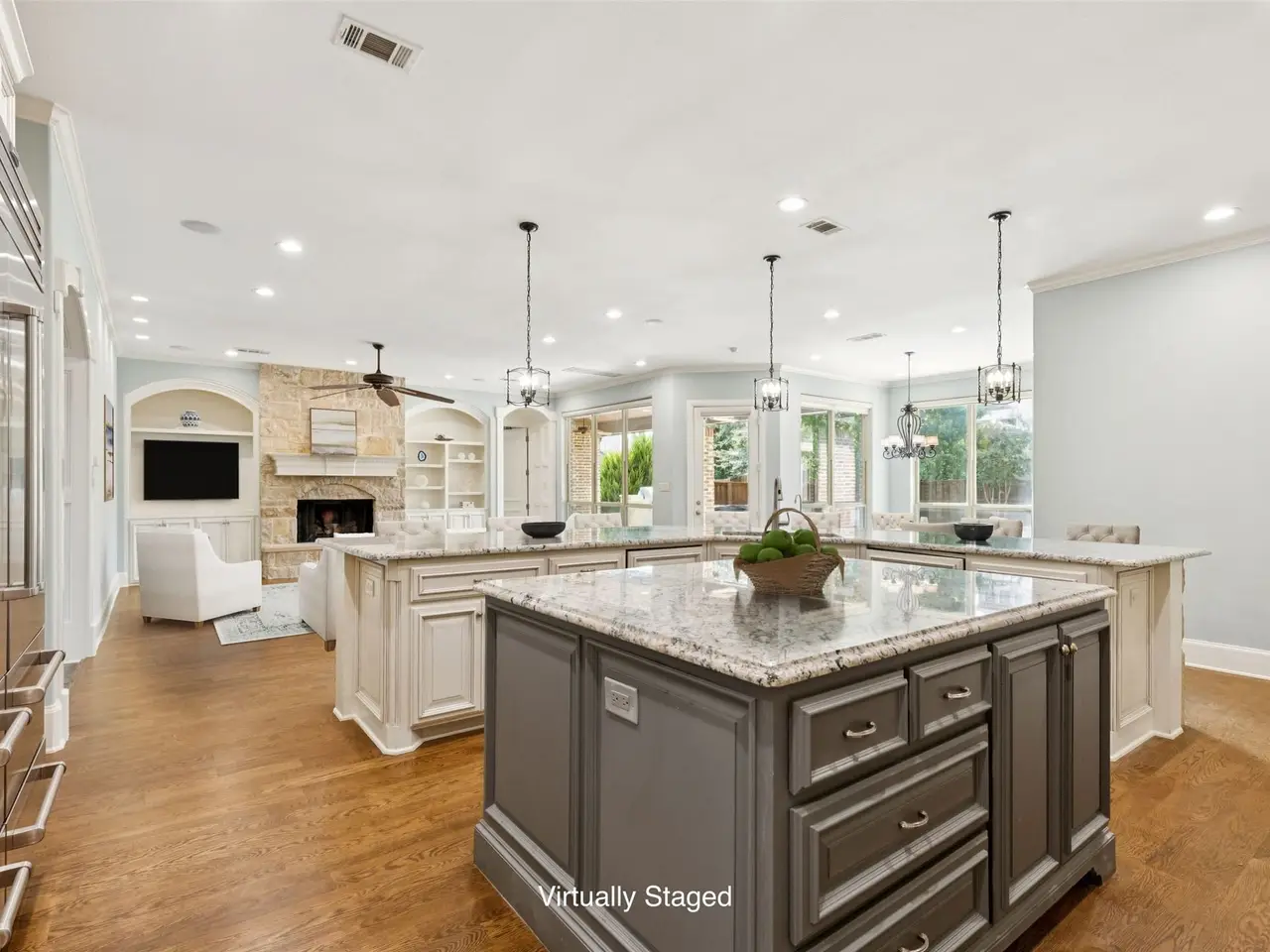Beautifully designed with remarkable attention to detail, this Castle Hills home offers over 5,300 square feet of living space on a landscaped 0.325-acre lot. The flexible floor plan includes five bedrooms plus a private office, elegant dining areas, a spacious game room, and a fully equipped media room. The gourmet kitchen is the centerpiece of the home with built-in refrigerator, commercial-grade range, double ovens, expansive island, and walk-in pantry. It flows seamlessly into the family room with stone fireplace and views of the backyard. The primary suite on the main level is a private retreat featuring dual vanities, soaking tub, separate shower, and a generous walk-in closets with secondary washer and dryer connections. Highlights include hardwood and stone floors, wainscoting, decorative lighting, granite counters, multiple staircases, and a 3-car garage with alley access. Smart wiring, built-ins, and abundant storage add to the homes functionality. Outdoor living is exceptional with a sparkling pool, outdoor shower, covered patio, built-in grill, and full outdoor living centerperfect for entertaining or relaxing. The landscaped yard offers privacy and plenty of space to enjoy year-round. Located in the desirable Castle Hills community, residents enjoy access to walking trails, lakes, parks, golf, tennis, and a vibrant town center with shops and dining. Zoned to Lewisville ISD schools, this property combines luxury, comfort, and convenience in one of North Texas premier neighborhoods.