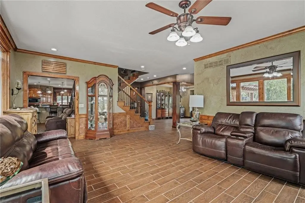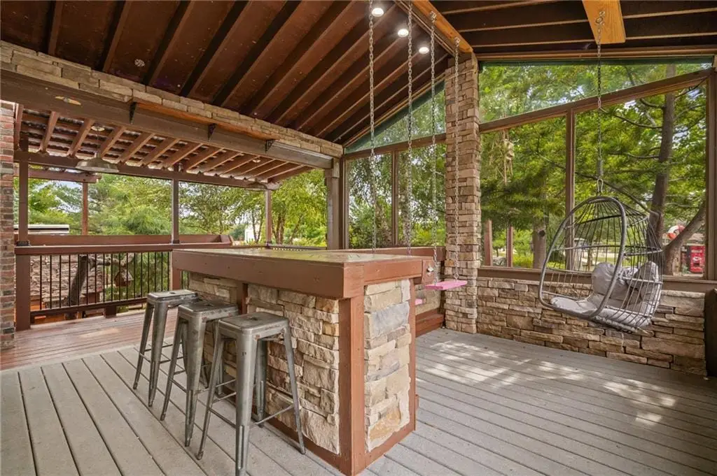 Unmatched in character and amenities, this gated 5-acre Lone Jack property is designed for those who love to entertain, live outdoors, and need space for a home-based business. The grounds are extraordinary, with two large ponds - one offering a sandy beach, dock, playhouse with hurricane deck, and zip line, the other showcasing a dramatic 12-foot stone waterfall. Multiple weeping willows surround the water, creating a picturesque, park-like setting. Outdoor living is unbelievable with a swimming pool, outdoor shower, festive poolside bar, basketball court, striped parking for nine cars, multiple firepits, fountains, and extensive landscaping and unique trees. A huge raised-bed garden with drip irrigation and automatic watering, vintage 1950s merry-go-round, playground and pergola framed with wisteria over the water complete the retreat. The 2006-built two-story home offers quality and comfort with hard surface flooring throughout the main level, five fireplaces, formal dining, office, and a hearth room/kitchen with island seating for five, Viking six-burner cooktop. French doors open to a fenced dog yard with pergola and hibachi grill. Upstairs, four bedrooms each enjoy private baths; the oversized primary suite boasts a fireplace, sitting area, private covered balcony with mini split, and a massive walk-in closet. The walkout lower level is built for gathering, with a theater, arcade, full bar, non-conforming fifth bedroom, full bath, and access to a saloon-style patio with hot tub and firepit. Complete set up for livestock and farm animals with fenced pen, multiple shelters and duck pond. The property also includes a new outbuilding with concrete floor, two large overhead doors, built-in compressor, and plumbing for living quarters - ideal for equipment storage, hobbies, or running a business. Meticulously maintained and set on blacktop, this one-of-a-kind estate combines resort-style living with everyday functionality - an entertainer’s paradise inside and out.