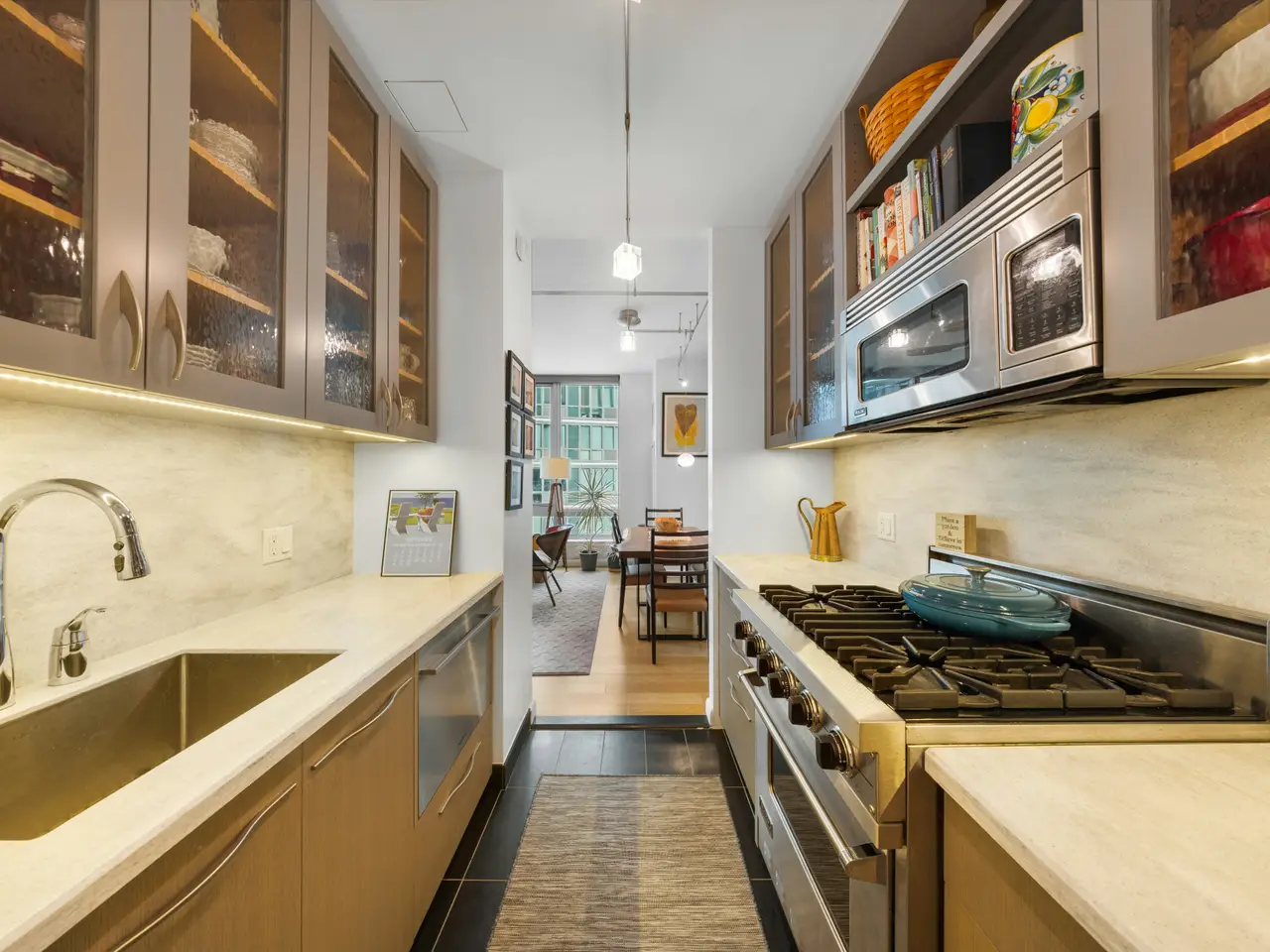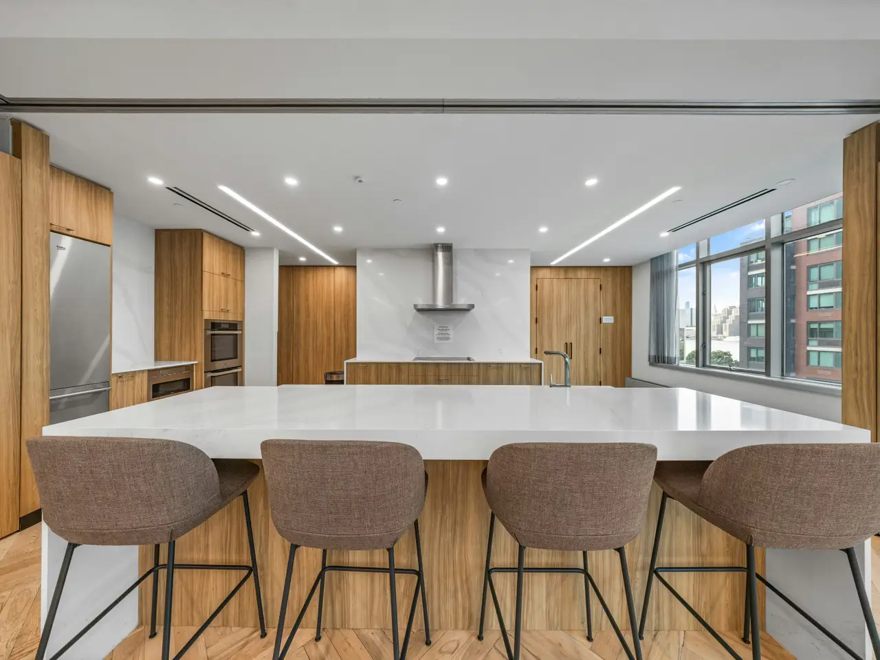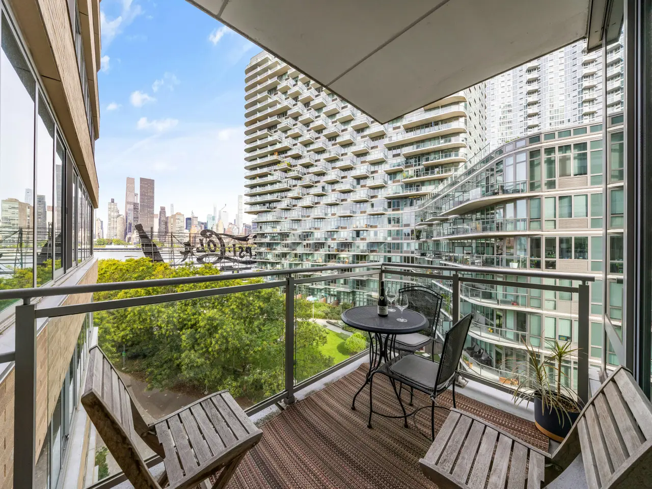 PLEASE NOTE: Sunday, 10/26, Open House from 3:30pm to 4:30pm is BY APPOINTMENT ONLY! Please be sure to schedule. This stunning 1BR/1BA at The View Condominium offers 777 sq.ft. of beautifully renovated space, plus a 66 sq.ft. west-facing balcony with spectacular sunsets over the East River and Manhattan skyline. Every inch of Unit 503 has been thoughtfully upgraded for style, comfort, and functionality, making it one of the most beautiful apartments in LIC on the market right now. The spacious layout features a king-sized bedroom (11'2" x 12'11"), a marble bathroom with soaking tub and shower, and a chef's kitchen equipped with a Viking range and microwave, Sub-Zero fridge, Fisher & Paykel dishwasher, and vented washer/dryer. What's more is the incredible work the owners did to create an even higher level of luxury. Extensive upgrades throughout include: -Custom Kitchen: Rift white oak and lacquer cabinets with art glass doors, built-in spice rack and wine storage, Corian countertops/backsplash, under-cabinet lighting, deep Kraus sink with Kohler fixtures, built-in water filter and soap dispenser, and added pantry space. - Bedroom: Closet space has been transformed! Luxurious custom built-in closet with built-in lighting, nine large drawers, full height shoe storage, pull down wardrobe racks, and more.Custom teak platform bed with six drawers, built-in nightstands, headboard with lighting, and blackout shades. -Living Room & Bath: A fold-down bar unit and liquor storage, as well as a custom floating shelf wall unit in fumed oak and rift white oak, and window treatments. Bathroom upgrades include a Corian and colored lacquer vanity with Kohler sink and faucet, and an extra deep medicine cabinet and mirror. -Throughout: Custom WAC lighting was added in the kitchen, living room, hallway, and foyer. Minka ceiling fans in both living room and bedroom. New HVAC units installed September 2025. The View is a full-service, 24/7 concierge building with one of LIC's best amenity packages: indoor pool, rooftop deck with grills, spa/sauna, fitness center with classes, golf simulator, screening room, game/music/content creating rooms, yoga/cycle/zen studios, and more. Unbeatable location just one stop to Grand Central via the 7 train or minutes by ferry to Manhattan and Brooklyn. Enjoy MoMA PS1, restaurants, shops, state-of-the-art modern library, and LIC's scenic waterfront park right outside your door. This is luxury living at its finest-welcome to The View!