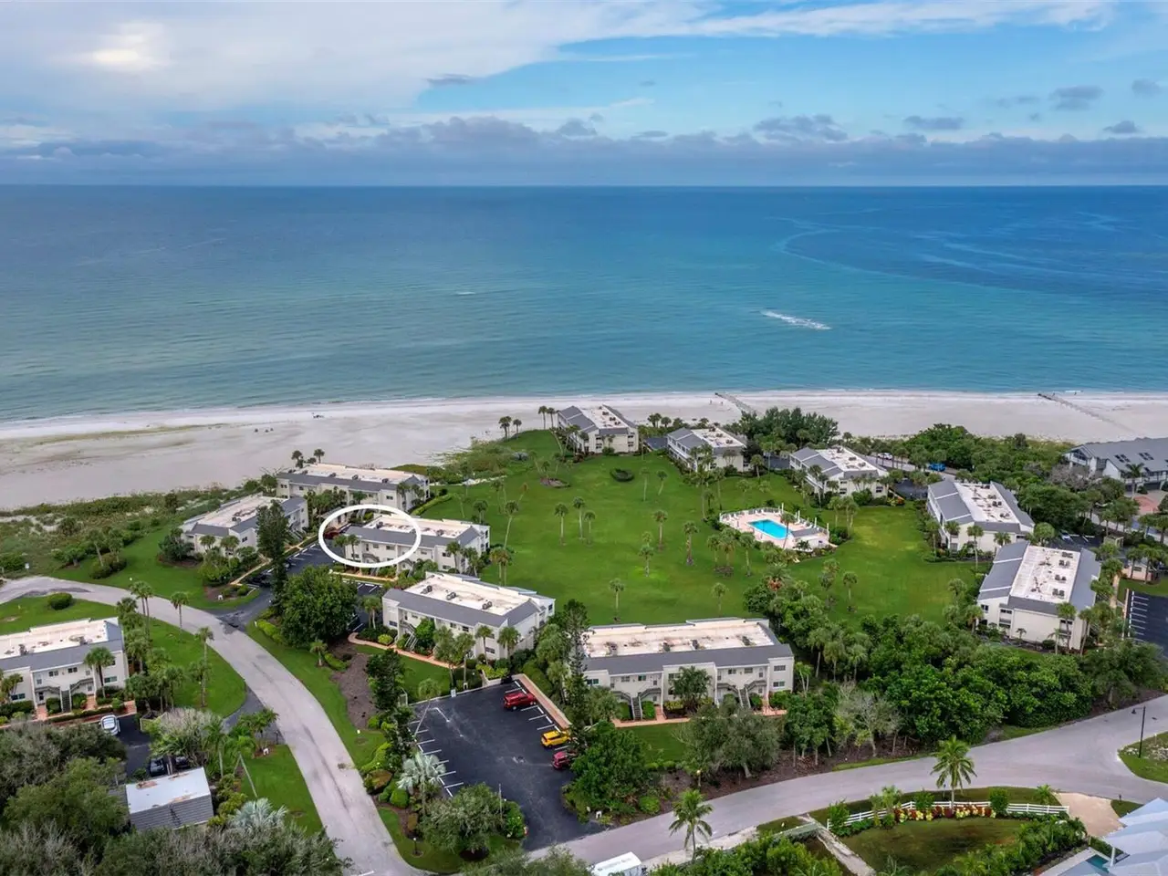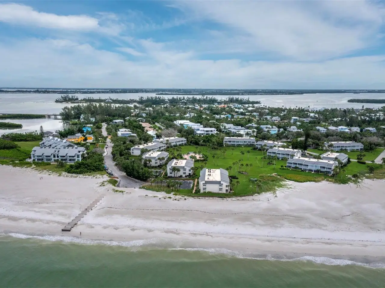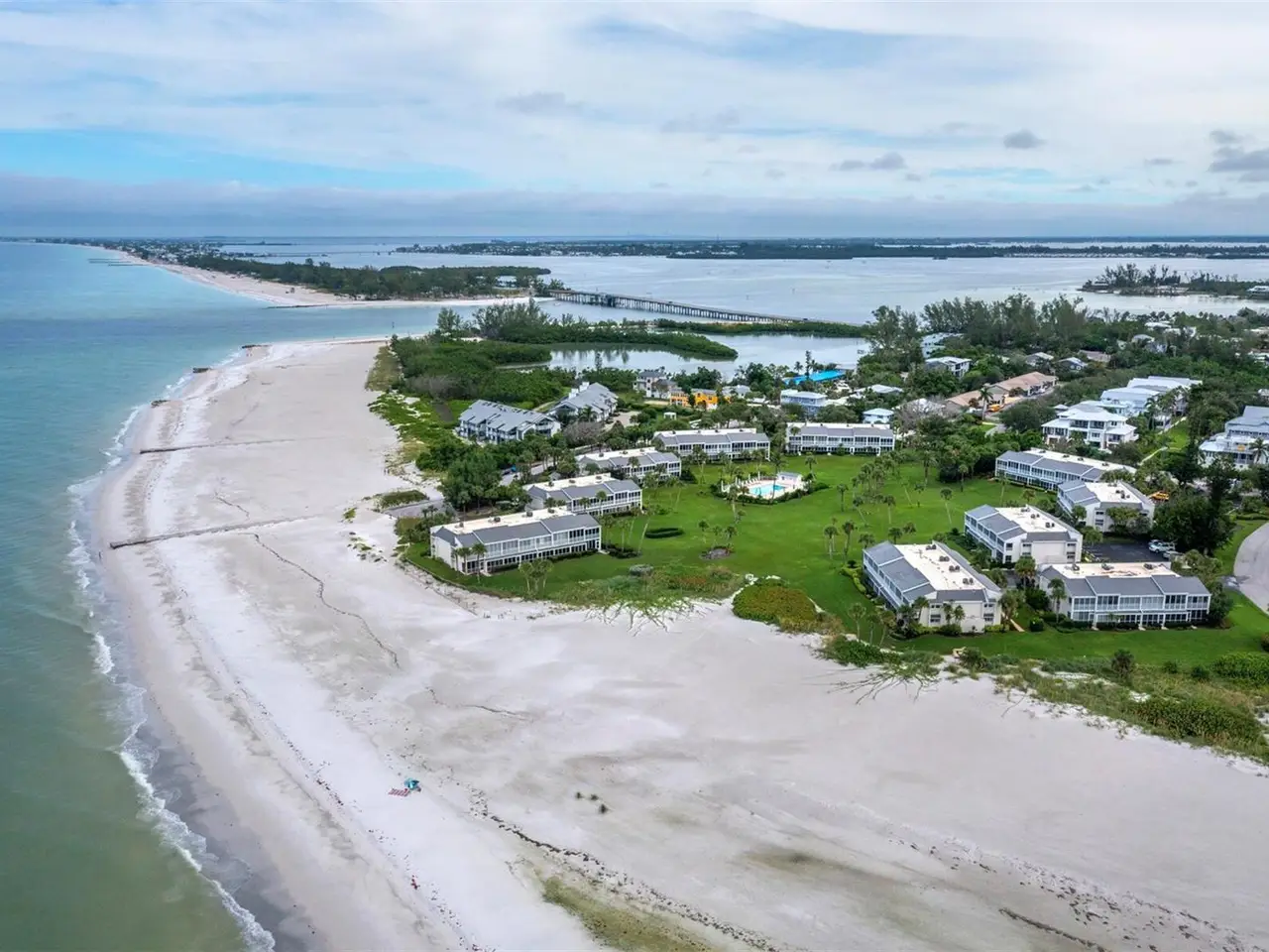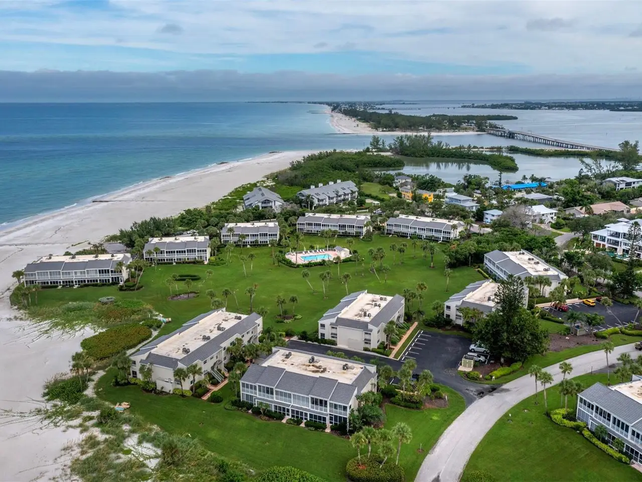 Charming Gulf side 2 bedroom 2 bath condo with bonus room in the serene community of Long Beach on the north end of Longboat Key. Stroll the nearly 3 acres of gulf front/beach property and enjoy...or take a dip in the heated pool, play tennis or relax on the enclosed balcony. This elevated condo (19.5 ft Base Flood Elevation) has been updated and is being sold turnkey furnished for instant enjoyment or an Instant-Income opportunity or homestead and enjoy the significant tax benefits! Enter the front door for the first glance of the gulf and each step brings you closer to the mesmerizing views of the sparking gulf waters and breathtaking sunsets! The screened, enclosed lanai, with access from the living room and primary bedroom, is furnished with a lounge chair and dining table...perfect for morning coffee with the dolphin. Tile floors throughout. Corian/Solid Surface counter tops. Tumbled marble tiles for the kitchen back splash. There is in-unit full size washer and dryer with an optional community laundry for sandy towels. The bonus room provides additional sleeping area, an optional office, or play space. Just across the street there are multiple options for dining and shopping. Meet your neighbors at the pool or the community library. Don't forget to sign up to reserve your tennis court!