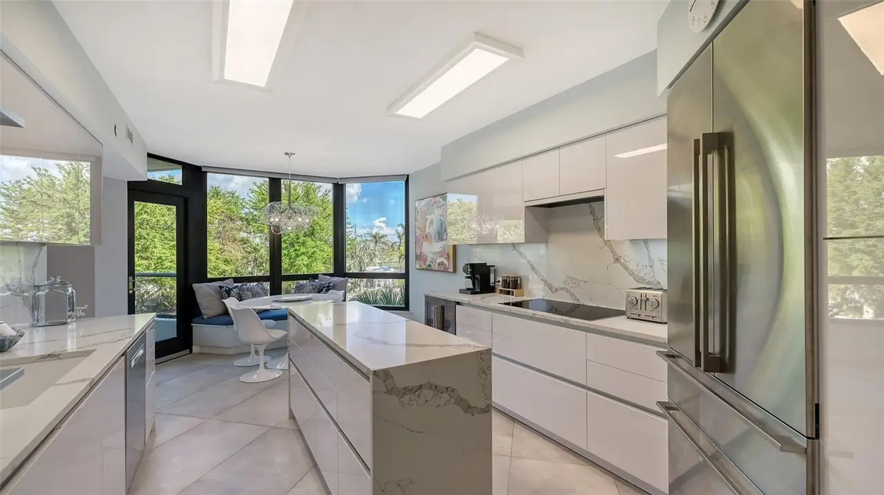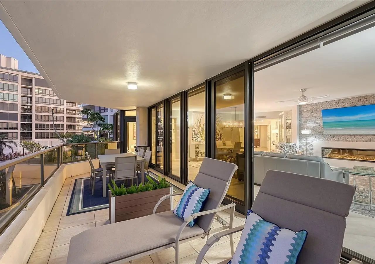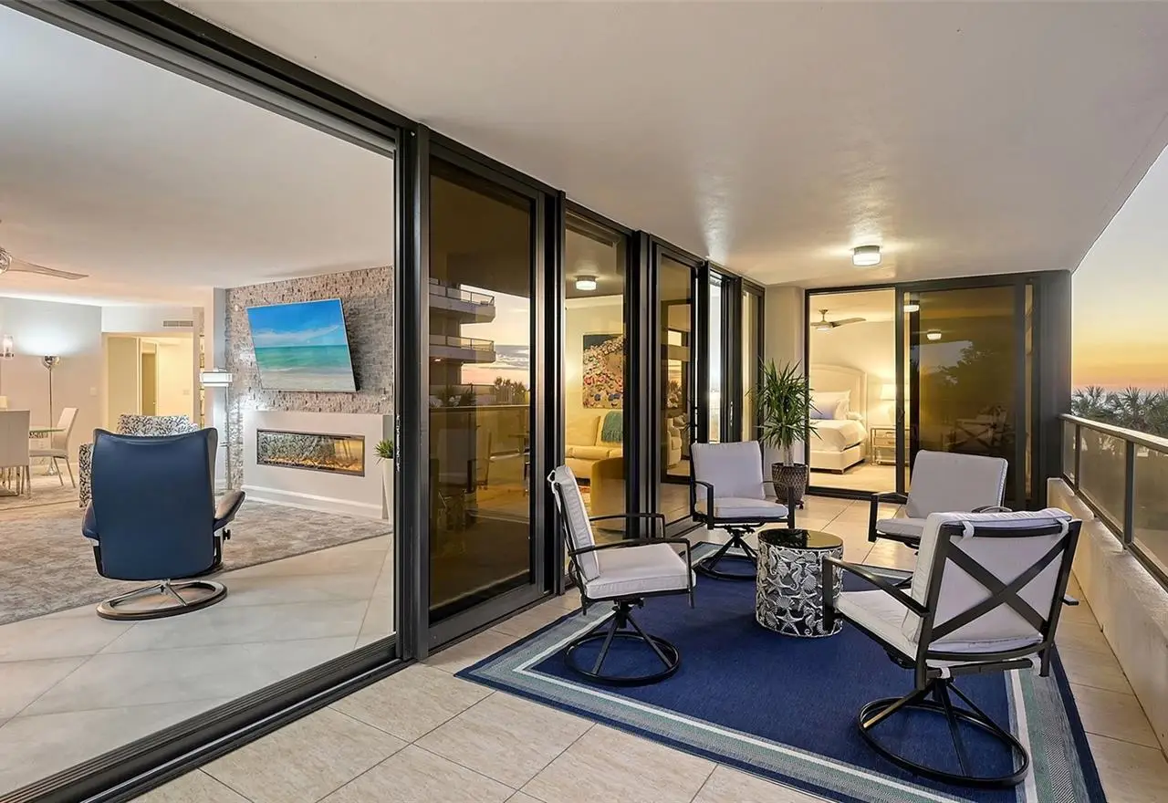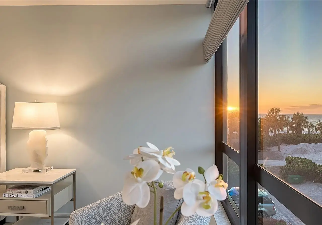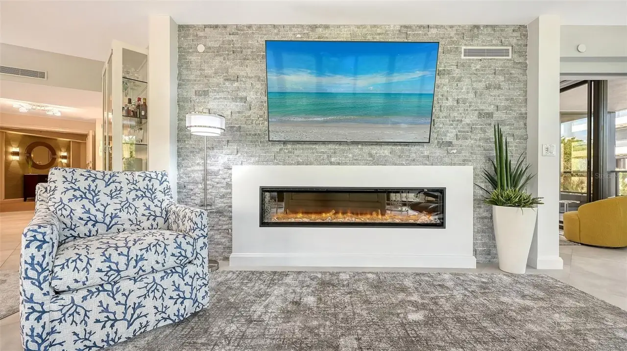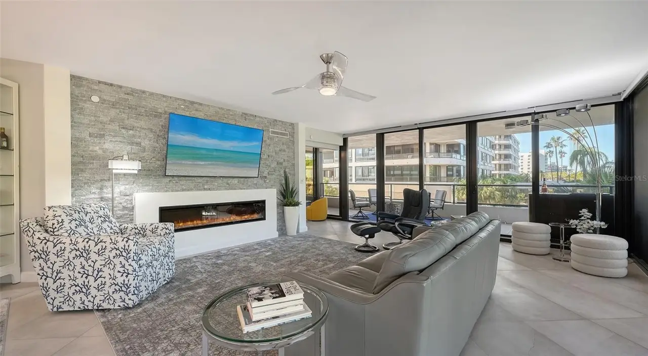 Experience the pinnacle of Gulf Coast living at The Sanctuary, nestled behind the gates of the prestigious Longboat Key Club and Resort on Longboat Key. This exquisitely remodeled three bedroom, three bath property offers a one-of-a-kind living experience with contemporary flair. Enjoy breathtaking, panoramic views of the Longboat Key Club golf course and the Gulf of Mexico from the expansive wrap-around terrace complete with updated tile and PGT impact sliding doors for added protection. The interior of this luxurious residence features neutral, large format porcelain tile floors throughout exuding a sleek, modern aesthetic. Solar screen window coverings are featured in the kitchen, living room, and 3rd bedroom while the primary and main guest bedroom enjoy the elegance of top-down, bottom-up remote controlled custom Roman shades. The expansive great room serves as the heart of the home, offering breathtaking views of the golf course and sunsets every evening. It features a striking 72-inch linear electric fireplace accompanied by a flat-screen TV mounted on a beautiful ledgestone accent wall. The room seamlessly incorporates a spacious dining and entertaining space to host large family get togethers to intimate parties! The chef's kitchen is a culinary dream featuring an integrated dinette area for casual dining and seamlessly blending style with functionality. It's equipped with high-end Monogram appliances, including a French door refrigerator with an internal water dispenser and a versatile freezer/refrigerator drawer. The Monogram oven boasts air fryer capabilities while the Advantium oven offers a range of cooking functions including microwave and convection options providing ultimate flexibility. Additional premium appliances include a Bosch dishwasher for quiet efficiency, a multi-temperature wine cooler to store your collection, and a JennAir induction cooktop for precise cooking control. This kitchen is designed to cater to both everyday meals and gourmet creations. The primary bedroom is a serene, spa-like retreat featuring stunning views of the Gulf and direct access to the expansive patio providing a seamless connection to the outdoors. The adjoining primary bathroom is designed for relaxation and luxury with custom two faucet, trough sink vanity, a separate 'dressing vanity area, a deep soaking tub, and floor-to-ceiling azure tile surrounding both the tub and the shower. This elegant design creates a soothing, indulgent environment perfect for unwinding and enjoying the tranquil atmosphere. The large custom walk-in closet has an abundance of storage & space. The second bedroom is equally stunning, offering picturesque views of the golf course. The ensuite high-end bath features dual vanities and a spacious walk-in shower adorned with wave-shaped tiles perfectly complementing the chic, beach-inspired design. The third bedroom is enjoyed also as a den. The clever seamless pocket doors create smart privacy & easy access to the 3rd bathroom for the ensuite experience but can quickly be transformed into a cozy bedroom offering both short and long-term guests a comfortable retreat. This unit has a separate garage entry and 2 'Townie' bikes to convey. Relax in the luxury and privacy of 24/7 gated security, heated pool/spa with cabanas, beach chaises and umbrellas, Fitness center, 4 Har-Tru tennis courts, Resident only clubhouse for social events or fun card games, it's all here... Perfection in Paradise, move-in ready.