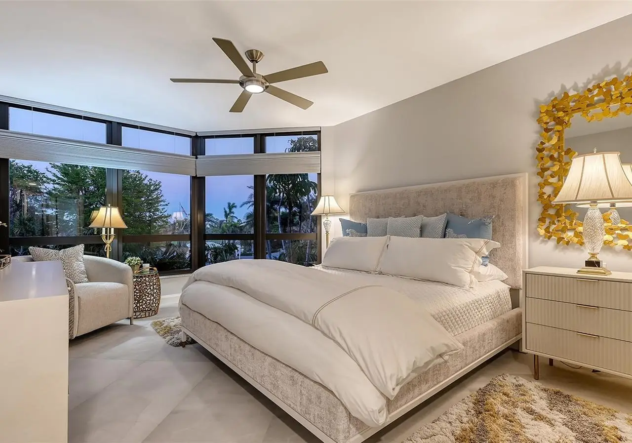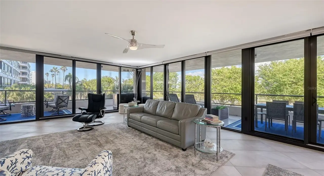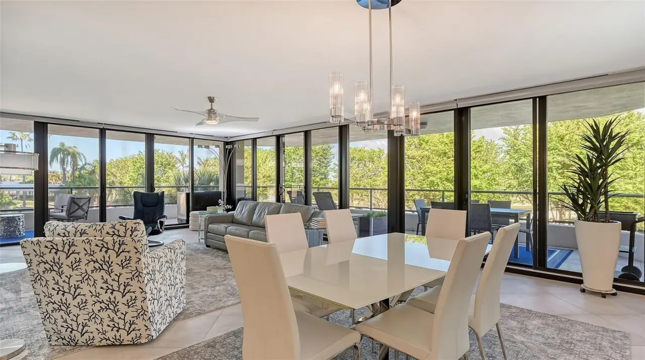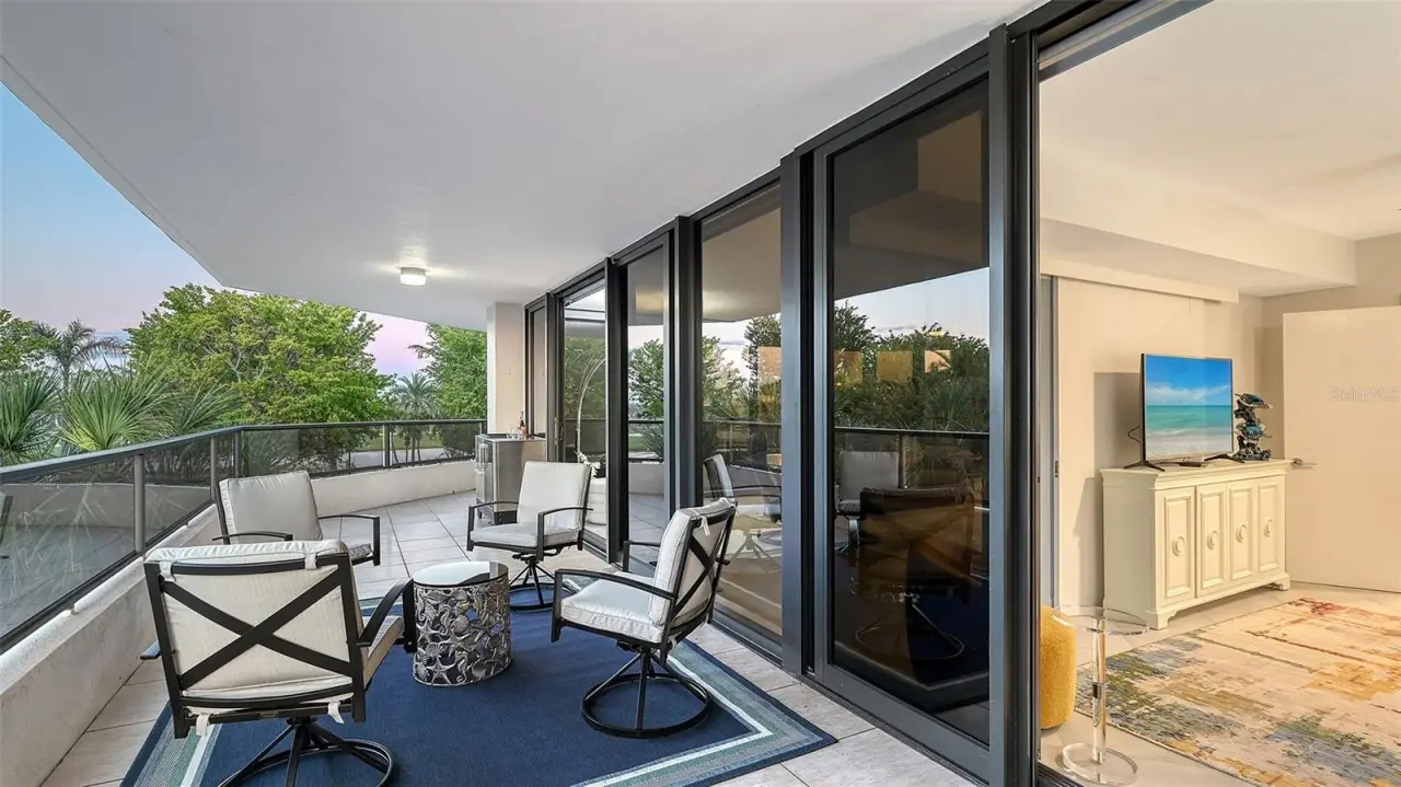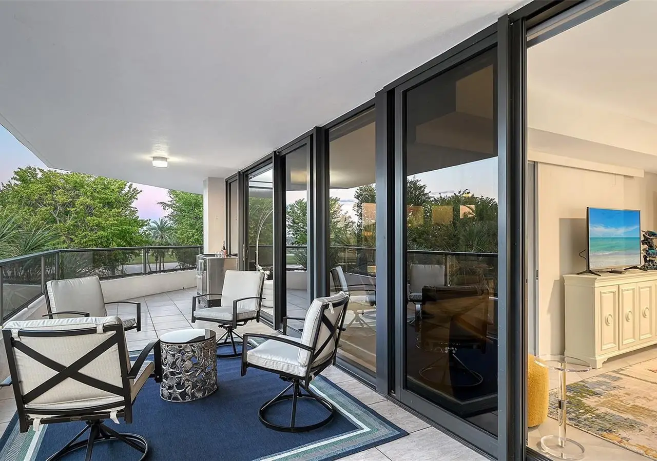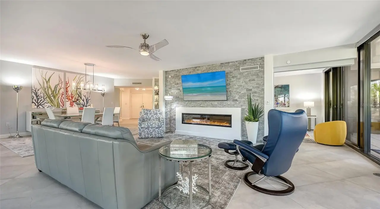 Experience the pinnacle of Gulf Coast living at The Sanctuary, nestled behind the gates of the prestigious Longboat Key Club and Resort on Longboat Key. This exquisitely remodeled three bedroom, three bath property offers a one-of-a-kind living experience with contemporary flair. Enjoy breathtaking, panoramic views of the Longboat Key Club golf course and the Gulf of Mexico from the expansive wrap-around terrace complete with updated tile and PGT impact sliding doors for added protection. The interior of this luxurious residence features neutral, large format porcelain tile floors throughout exuding a sleek, modern aesthetic. Solar screen window coverings are featured in the kitchen, living room, and 3rd bedroom while the primary and main guest bedroom enjoy the elegance of top-down, bottom-up remote controlled custom Roman shades. The expansive great room serves as the heart of the home, offering breathtaking views of the golf course and sunsets every evening. It features a striking 72-inch linear electric fireplace accompanied by a flat-screen TV mounted on a beautiful ledgestone accent wall. The room seamlessly incorporates a spacious dining and entertaining space to host large family get togethers to intimate parties! The chef's kitchen is a culinary dream featuring an integrated dinette area for casual dining and seamlessly blending style with functionality. It's equipped with high-end Monogram appliances, including a French door refrigerator with an internal water dispenser and a versatile freezer/refrigerator drawer. The Monogram oven boasts air fryer capabilities while the Advantium oven offers a range of cooking functions including microwave and convection options providing ultimate flexibility. Additional premium appliances include a Bosch dishwasher for quiet efficiency, a multi-temperature wine cooler to store your collection, and a JennAir induction cooktop for precise cooking control. This kitchen is designed to cater to both everyday meals and gourmet creations. The primary bedroom is a serene, spa-like retreat featuring stunning views of the Gulf and direct access to the expansive patio providing a seamless connection to the outdoors. The adjoining primary bathroom is designed for relaxation and luxury with custom two faucet, trough sink vanity, a separate 'dressing vanity area, a deep soaking tub, and floor-to-ceiling azure tile surrounding both the tub and the shower. This elegant design creates a soothing, indulgent environment perfect for unwinding and enjoying the tranquil atmosphere. The large custom walk-in closet has an abundance of storage & space. The second bedroom is equally stunning, offering picturesque views of the golf course. The ensuite high-end bath features dual vanities and a spacious walk-in shower adorned with wave-shaped tiles perfectly complementing the chic, beach-inspired design. The third bedroom is enjoyed also as a den. The clever seamless pocket doors create smart privacy & easy access to the 3rd bathroom for the ensuite experience but can quickly be transformed into a cozy bedroom offering both short and long-term guests a comfortable retreat. This unit has a separate garage entry and 2 'Townie' bikes to convey. Relax in the luxury and privacy of 24/7 gated security, heated pool/spa with cabanas, beach chaises and umbrellas, Fitness center, 4 Har-Tru tennis courts, Resident only clubhouse for social events or fun card games, it's all here... Perfection in Paradise, move-in ready.