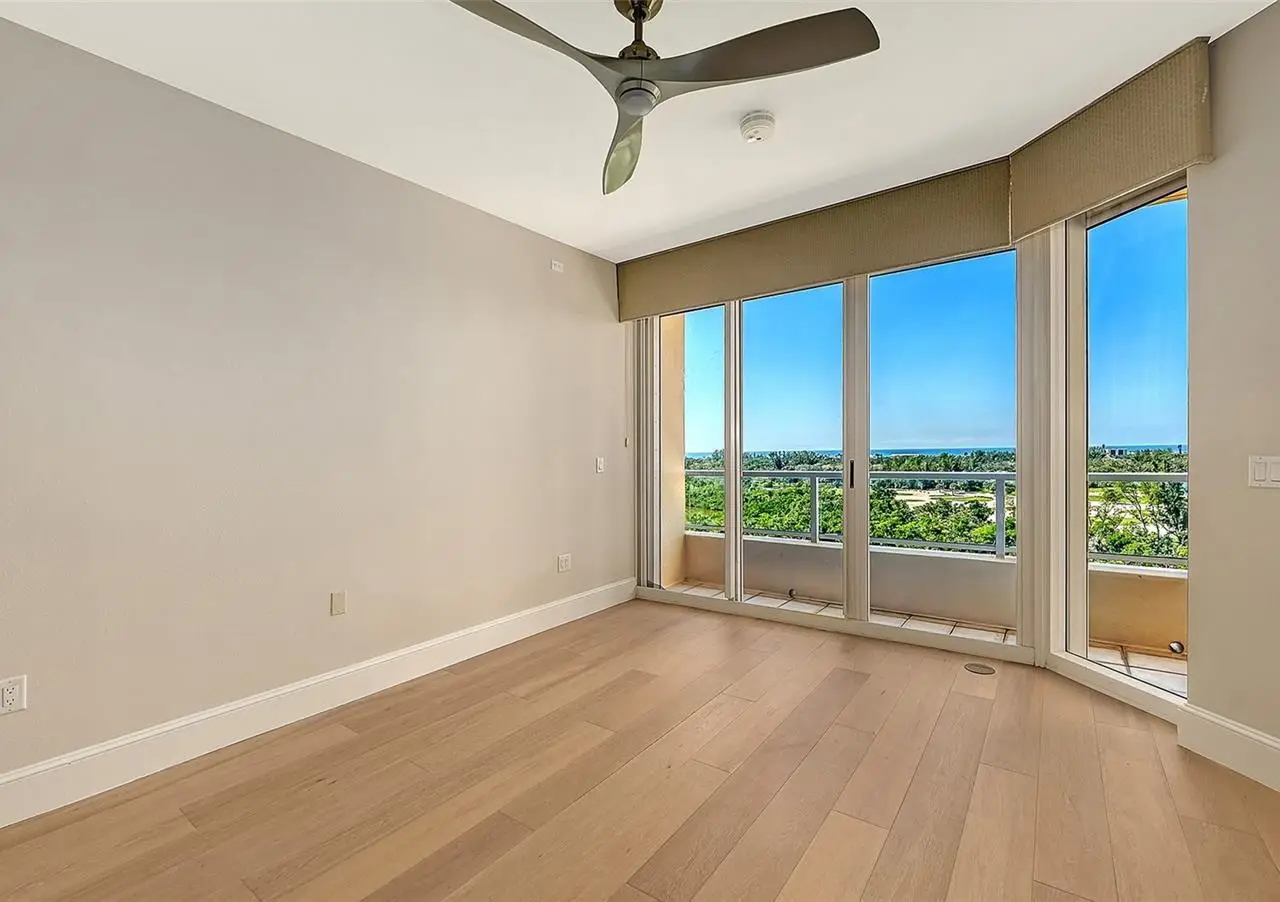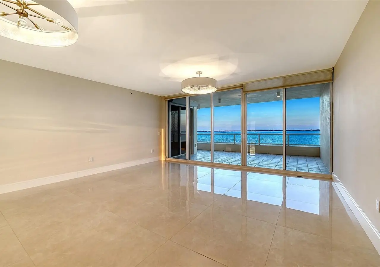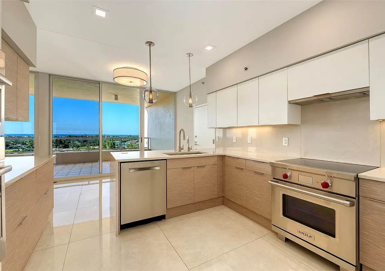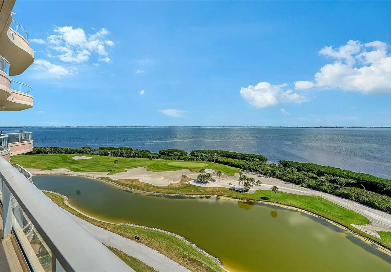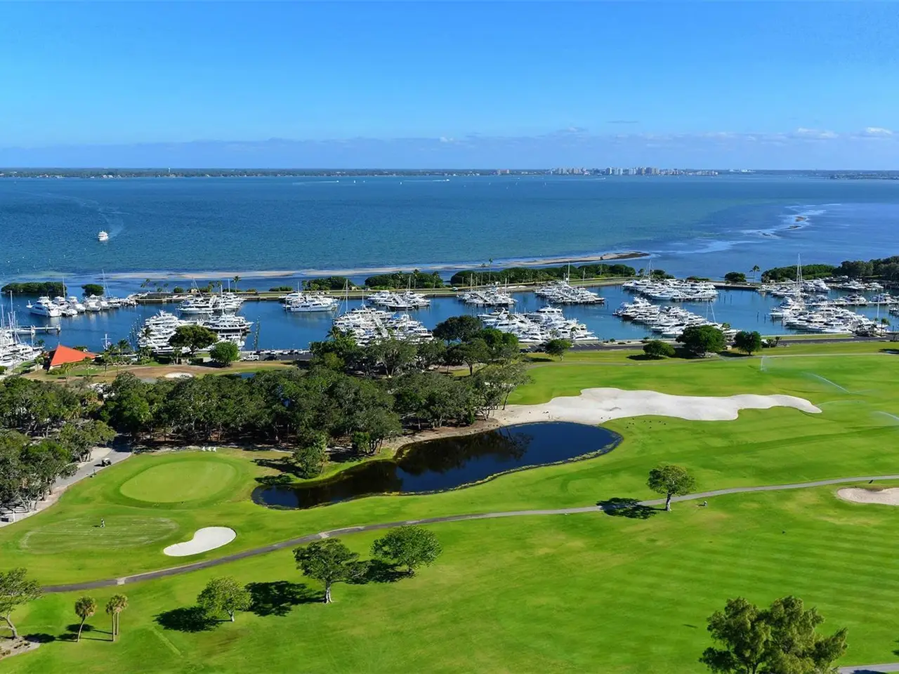 Welcome to Grand Bay. Experience the essence of refined coastal living, where breathtaking panoramic water and city views take center stage. Awaken to the sunrise over Sarasota Bay's skyline with limitless views of the bay and golf course, and unwind with stunning sunsets over the Gulf, an ever-changing display of beauty from every room. Perfectly situated on the 8th floor, this elegant home welcomes you through a private-access, controlled elevator leading to a stunning foyer framed by contemporary glass double doors. The Cayman open floor plan immediately reveals sweeping vistas, while large porcelain tile flooring flows seamlessly through the living areas and onto two outdoor terraces ideal for quiet relaxation. The stunning updated kitchen features two-toned cabinetry, Wolf and Sub-Zero appliances, under-cabinet lighting, quartz countertops, and an inviting breakfast bar. An adjacent eat-in area with floor-to-ceiling sliders opens to a private covered terrace, a perfect setting for entertaining guests and boundless vistas. The primary suite is a lavish retreat, complete with white oak floors, two walk-in closets and a spa-inspired bath showcasing, a soaking tub, glass shower, and dual vanities. The guest suite offers private terrace access for stunning sunset views, complemented by white oak floors and an en-suite bath. Discover versatility with a den/office that doubles as an occasional guest room, providing privacy with elegant pocket doors that separate it from the formal dining room, and a 3rd full bath just steps away. A well thought out conversion has added a built-in office area adding functionality to round out the interior. Residents enjoy various first-rate amenities, including 24-hour guard gates, a clubhouse, two community pools and spas, a large fitness center with saunas, and tennis courts. Stroll the neighborhood's scenic walking paths or enjoy deeded access to the exclusive gated Bay Isles Beach Club offering locker rooms, barbecues, volleyball nets, covered picnic areas and a sandy white beach. Located behind the Bay Isles secure gates, this secluded neighborhood rests on the rolling greens of the Longboat Key Club's golf course. Grand Bay residents find it hard to leave this special community. This residence truly captures the best refined Bay and beach lifestyle - sophisticated, exclusive, and ready to be enjoyed.