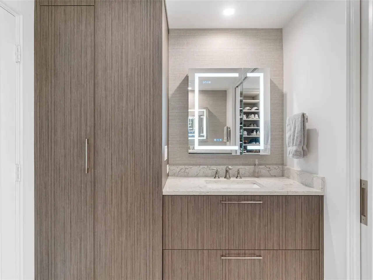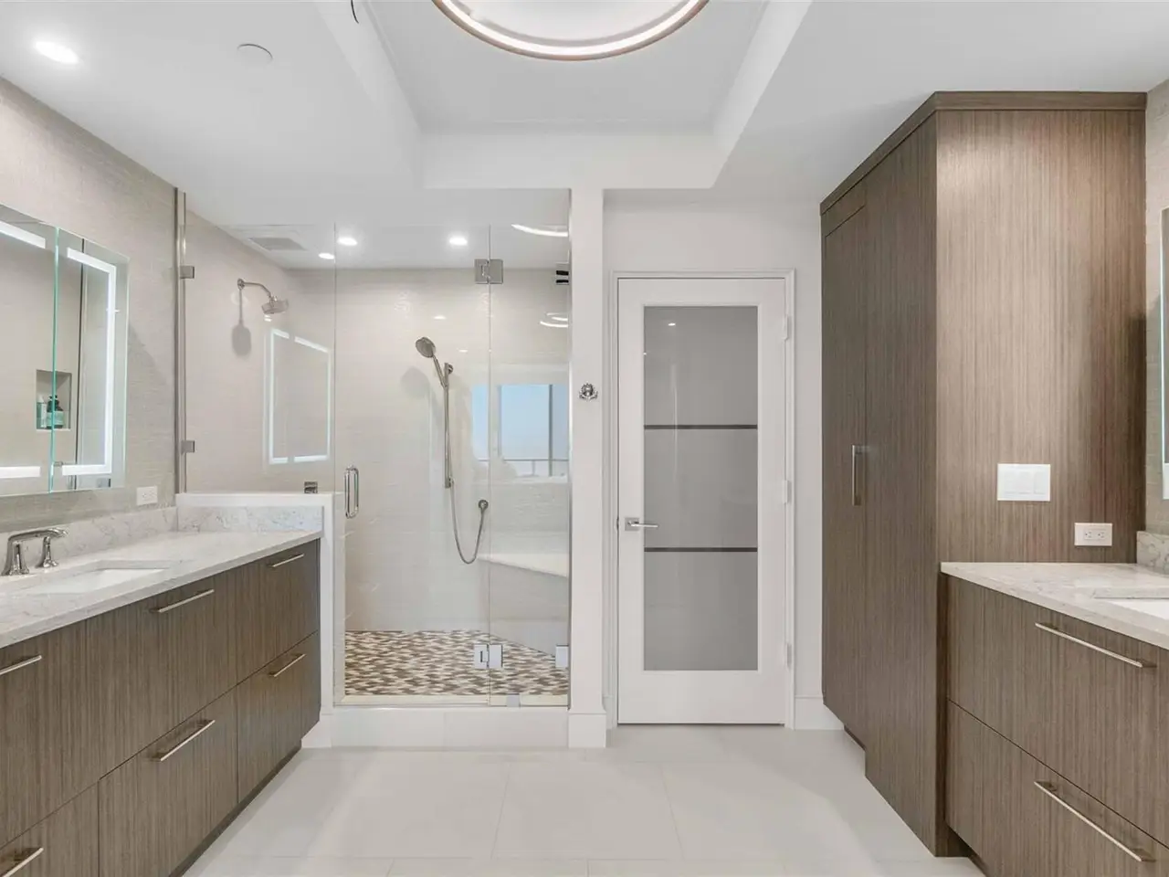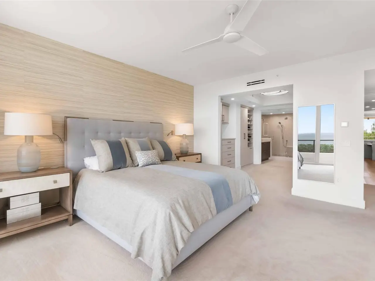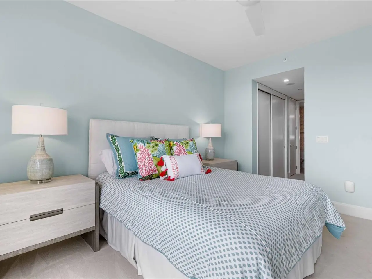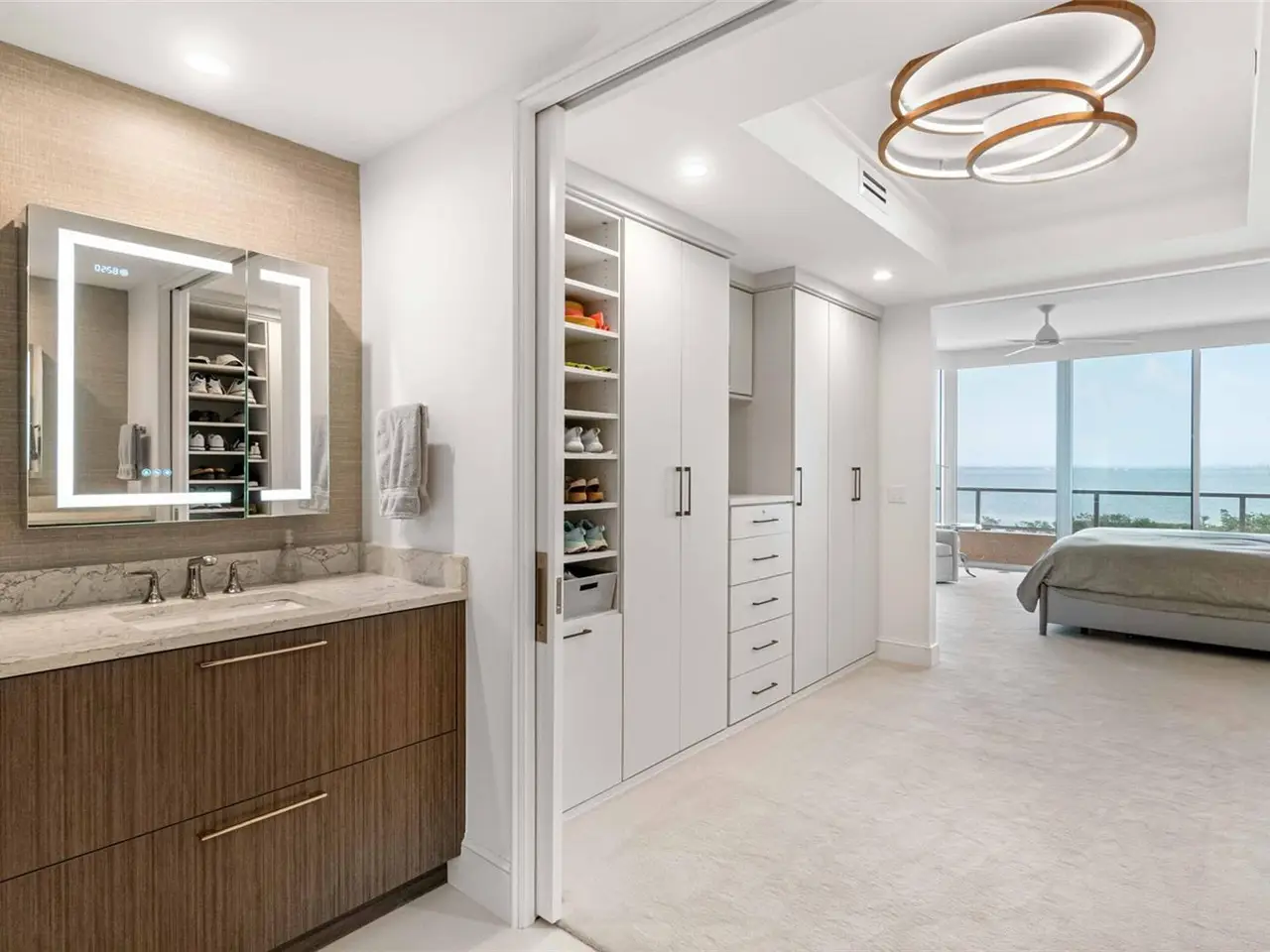 Be wowed by the $800,000 renovation of this stunning Cayman unit in coveted building 3 of the desirable gated Grand Bay community in Bay Isles on Longboat Key. Savor the mesmerizing full Sarasota Bay views, highlighted by boats arriving in the Marina, the manicured grounds of the Longboat Key Club Blue course 9th hole, and downtown Sarasota in the distance. Discerning buyers will appreciate the quality, attention to detail and expense evident in this must-see renovation by Renovation SRQ. Demolished to the studs in 2021, this re-designed home offers an open floor plan, where kitchen and dining areas flowing seamlessly. The new design, coupled with artful use of captivating color choices, creates a wonderful, soothing space on trend with modern lifestyle. Included in the renovation are hardwood composite floors in all rooms (aside from bedrooms); a relocated kitchen with new cabinetry, counters, back splash, Thermador appliances, plumbing/piping/ and electric wiring; a new Wet Bar with sink/fridge and freezer; Lutron Caseta lighting with cove lighting in the dining room, gorgeous lighting fixtures and lighting scenes throughout. Lutron Shades on East side of the unit and black out shades in the primary bedroom provide privacy and comfort throughout the day. The stylish dressing area in the primary bedroom has been substantially enlarged and intelligently outfitted with new cabinetry, opening into a spacious bath, with dual vanities, shower and filtered outside light. Extra sound-absorbing insulation was installed in the walls abutting neighbors. The 3rd bedroom presently is used as the office/den with glass doors and privacy shades. Balcony doors were completely rebuilt with new screens that slide easily and seal tightly. New beautiful contemporary floor tiles were installed on both balconies. One parking space is conveniently located next to elevator access and has no neighboring car. This 2nd floor unit allows for easy access for pets and to the street. Residents of Grand Bay are invited to enjoy an exciting host of amenities, including 24/7 guard gates as you enter both Bay Isles and Grand Bay, a clubhouse, two community pools and spas, a large fitness center with saunas and Har-Tru tennis courts. Enjoy the conveniences of Bay Isles, with its miles of walking paths, and nearby shopping. And relax at the private, gated Bay Isles Beach Club directly on the Gulf of Mexico, with its locker rooms, barbecues, volleyball nets, covered picnic areas and an expanse of sandy white beach shared only with other Bay Isles owners. Do not miss this opportunity --begin your Longboat lifestyle today.