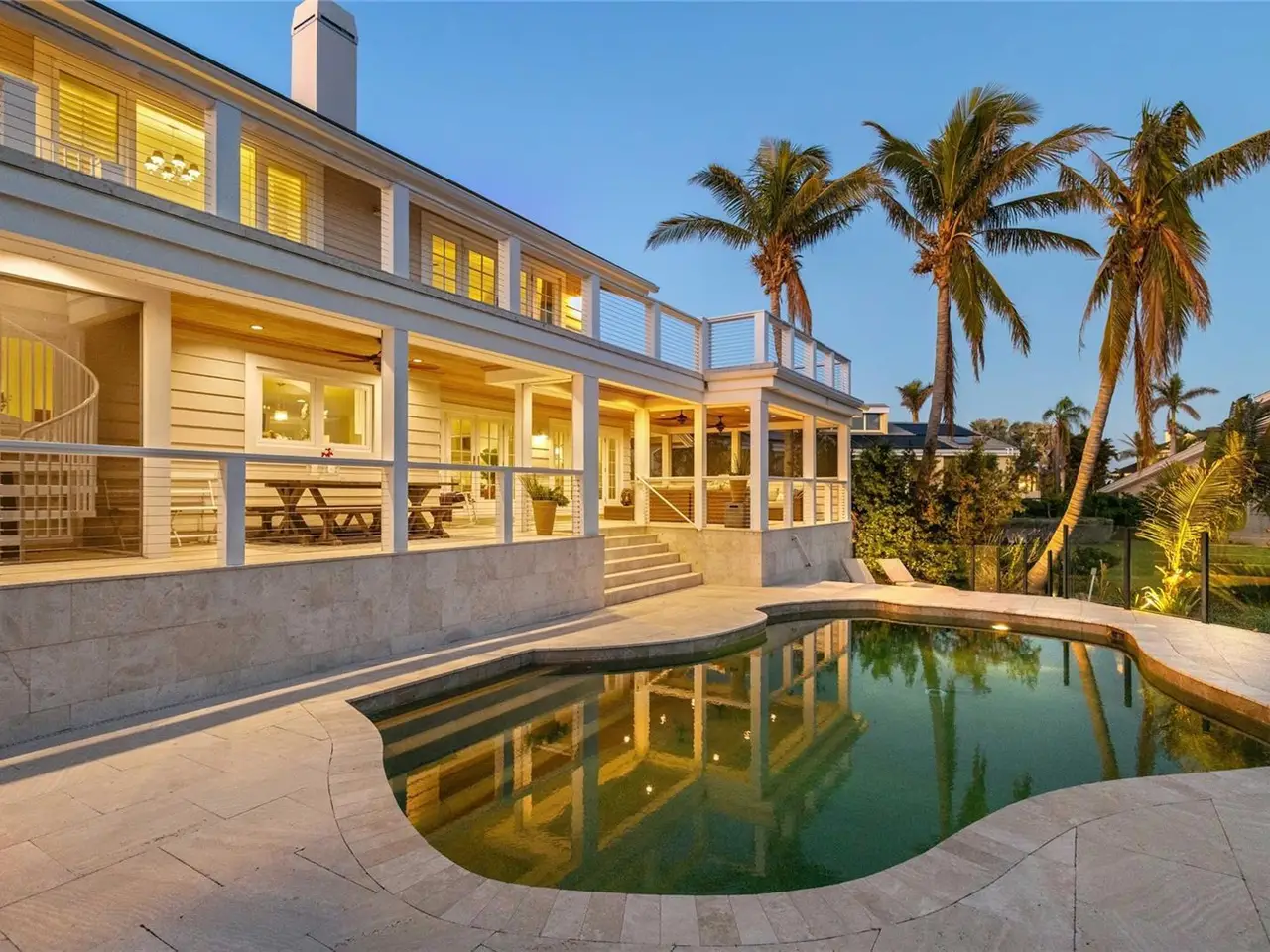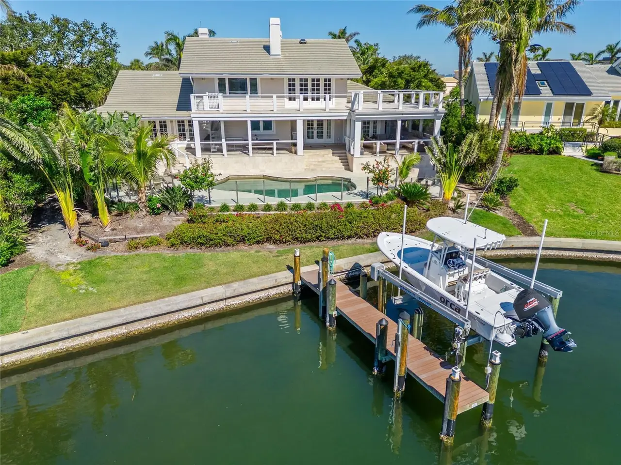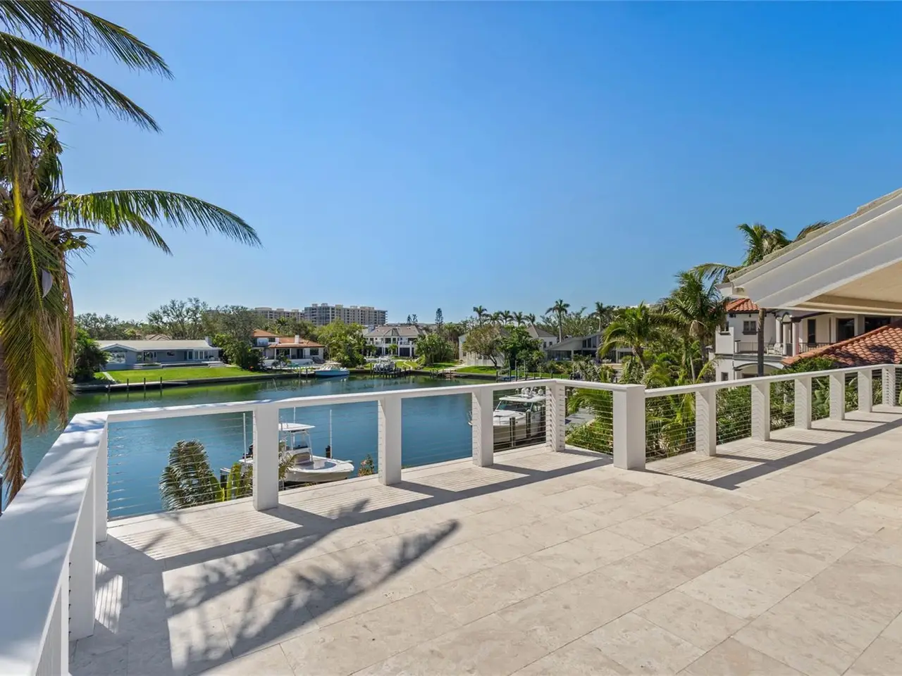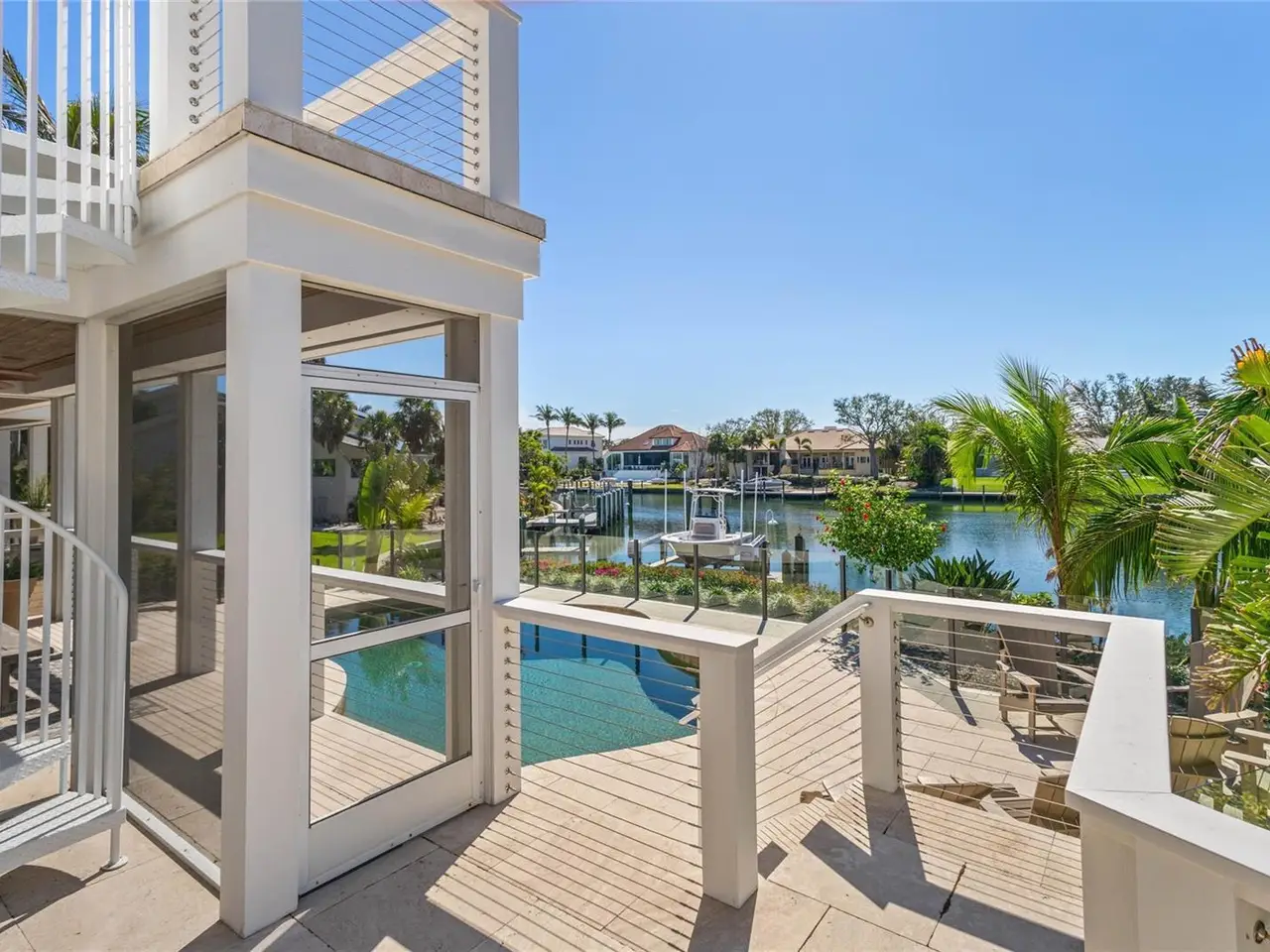This exquisite two-story waterfront home located in the coveted Harbor section of Bay Isles has been meticulously renovated to embody modern elegance and luxurious coastal living. Surrounded by lush tropical landscaping, the home welcomes you through an elegant French door entrance into the grand foyer, where soaring ceilings, gleaming travertine flooring, and a striking wrought iron floating staircase with rich, dark wood steps set the tone for the refined elegance that unfolds throughout the home. The lower level boasts a bright and airy open space with hardwood floors throughout, creating a welcoming atmosphere that effortlessly combines sophistication with the timeless beauty of natural materials. The spacious family room is anchored by a stunning fireplace with decorative columns and an elegant mantel, complemented by French doors leading to the expansive waterfront lanai, reinforcing the home's seamless connection to its stunning natural surroundings. A culinary enthusiast's dream, the generously sized kitchen features a large island with a waterfall granite countertop, custom cabinetry, ample storage space, and high-end stainless steel appliances, including a six-burner gas range and double ovens. Adjacent to the kitchen, the dining area and great room spaces flow seamlessly into each other. The great room is both grand and inviting, showcasing a dramatic wood-clad cathedral ceiling that adds warmth and character. A second stone fireplace enhances the ambiance, while three sets of French doors that open onto the lanai offer an effortless transition between indoor and outdoor living. Also on this level are two generous guest suites, each with a full bath, one with direct lanai access, and a den with full bath. Upstairs, the primary suite is a true retreat. Floor-to-ceiling windows illuminate the space, and French doors open to a spacious private balcony, offering captivating water views that create a peaceful escape. A cozy fireplace adds to the intimate atmosphere, while the spa-inspired en-suite bath indulges with marble flooring, soaking tub, dual vanities, frameless glass walk-in shower, and water closet, all overlooking the serene waterway. The outdoor living space is equally spectacular, designed for both relaxation and entertaining. The expansive lanai features multiple covered areas with a rich wood-clad ceiling and retractable screens, a sun-drenched open-air section, and a stunning saltwater pool with travertine decking framed by verdant tropical landscaping. Just beyond the pool, a private dock with a boat lift sits on a deep-water basin and wide canal with no bridges to Sarasota Bay, offering quick and direct access for boating enthusiasts. Bay Isles Beach Club membership is included. This extraordinary home seamlessly blends elegance, comfort, and the unparalleled beauty of waterfront living, creating a sanctuary that is as functional as it is breathtaking.