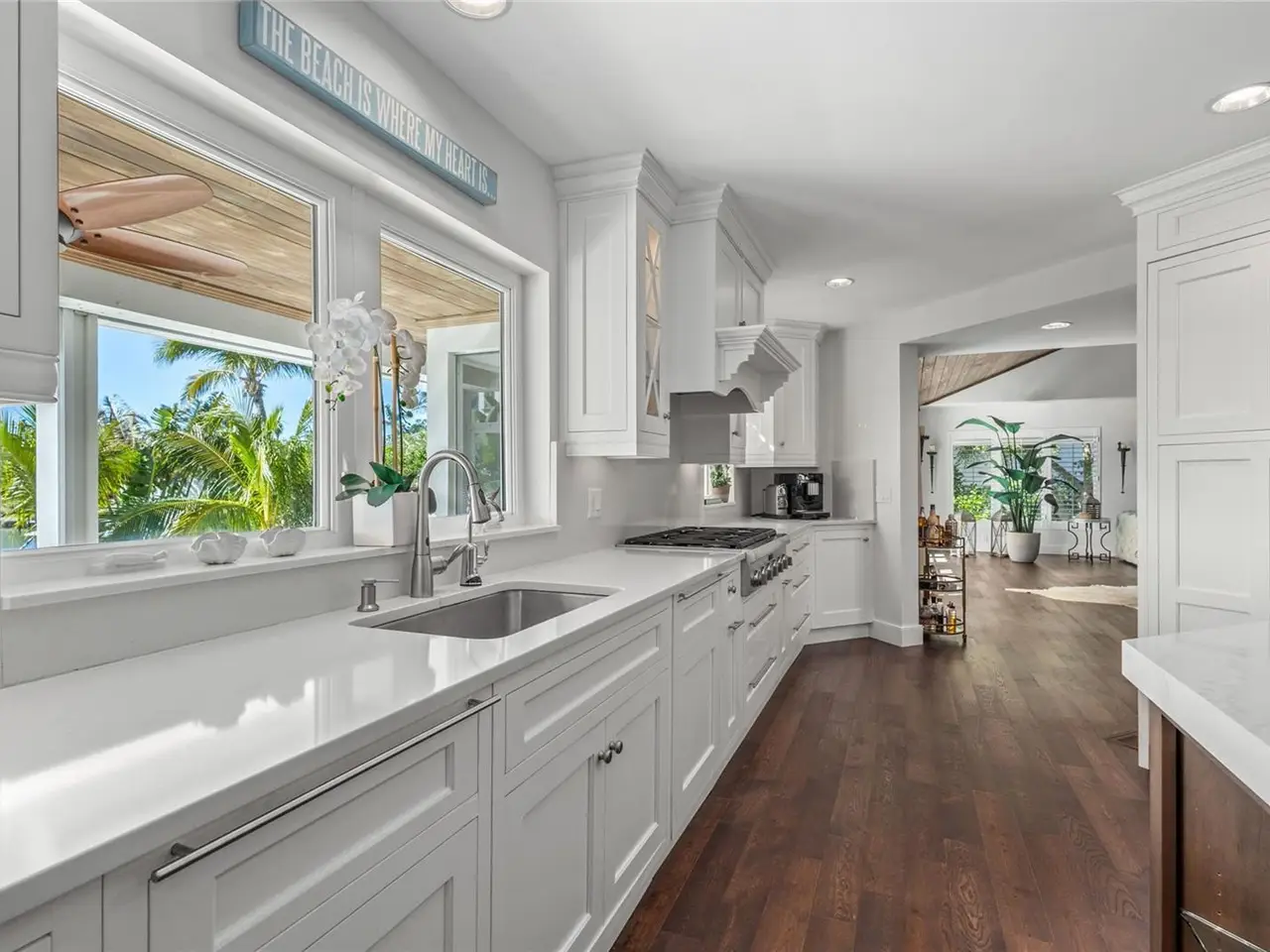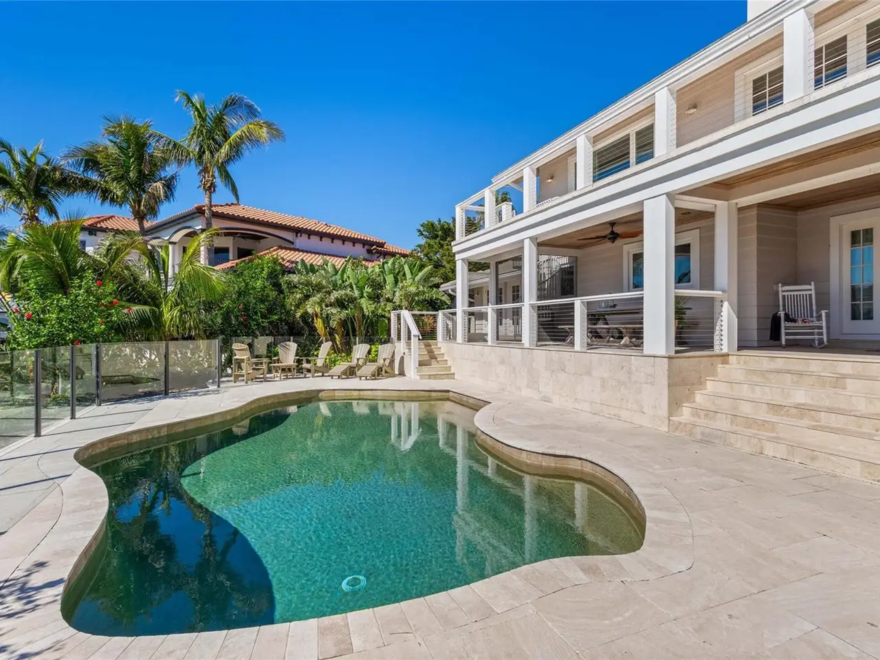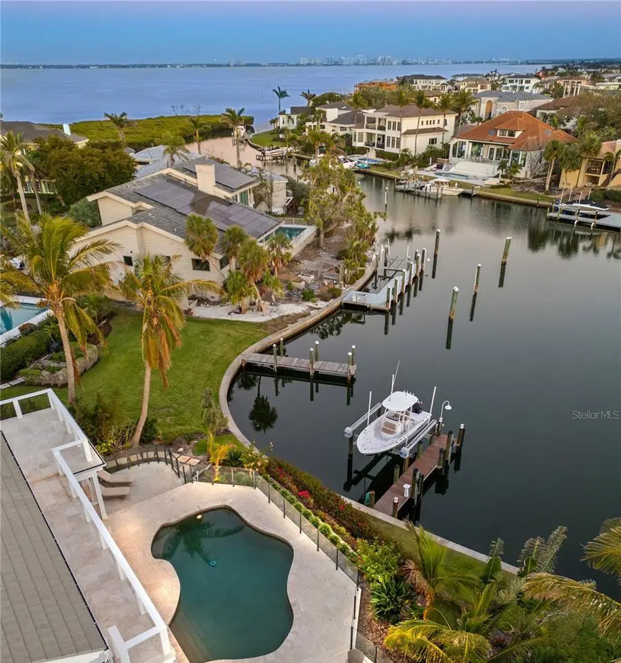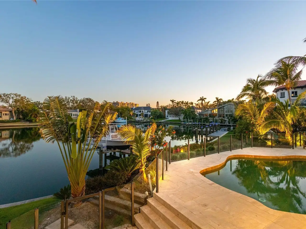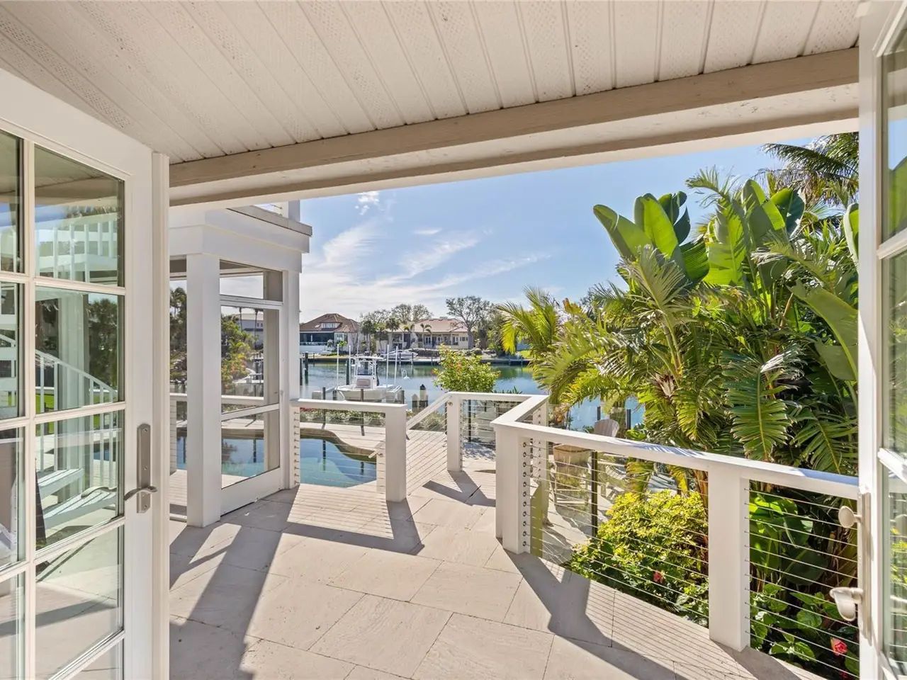 This exquisite two-story waterfront home located in the coveted Harbor section of Bay Isles has been meticulously renovated to embody modern elegance and luxurious coastal living. Surrounded by lush tropical landscaping, the home welcomes you through an elegant French door entrance into the grand foyer, where soaring ceilings, gleaming travertine flooring, and a striking wrought iron floating staircase with rich, dark wood steps set the tone for the refined elegance that unfolds throughout the home. The lower level boasts a bright and airy open space with hardwood floors throughout, creating a welcoming atmosphere that effortlessly combines sophistication with the timeless beauty of natural materials. The spacious family room is anchored by a stunning fireplace with decorative columns and an elegant mantel, complemented by French doors leading to the expansive waterfront lanai, reinforcing the home's seamless connection to its stunning natural surroundings. A culinary enthusiast's dream, the generously sized kitchen features a large island with a waterfall granite countertop, custom cabinetry, ample storage space, and high-end stainless steel appliances, including a six-burner gas range and double ovens. Adjacent to the kitchen, the dining area and great room spaces flow seamlessly into each other. The great room is both grand and inviting, showcasing a dramatic wood-clad cathedral ceiling that adds warmth and character. A second stone fireplace enhances the ambiance, while three sets of French doors that open onto the lanai offer an effortless transition between indoor and outdoor living. Also on this level are two generous guest suites, each with a full bath, one with direct lanai access, and a den with full bath. Upstairs, the primary suite is a true retreat. Floor-to-ceiling windows illuminate the space, and French doors open to a spacious private balcony, offering captivating water views that create a peaceful escape. A cozy fireplace adds to the intimate atmosphere, while the spa-inspired en-suite bath indulges with marble flooring, soaking tub, dual vanities, frameless glass walk-in shower, and water closet, all overlooking the serene waterway. The outdoor living space is equally spectacular, designed for both relaxation and entertaining. The expansive lanai features multiple covered areas with a rich wood-clad ceiling and retractable screens, a sun-drenched open-air section, and a stunning saltwater pool with travertine decking framed by verdant tropical landscaping. Just beyond the pool, a private dock with a boat lift sits on a deep-water basin and wide canal with no bridges to Sarasota Bay, offering quick and direct access for boating enthusiasts. Bay Isles Beach Club membership is included. This extraordinary home seamlessly blends elegance, comfort, and the unparalleled beauty of waterfront living, creating a sanctuary that is as functional as it is breathtaking.