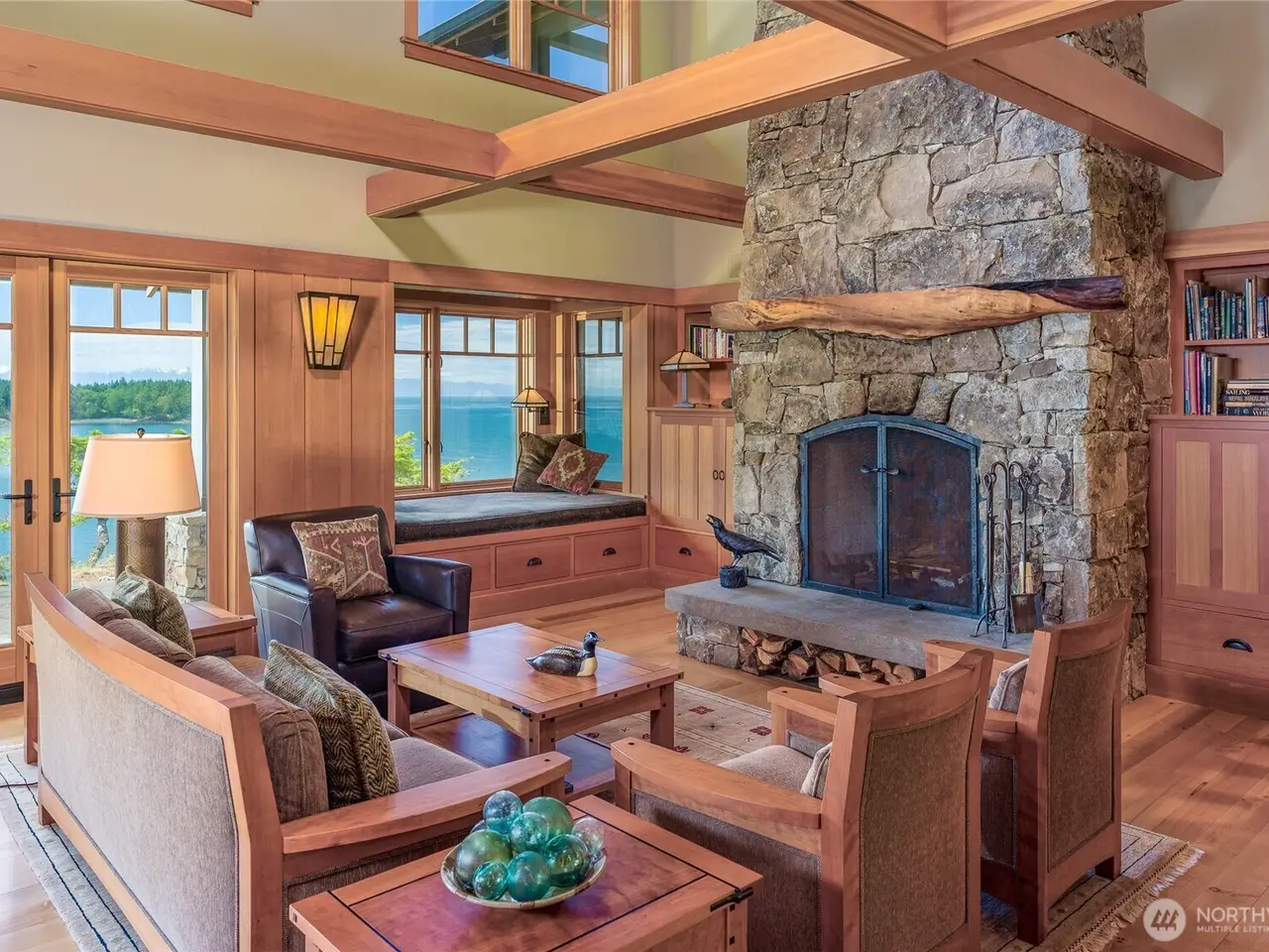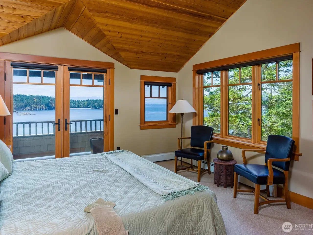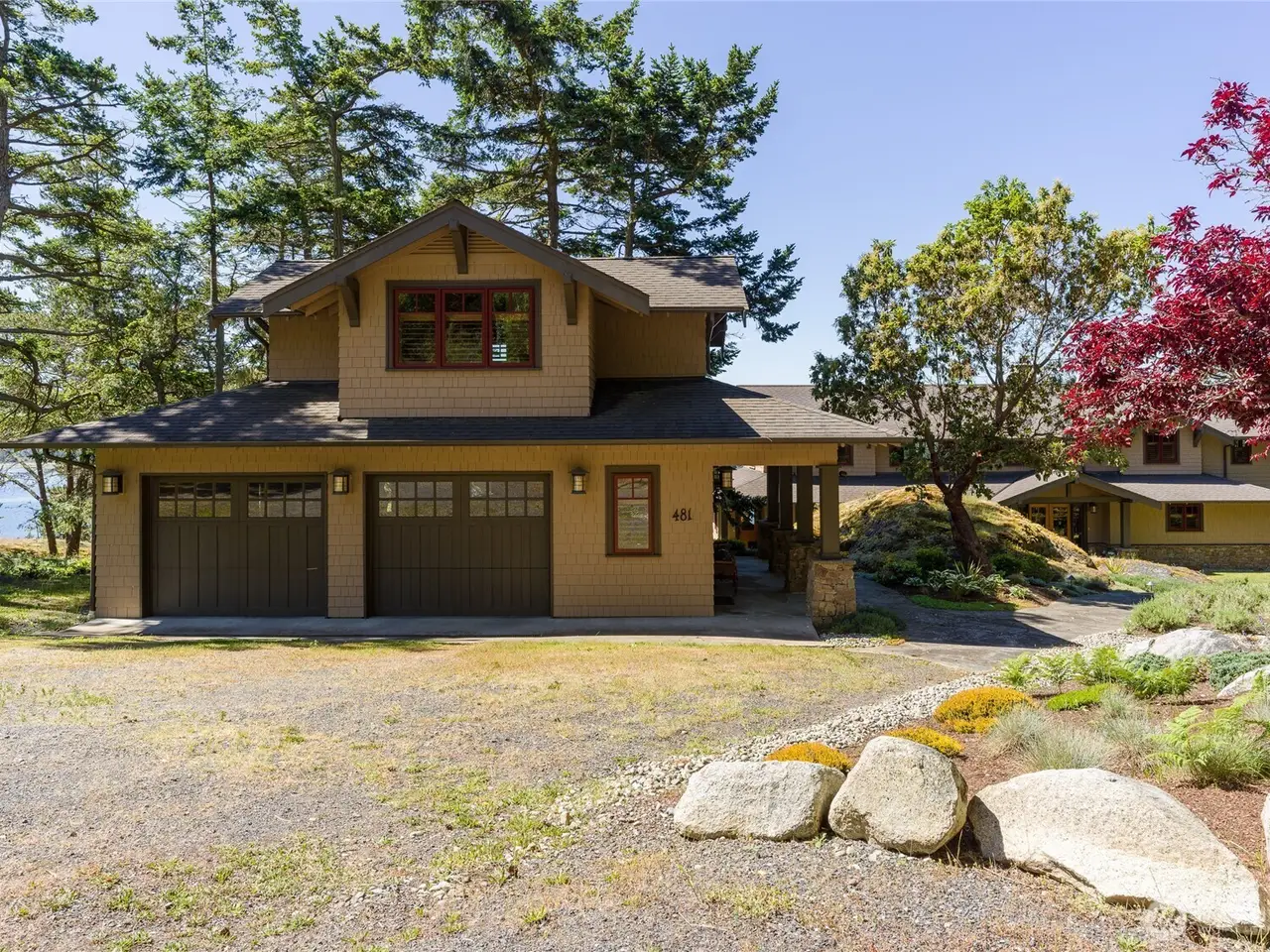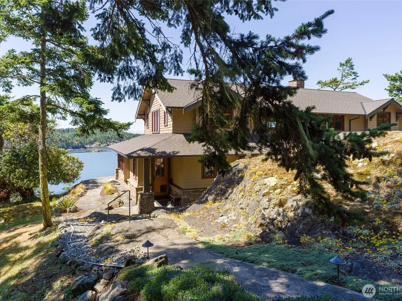 LOPEZ ISLAND LUXURY A rare blend of privacy, distinction & breathtaking views. This custom NW Craftsman sits on 27 waterfront ac overlooking MacKaye Harbor to Vancouver Is & OLympic Mtns. Designed for southern vistas, the 3BD/3BA home features madrona floors, banks of windows & clear fir cabinetry & finishes. Great Room centers on a stone fireplace with built-ins & view daybed. A chef's kitchen offers slate counters, double ovens, Wolf cooktop & breakfast nook. Two ensuite primary bedrooms with walk-in closets, one with covered deck. French doors open to sunny stone patio & eagle-eye views. Detached garage with studio above. Seasonal creek winds thru mature woods & pasture. Large shop/garage, fenced garden, fruit trees, chicken house & more.