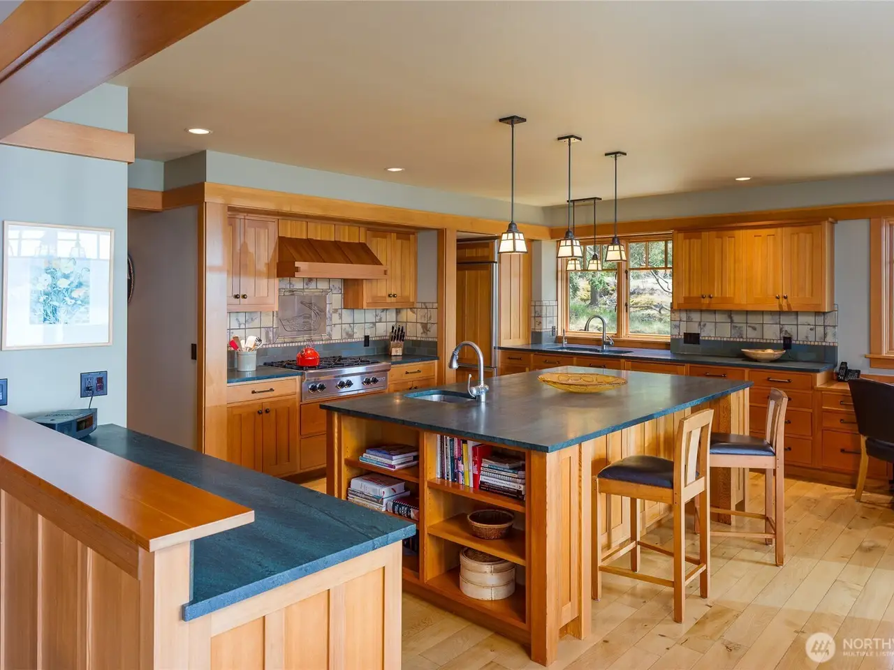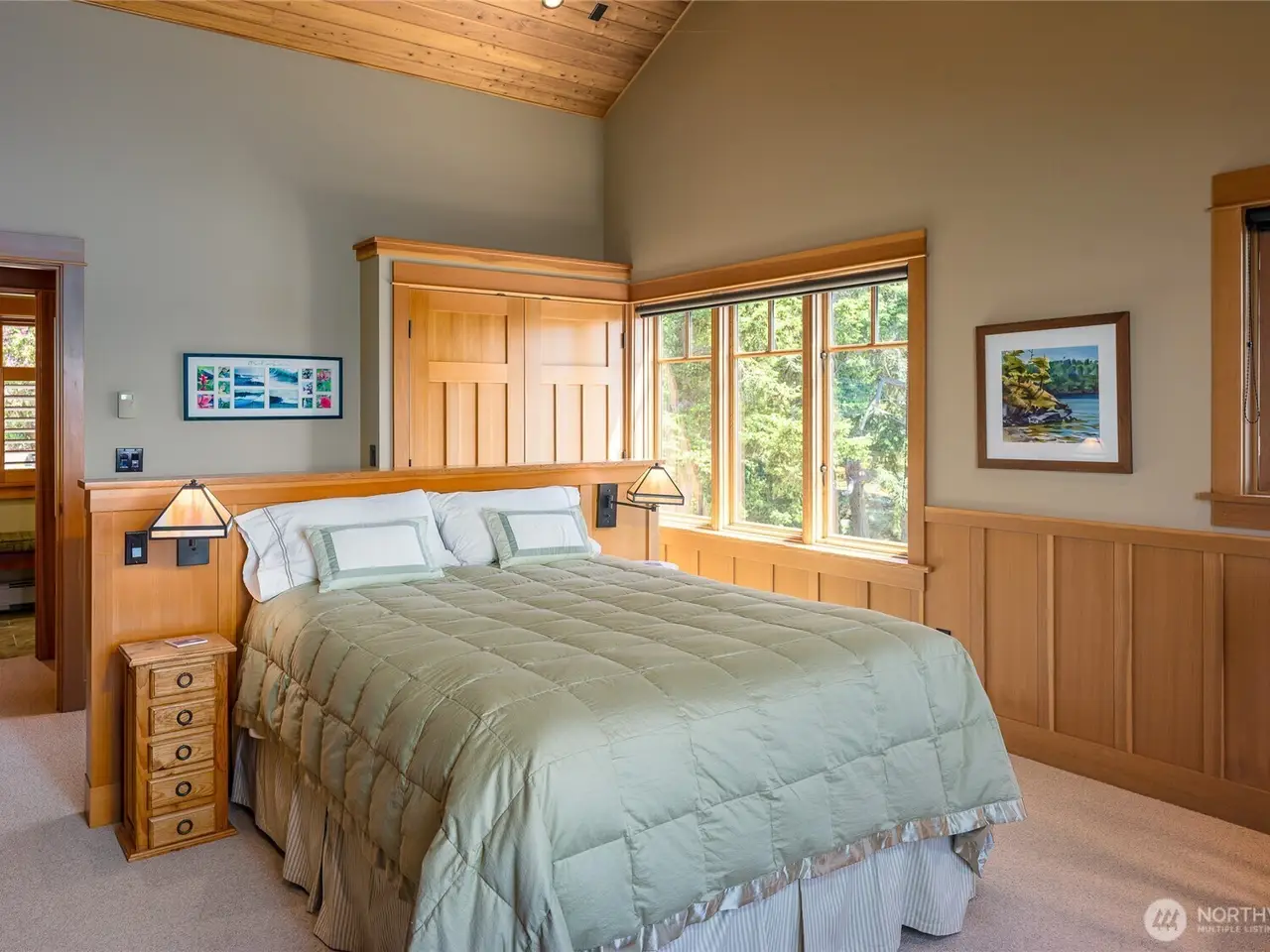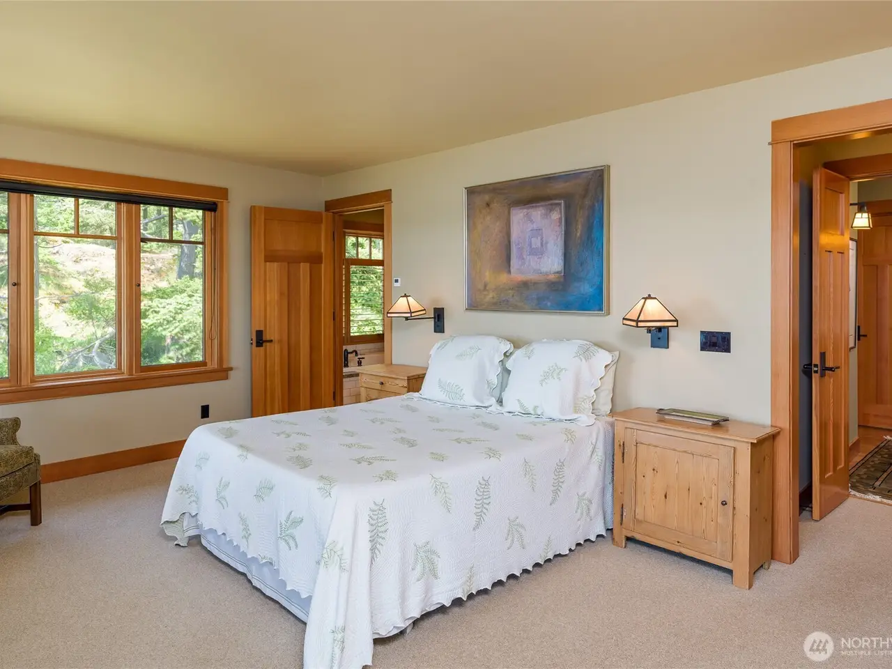 LOPEZ ISLAND LUXURY A rare blend of privacy, distinction & breathtaking views. This custom NW Craftsman sits on 27 waterfront ac overlooking MacKaye Harbor to Vancouver Is & OLympic Mtns. Designed for southern vistas, the 3BD/3BA home features madrona floors, banks of windows & clear fir cabinetry & finishes. Great Room centers on a stone fireplace with built-ins & view daybed. A chef's kitchen offers slate counters, double ovens, Wolf cooktop & breakfast nook. Two ensuite primary bedrooms with walk-in closets, one with covered deck. French doors open to sunny stone patio & eagle-eye views. Detached garage with studio above. Seasonal creek winds thru mature woods & pasture. Large shop/garage, fenced garden, fruit trees, chicken house & more.
