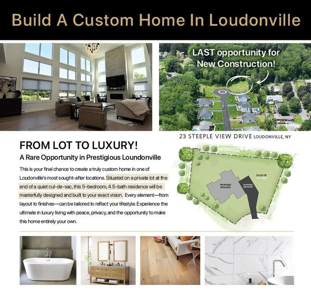 From Lot to Luxury! Enjoy perfection, even if you don't have the luxury of time! Your opportunity to own a stunning new construction home in a prestigious Loudonville location where every detail is expertly designed for you. This 5 bedroom, 4.5 bath masterpiece will sit on a private lot at the end of a quite cul-de-sac, offering ultimate peace and privacy. An open concept living area anchored by a chef's kitchen with top of the line appliances, quartz countertops, custom cabinetry, flows seamlessly to a dramatic great room with soaring ceilings and a breathtaking glass feature window; elevating everyday into extraordinary. 1st floor primary suite with spa bath plus 1st floor guest suite. 3 bedrooms up with own baths. All details crafted with style, comfort and efficiency. To be built.