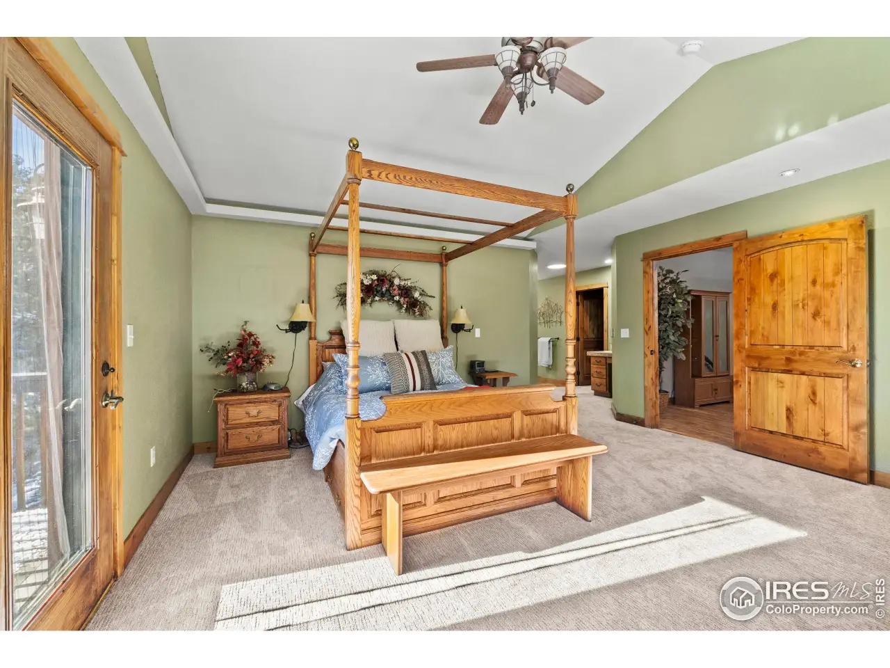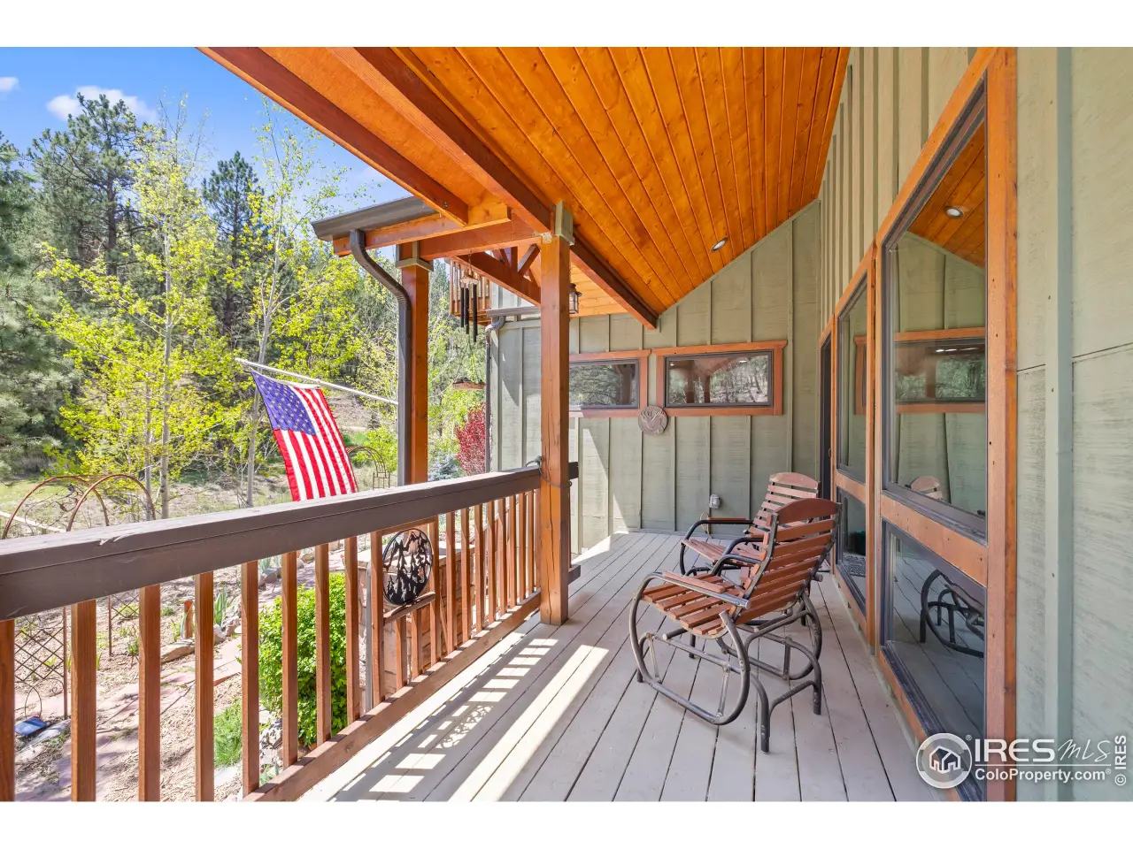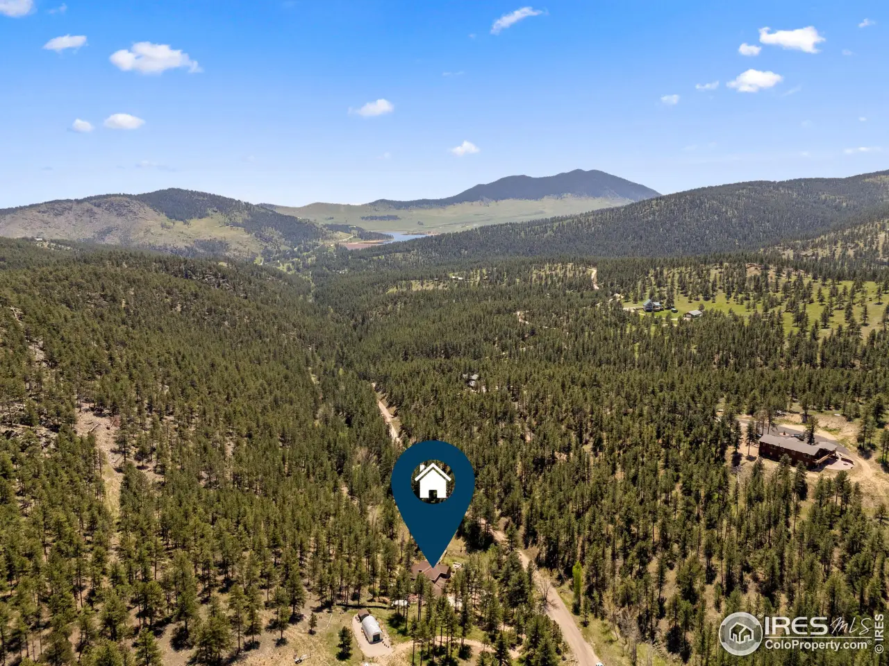 Remarkable custom-built residence nestled on almost 38 acres & within a 450-acre private wildlife conservation easement, offering an extraordinary blend of luxury & natural beauty. The heart of this home features a stunning 2-story great room with a wood stove, adorned with tongue and groove ceiling, creating an impressive architectural statement. The gourmet kitchen showcases high-end appliances & opens to the great room filled with abundant natural light streaming through large windows bringing the forest right into the living room. The spacious primary bedroom suite provides a private balcony retreat, complemented by a luxurious bathroom featuring a walk-in shower, 6-foot soaking tub & water feature. A versatile loft space off the primary bathroom serves perfectly as an office or additional living area. Outdoor living reaches new heights with a wraparound deck, complete with a step-in hot tub surrounded by a serene waterfall & koi pond. There is lovely outdoor space with a separate driveway that can easily accommodate a horse barn, while a charming bridge crosses a seasonal stream, adding to the property's enchanting atmosphere. Additional upgrades include: new boiler heating system, brand new carpet, some new interior paint, a 12 x 16 shed, custom closets, in-floor radiant heat, RV dump station, storage above the garage attic, & an almost 1200sf garage which could fit up to 4 vehicles & all your toys. The home's thoughtful design includes 3 bedrooms, 3 bathrooms, with the option to create a 4th bedroom in the upper floor loft/exercise room. Located near Ramsay-Shockey Open Space & just 20 minutes to the city of Loveland, this property presents possibilities for hosting weddings and events. With only a road association HOA, this sanctuary combines privacy with accessibility, offering a truly distinctive Colorado living experience. Property has been pre-inspected and is in top-notch shape! Recent hail storm in July 2025- Seller will replace roof prior to closing.