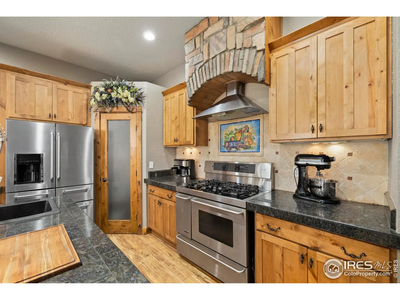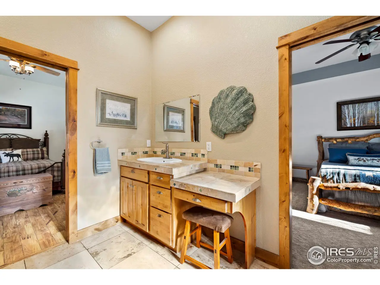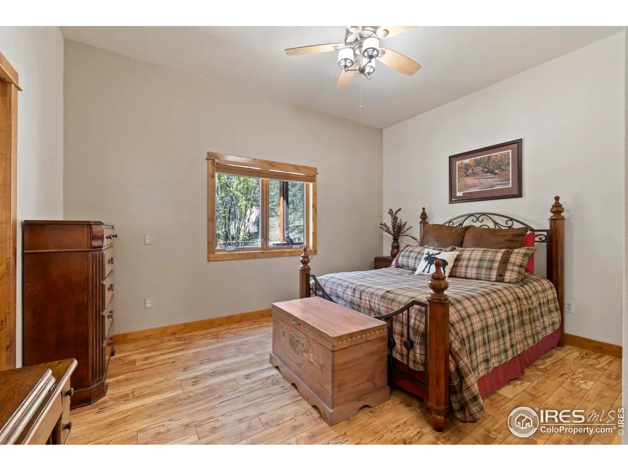 Remarkable custom-built residence nestled on almost 38 acres & within a 450-acre private wildlife conservation easement, offering an extraordinary blend of luxury & natural beauty. The heart of this home features a stunning 2-story great room with a wood stove, adorned with tongue and groove ceiling, creating an impressive architectural statement. The gourmet kitchen showcases high-end appliances & opens to the great room filled with abundant natural light streaming through large windows bringing the forest right into the living room. The spacious primary bedroom suite provides a private balcony retreat, complemented by a luxurious bathroom featuring a walk-in shower, 6-foot soaking tub & water feature. A versatile loft space off the primary bathroom serves perfectly as an office or additional living area. Outdoor living reaches new heights with a wraparound deck, complete with a step-in hot tub surrounded by a serene waterfall & koi pond. There is lovely outdoor space with a separate driveway that can easily accommodate a horse barn, while a charming bridge crosses a seasonal stream, adding to the property's enchanting atmosphere. Additional upgrades include: new boiler heating system, brand new carpet, some new interior paint, a 12 x 16 shed, custom closets, in-floor radiant heat, RV dump station, storage above the garage attic, & an almost 1200sf garage which could fit up to 4 vehicles & all your toys. The home's thoughtful design includes 3 bedrooms, 3 bathrooms, with the option to create a 4th bedroom in the upper floor loft/exercise room. Located near Ramsay-Shockey Open Space & just 20 minutes to the city of Loveland, this property presents possibilities for hosting weddings and events. With only a road association HOA, this sanctuary combines privacy with accessibility, offering a truly distinctive Colorado living experience. Property has been pre-inspected and is in top-notch shape! Recent hail storm in July 2025- Seller will replace roof prior to closing.