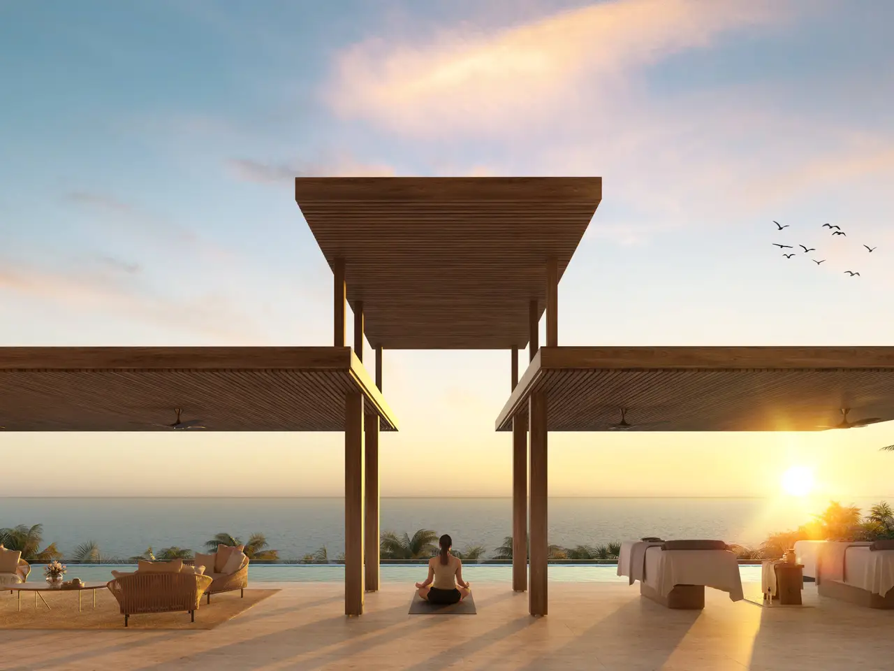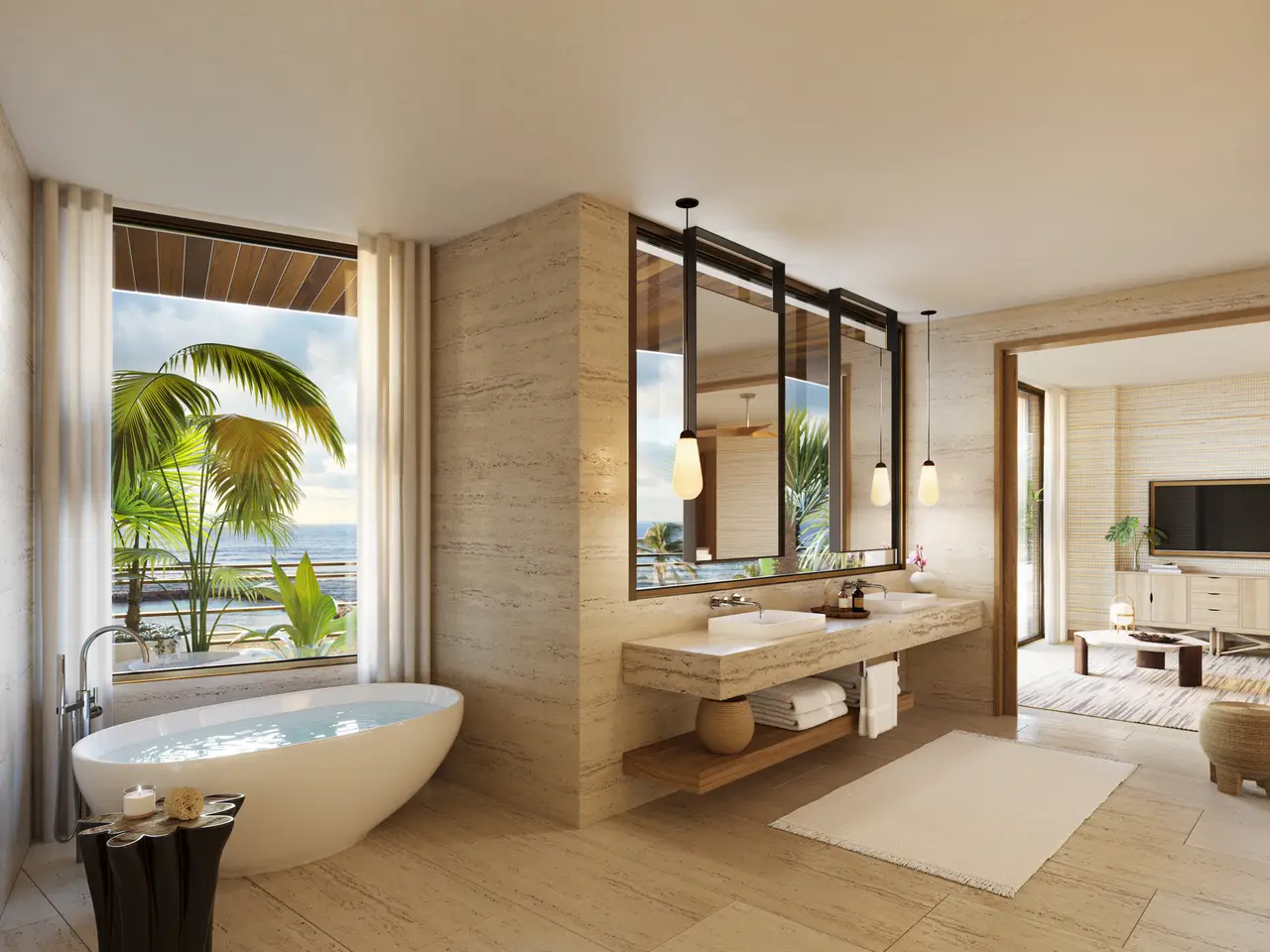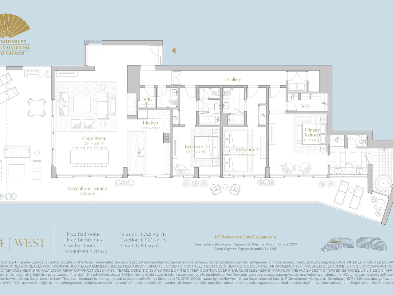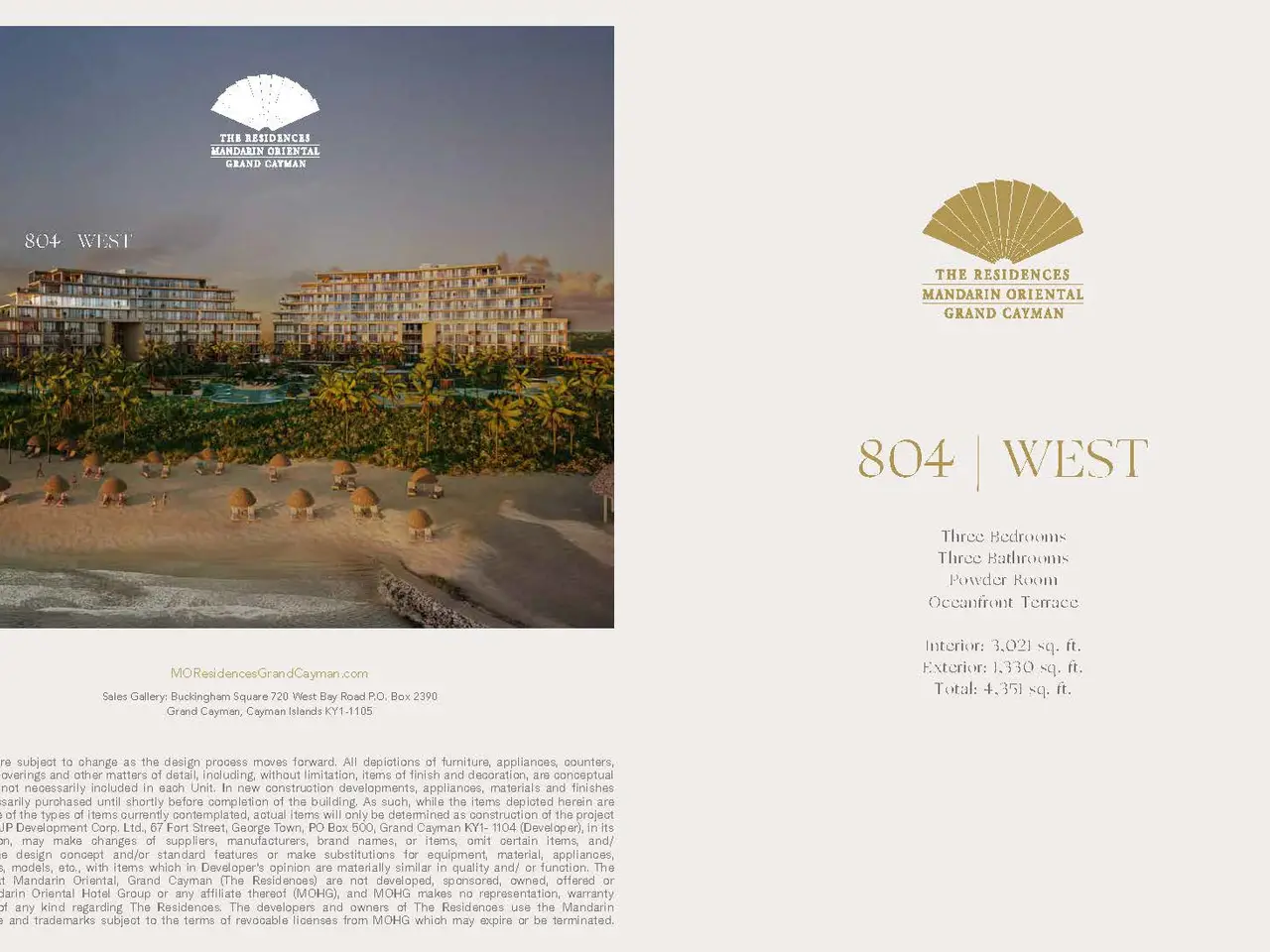 8th floor three-bedroom, three and one-half baths Residence located on the west corner of the West Tower features 3,021 sf of interior living area and 1,330 sf of oceanfront terrace, totaling 4,351 square feet of indoor and outdoor living. The unique lateral floorplan provides direct ocean views from all major rooms. Entry foyer opens onto the glass-cornered great room living and dining areas with wet bar – all with magnificent views across the oceanfront and corner terraces. Elevated ten-foot ceilings frame floor-to ceiling retractable glass opens onto the wrap-around front and corner oceanfront terraces. Gourmet kitchen faces the ocean views and features custom millwork cabinetry, Calacatta countertops and backsplashes with Wolf, Sub-Zero and Gaggenau appliances. All three bedrooms are accessed from a connecting art gallery. The primary bedroom suite has a 5-fixture bathroom with large, windowed circular soaking tub and shower room. Second and third bedrooms offer ocean views and ensuite bathrooms. Baths are appointed in a selection of natural stones including Travertine and Clef Cut Limestone.Seven-inch-wide Grey Oak flooring is hand-laid throughout the interior, seamlessly integrating with the Grey Wood Plank Porcelain tiling the outdoor terrace. Large corner oceanfront terrace and grilling area is great for enjoying Cayman's glorious sunsets and for outdoor dining and entertaining.