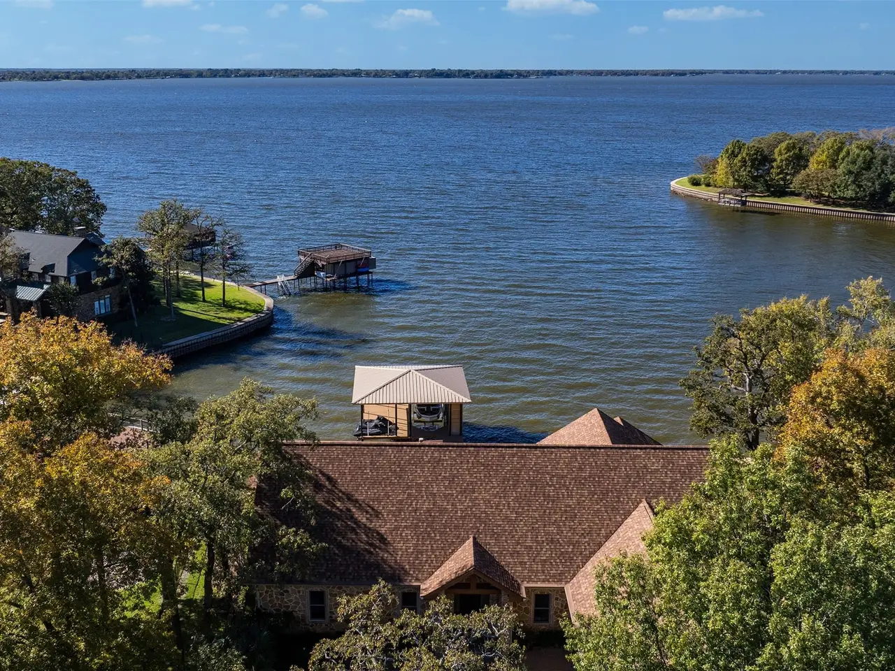 **Luxurious Lakefront Living at Pinnacle Golf Club** Welcome to your dream home at Pinnacle Golf Club, the premier golf club community on the shores of Cedar Creek Lake-- this breathtaking 4-bedroom, 3.1-bathroom retreat impeccably blends modern design with unparalleled comfort. Constructed with a durable steel frame, this home is a testament to quality and endurance. The heart of the home features an inviting open living concept where the living room, kitchen, and dining space seamlessly unite, all framed by the serene backdrop of the lake. The primary bedroom, adjoining this main gathering area, offers a tranquil sanctuary overlooking the water. The three car garage offers a unique elevator that provides access to tons of attic storage, with possibilities to be finished for additional space. A see-through fireplace connects the main living area to a second living space configured as a game room complete with a full bar. Three additional bedrooms, including darling custom modern bunk room, branch off from the game room. The screen porch extends the home's living space outdoors and the patio has a retractable awning and cozy outdoor fire pit overlooking the cove, ideal for swimming. Boating enthusiasts will revel in the newly constructed boathouse, completed in early 2024, perfectly positioned for easy and direct access to the water, which is as pretty as it is functional with wood ceiling, recessed lighting and full spider control system, metal roof, and two PWC lifts. Come see for yourself and make this extraordinary property your forever home. Ask agent for more info! One year social membership to Pinnacle Club included with purchase. Buyer responsible for HOA fee of .002% of sales price at closing. Club offers restaurant and clubhouse, access to our 24 hour fitness center, enjoyment of the junior Olympic size swimming pool, use of the tennis courts, and attendance to a wide variety of special member events.
