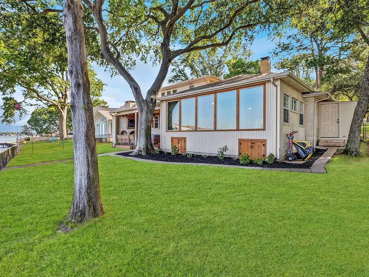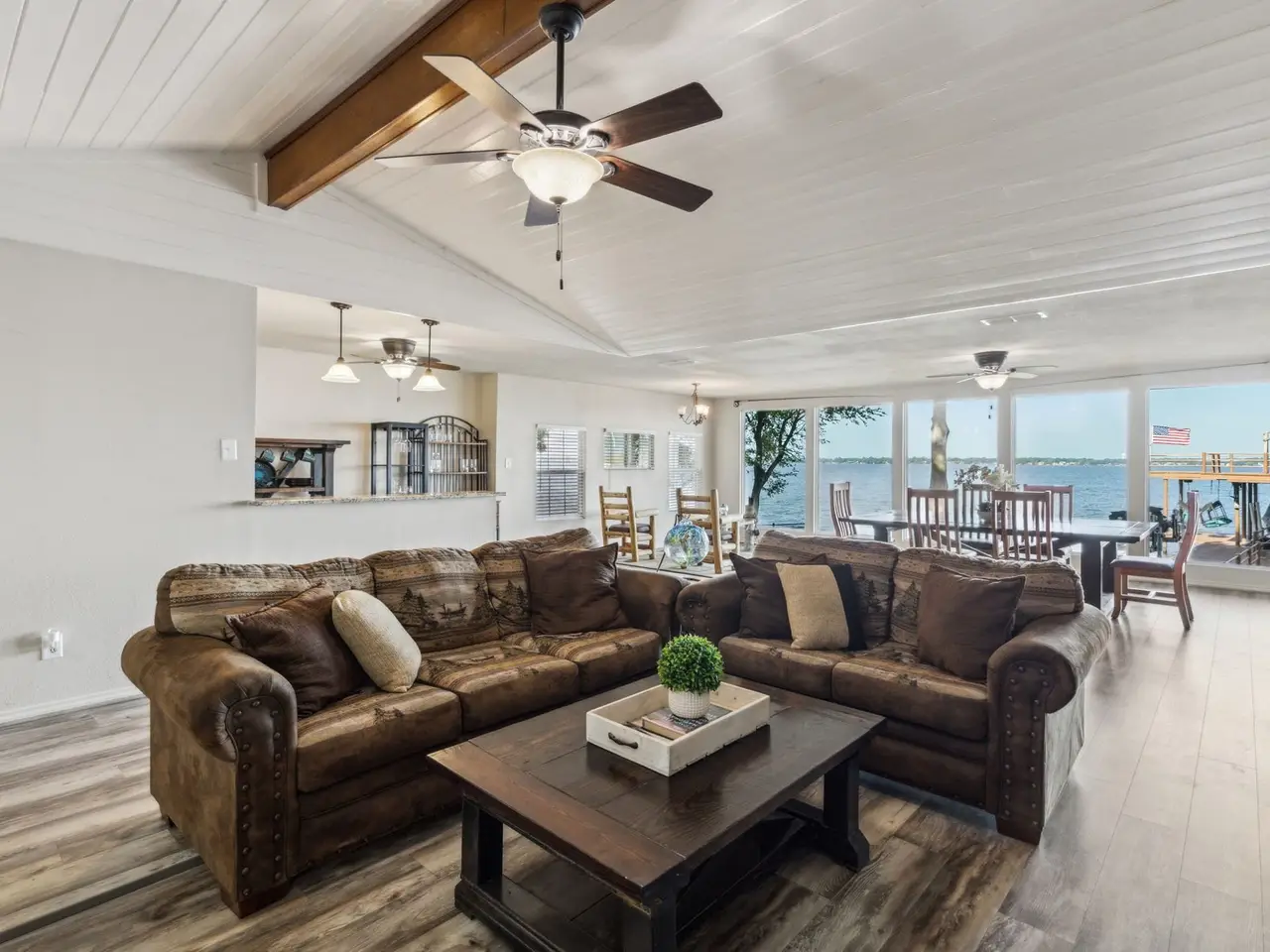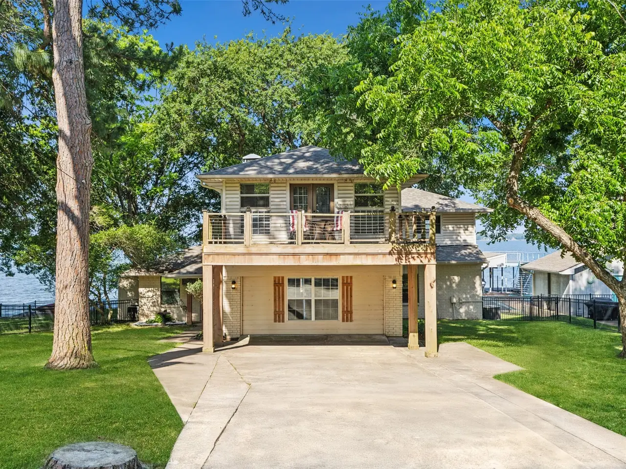 Great location with deep water! This stunning lakeside home offers picturesque sunsets over open water, best enjoyed from the recently updated dock or the spacious covered patio. The dock features an upper deck with storage for a boat and two jet skis, along with easy water access via stairs leading directly from the deck, making it perfect for swimming, boating, and other water activities. Inside, large windows provide breathtaking views and fill the home with natural light. Recent updates include new flooring and a primary suite with direct access to the roof deck, offering a private spot to relax. Three additional bedrooms and bathrooms for guest. Possibility for a 5th bedroom currently setup as a second living room with double murphy beds. Currently setup to sleep 14, this property is ideal as a permanent residence, a weekend getaway, or a smart investment. The gated yard provides privacy, while two covered parking spots add convenience. Located with easy access to dining along the lake, this home combines comfort, style, and the best of waterfront living. HOA provides community boat ramp and park for private use.