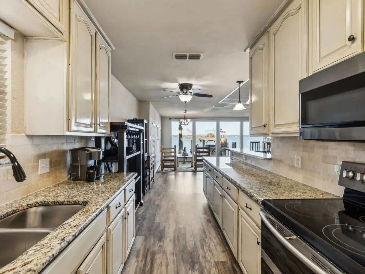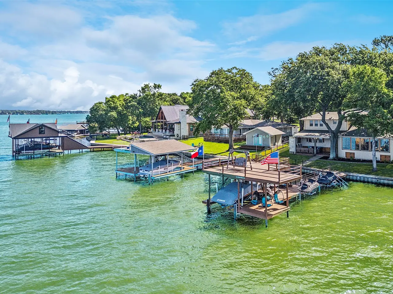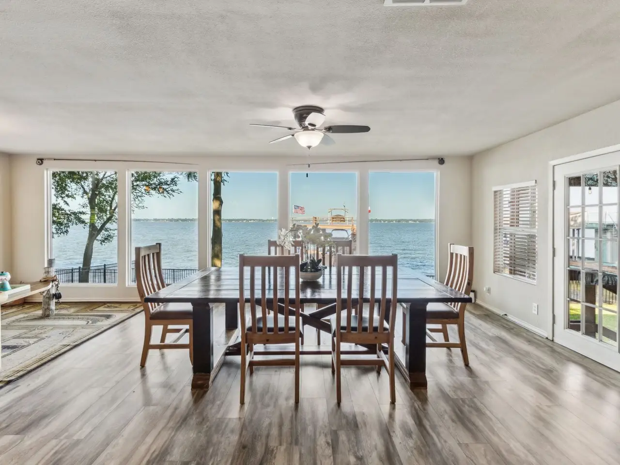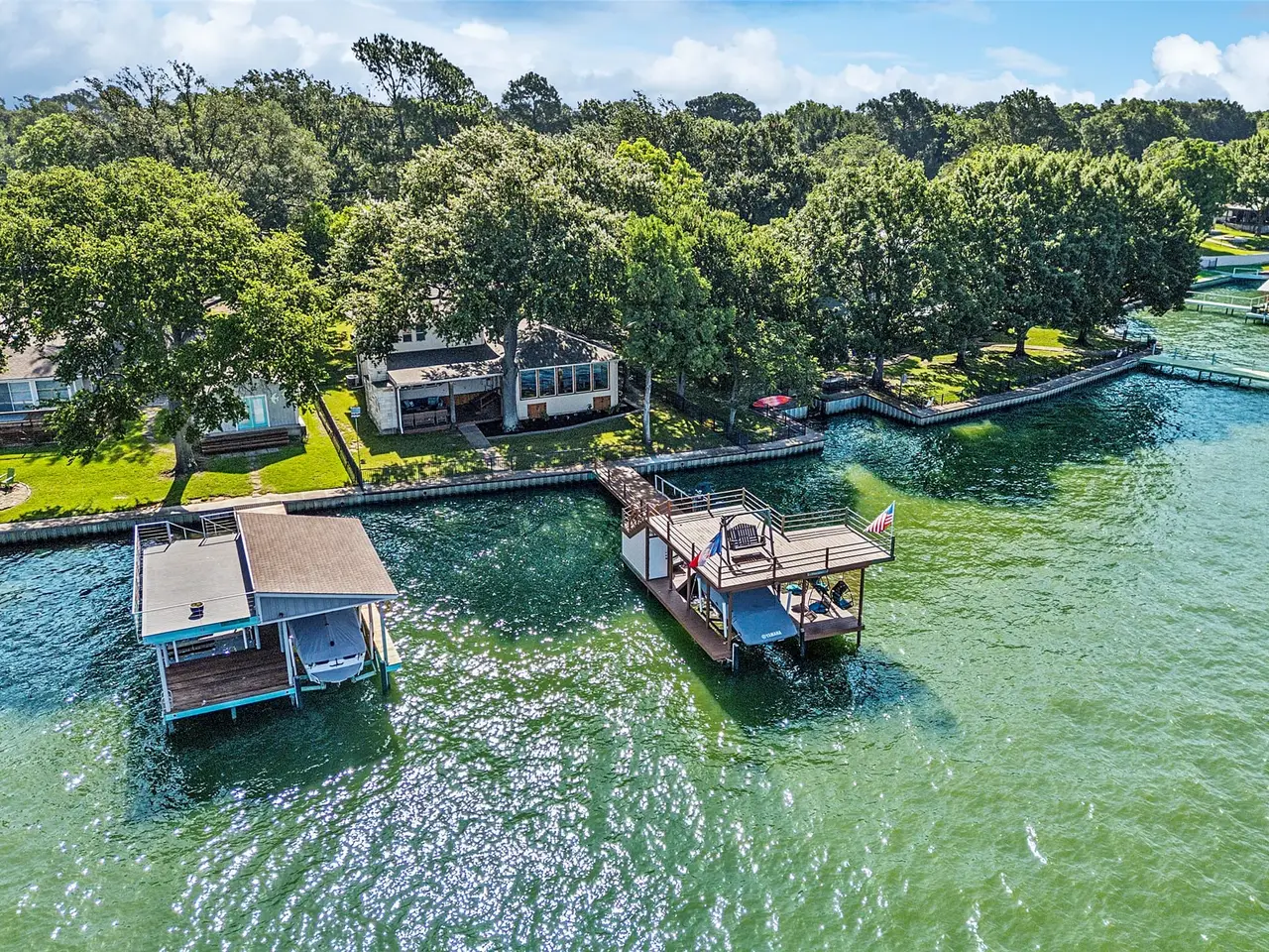 Great location with deep water! This stunning lakeside home offers picturesque sunsets over open water, best enjoyed from the recently updated dock or the spacious covered patio. The dock features an upper deck with storage for a boat and two jet skis, along with easy water access via stairs leading directly from the deck, making it perfect for swimming, boating, and other water activities. Inside, large windows provide breathtaking views and fill the home with natural light. Recent updates include new flooring and a primary suite with direct access to the roof deck, offering a private spot to relax. Three additional bedrooms and bathrooms for guest. Possibility for a 5th bedroom currently setup as a second living room with double murphy beds. Currently setup to sleep 14, this property is ideal as a permanent residence, a weekend getaway, or a smart investment. The gated yard provides privacy, while two covered parking spots add convenience. Located with easy access to dining along the lake, this home combines comfort, style, and the best of waterfront living. HOA provides community boat ramp and park for private use.