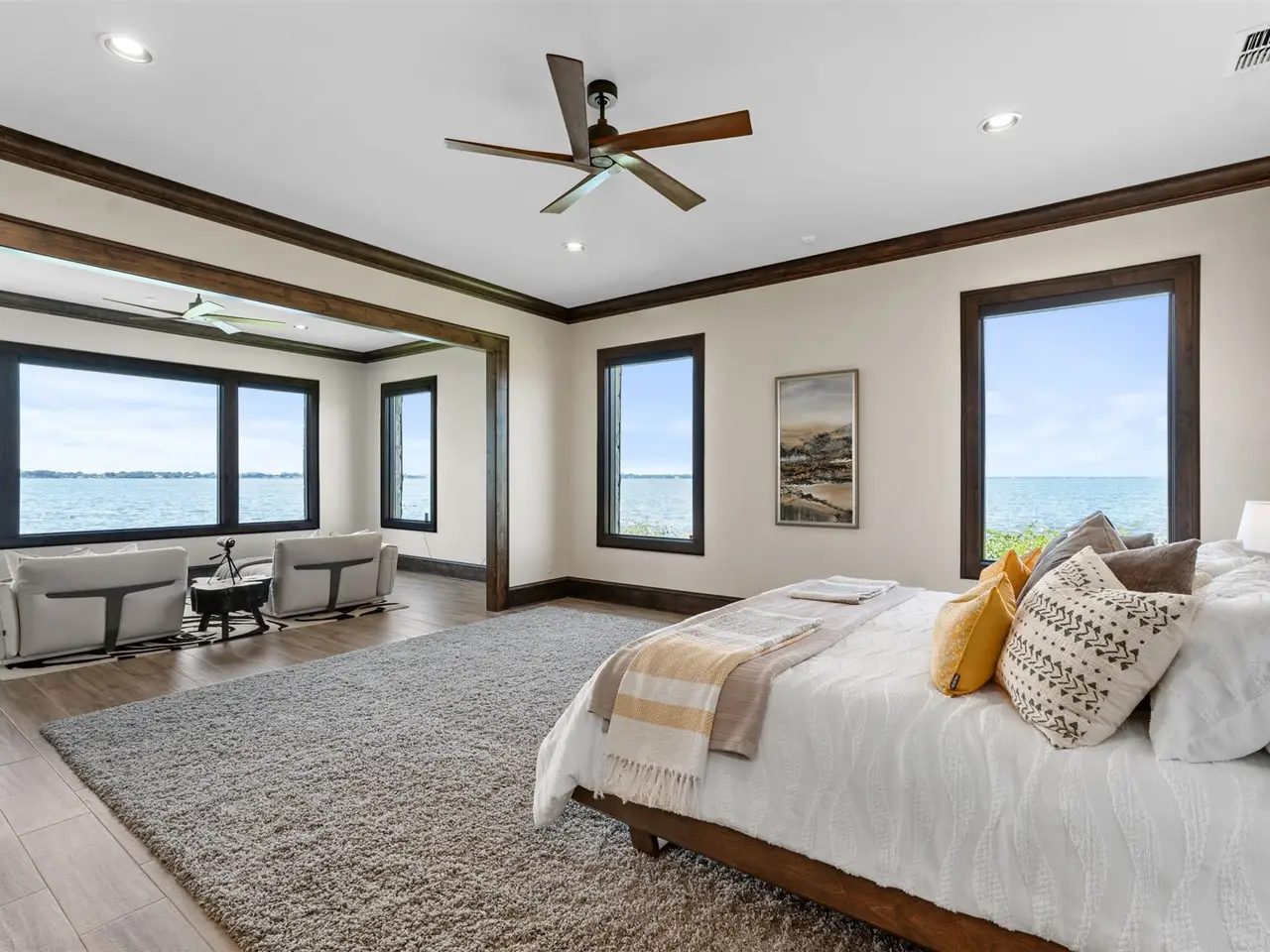 This is the benchmark by which all other Cedar Creek Lake homes are measured - contemporary in design with thoughtful use of space for every activity: five bedrooms, six baths - lake views from every room, a large primary bedroom with waterside sitting area, his and hers primary bathrooms, guest bedrooms with ensuites and enclosed waterside access, divided living area with two-sided fireplace, chef's kitchen with elegant, intimate dining, a game room, an exercise room, waterside lounging and recreation area with fireplace, completely wired for sight and sound, with a full-house 35K emergency generator, two tankless water heaters, three-zoned air conditioning, a saferoom, three-car garage with golf cart door, tri-level boat house with three lifts, water and electricity, and wired for electric gate - oh yeah, and over 350 wide open waterfront feet!